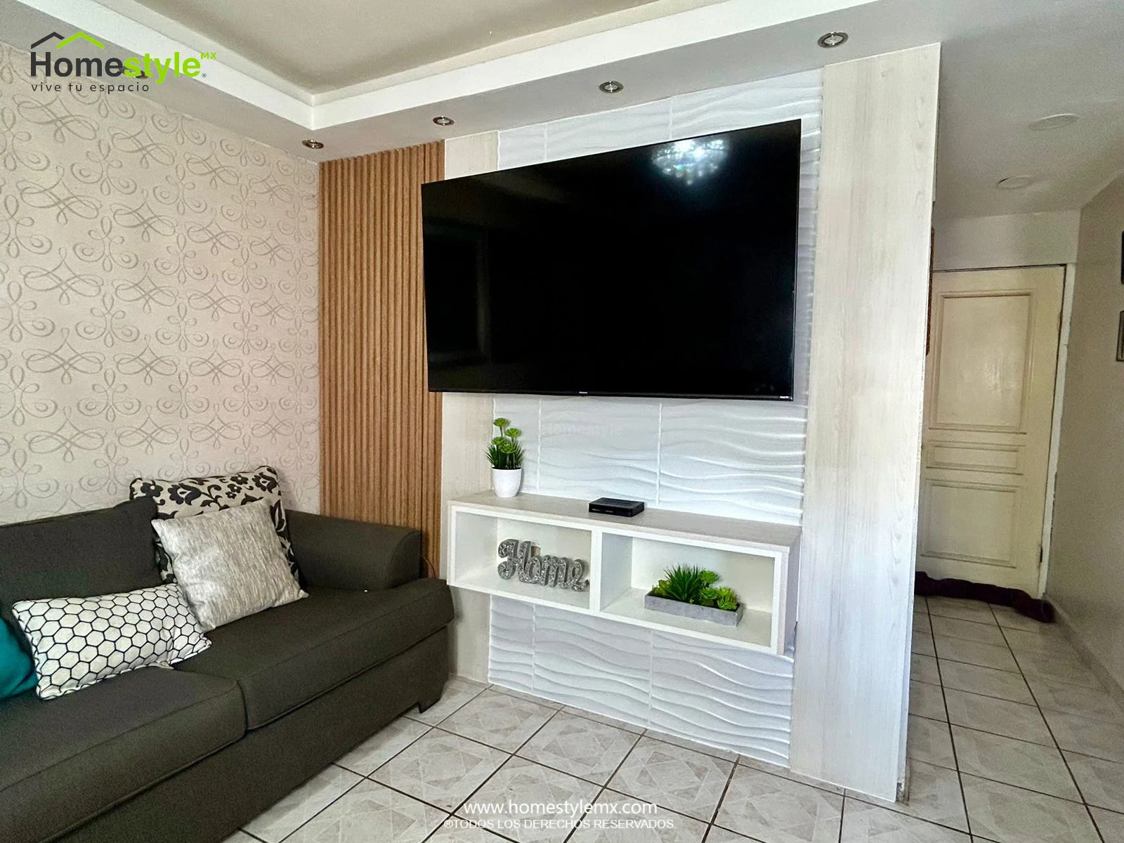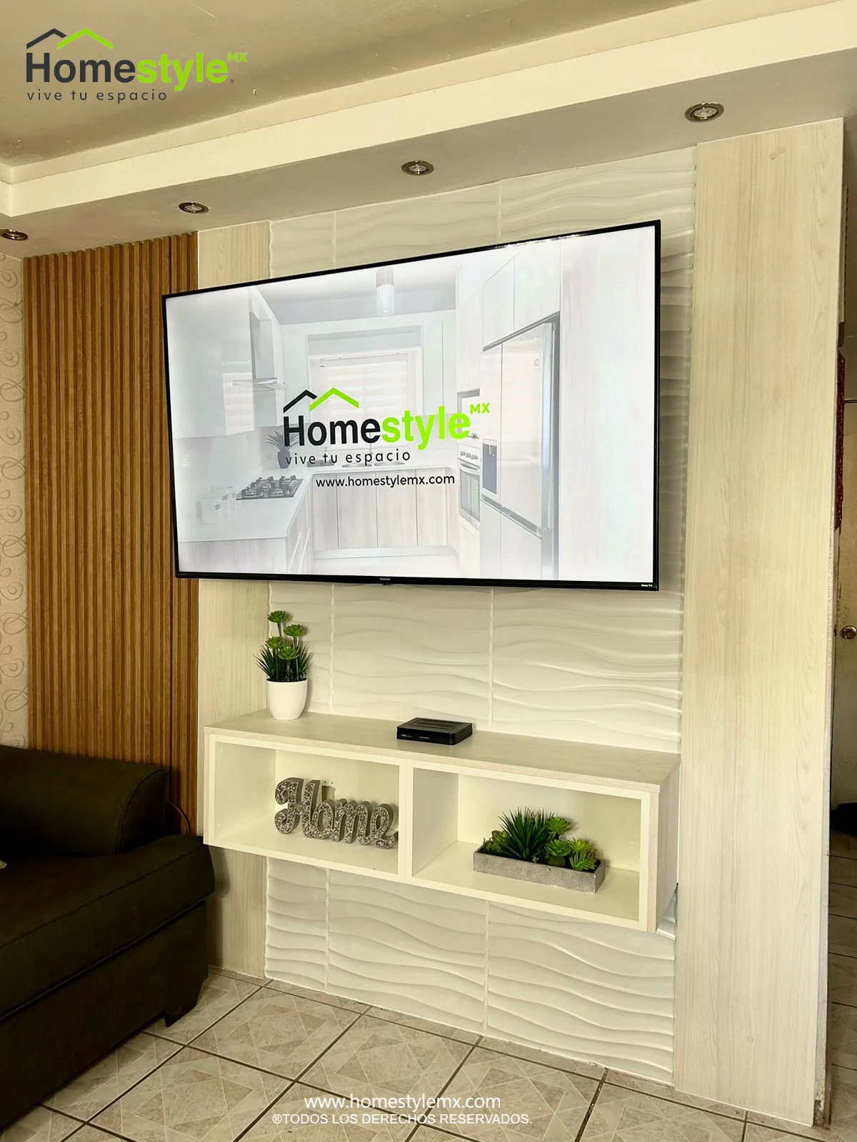Centro de televisión en forma de lineal. Diseñada en Melamina Blanca para la gabinetería, Melamina Vesto Teka Artico para columnas laterales, panel decorativo 3D en la parte posterior de la televisión y detalle con Lambrin Cedro.