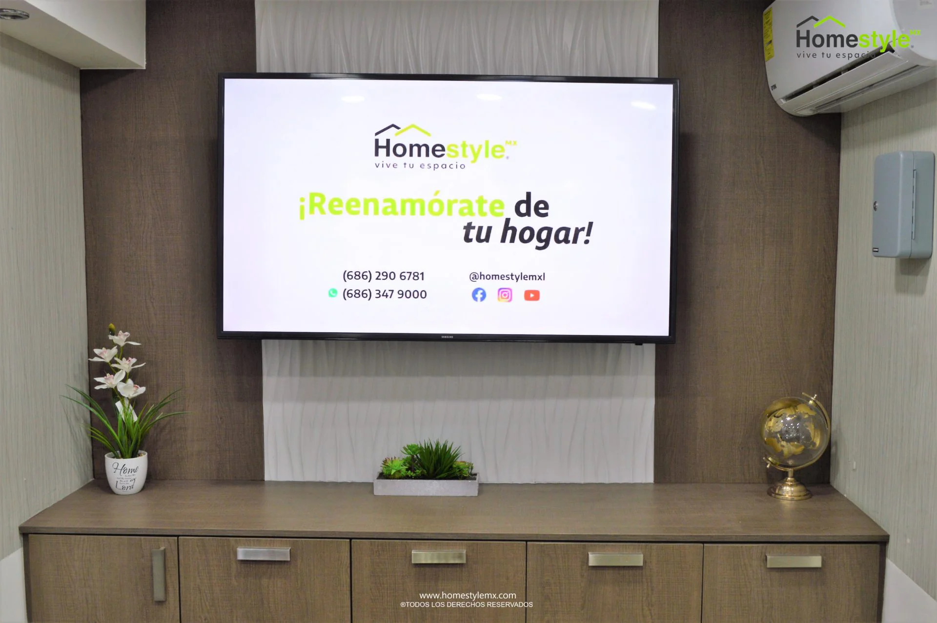 Centro de TV en forma lineal, con amplio almacenamiento y gran altura para aprovechar todo el espacio. Diseñado en Melamina Aserrado Nórdico para la gabinetería y panel 3D decorativo detrás de la televisión.