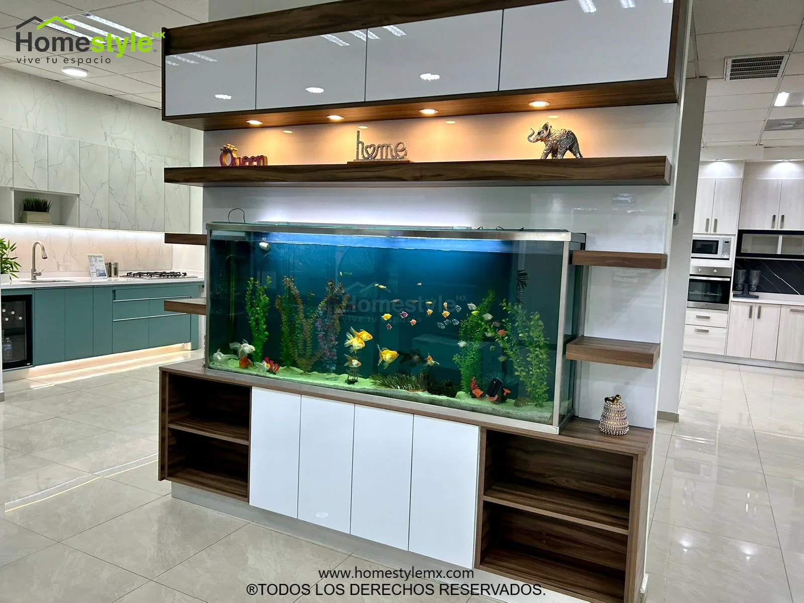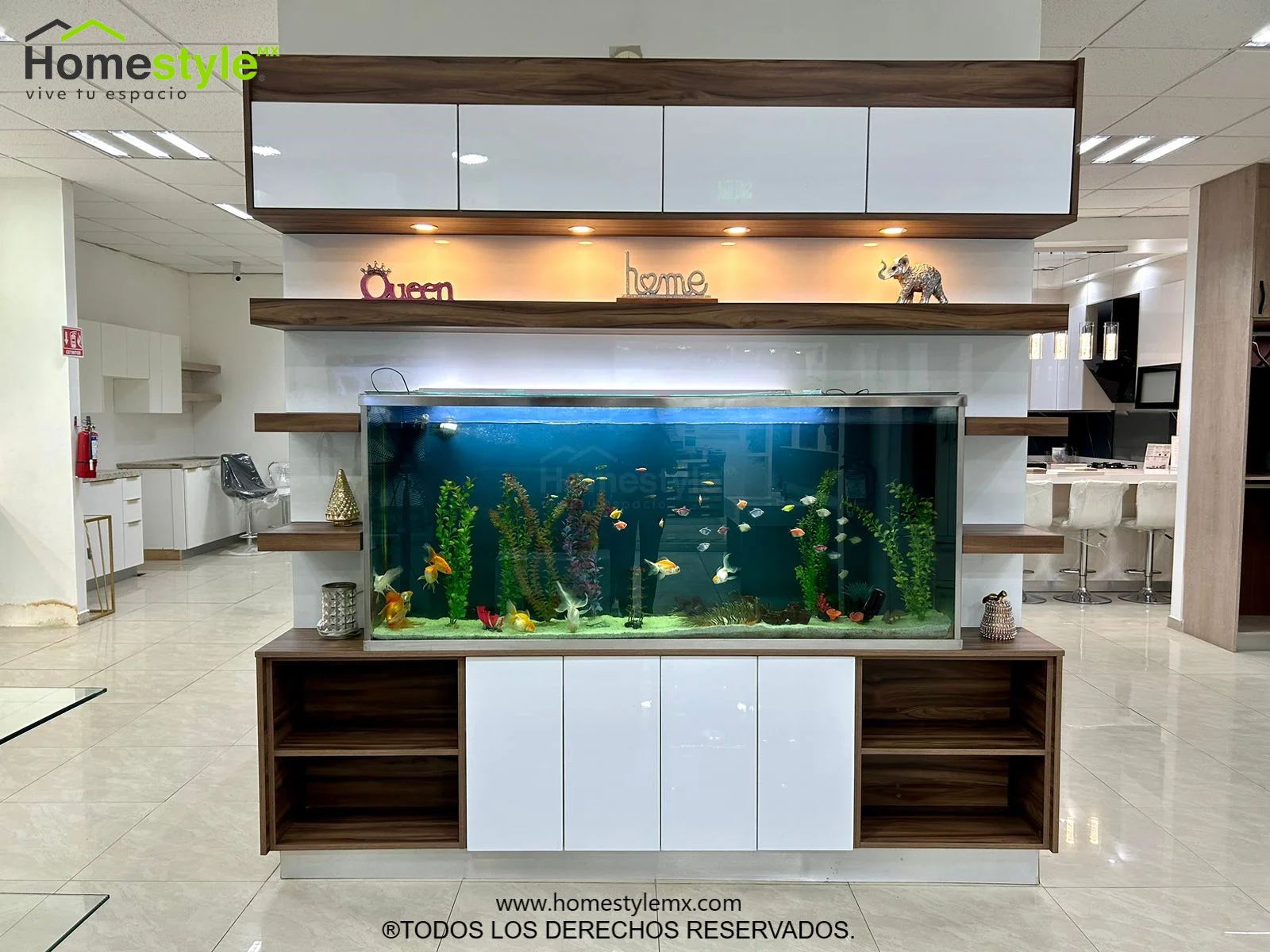 Hermoso y funcional Centro de TV utilizado para exhibidor de pecera. Diseñado en Melamina Vesto Nogal Terracota para gabinetería y MDF Alto Brillo Blanco para puertas. Con iluminación incluida.
