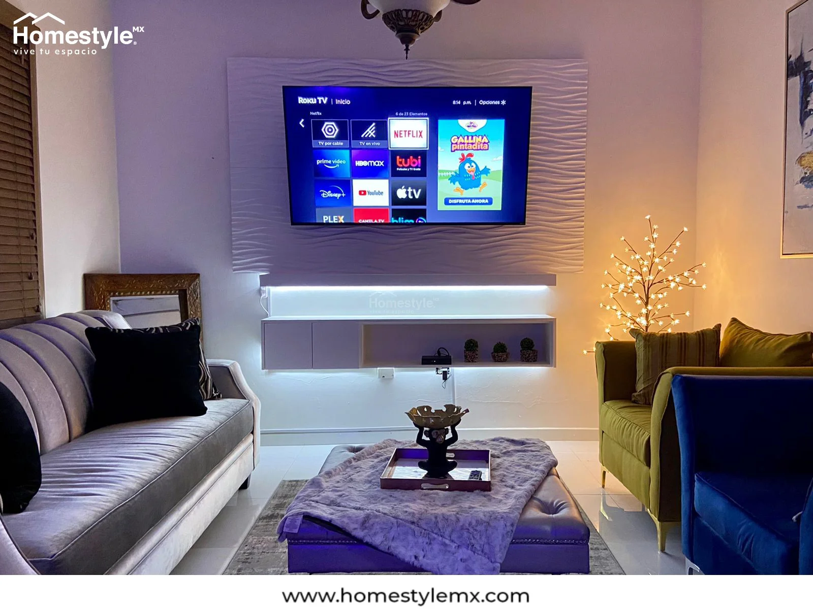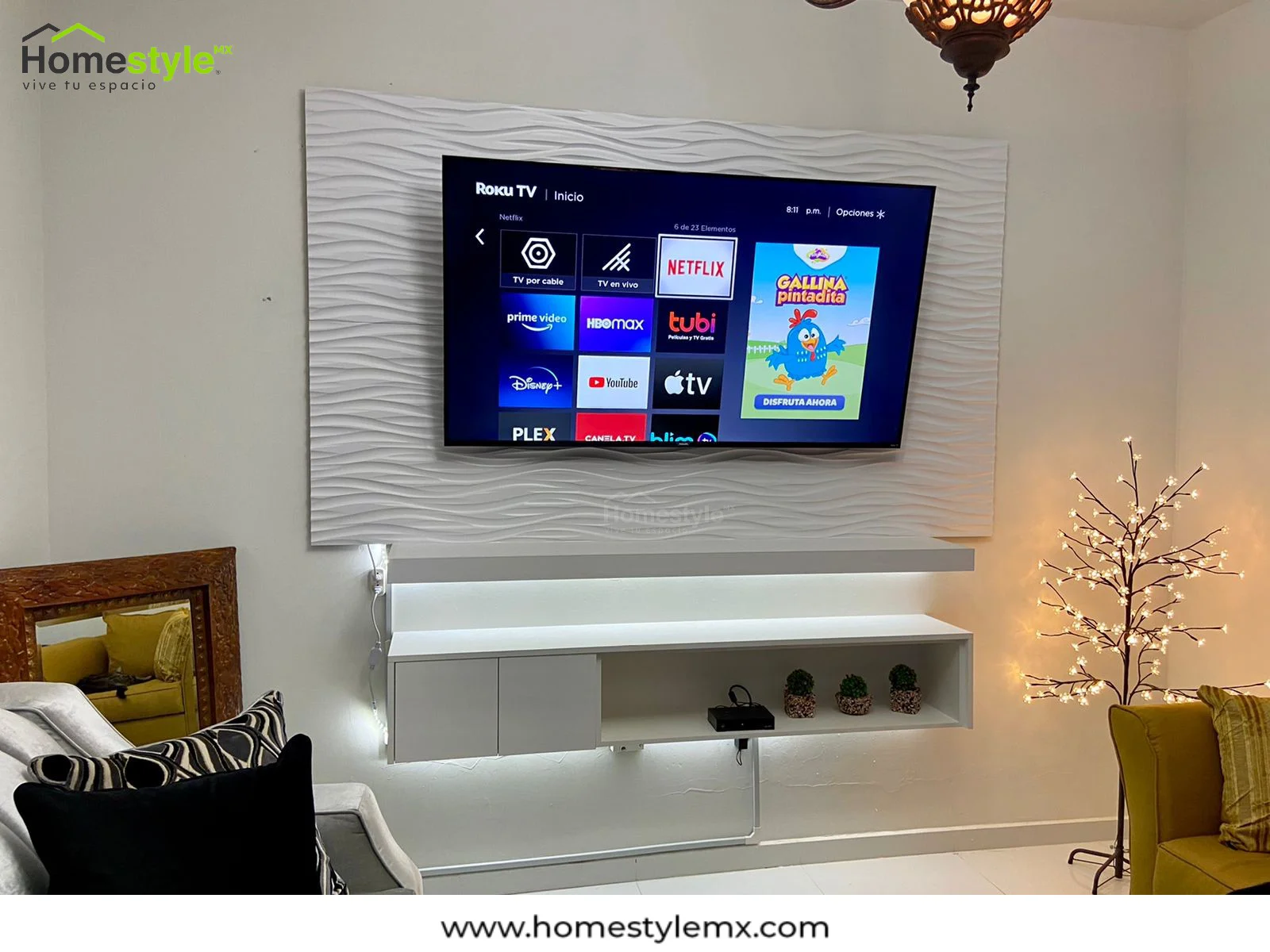 Centro de televisión diseñado en melamina Vesto Blanco Mate y panel 3D. Con luces led para una mayor vista y elegancia.