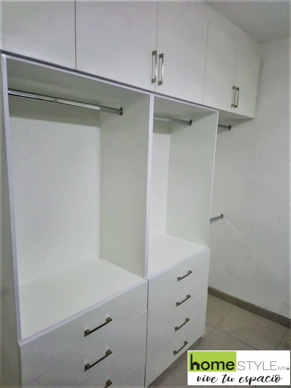 Clóset en forma de lineal con diseño en melamina blanco mate y acabados en detalles de acero inoxidable. Un closet bastante amplio y espacioso para un buen almacenamiento.