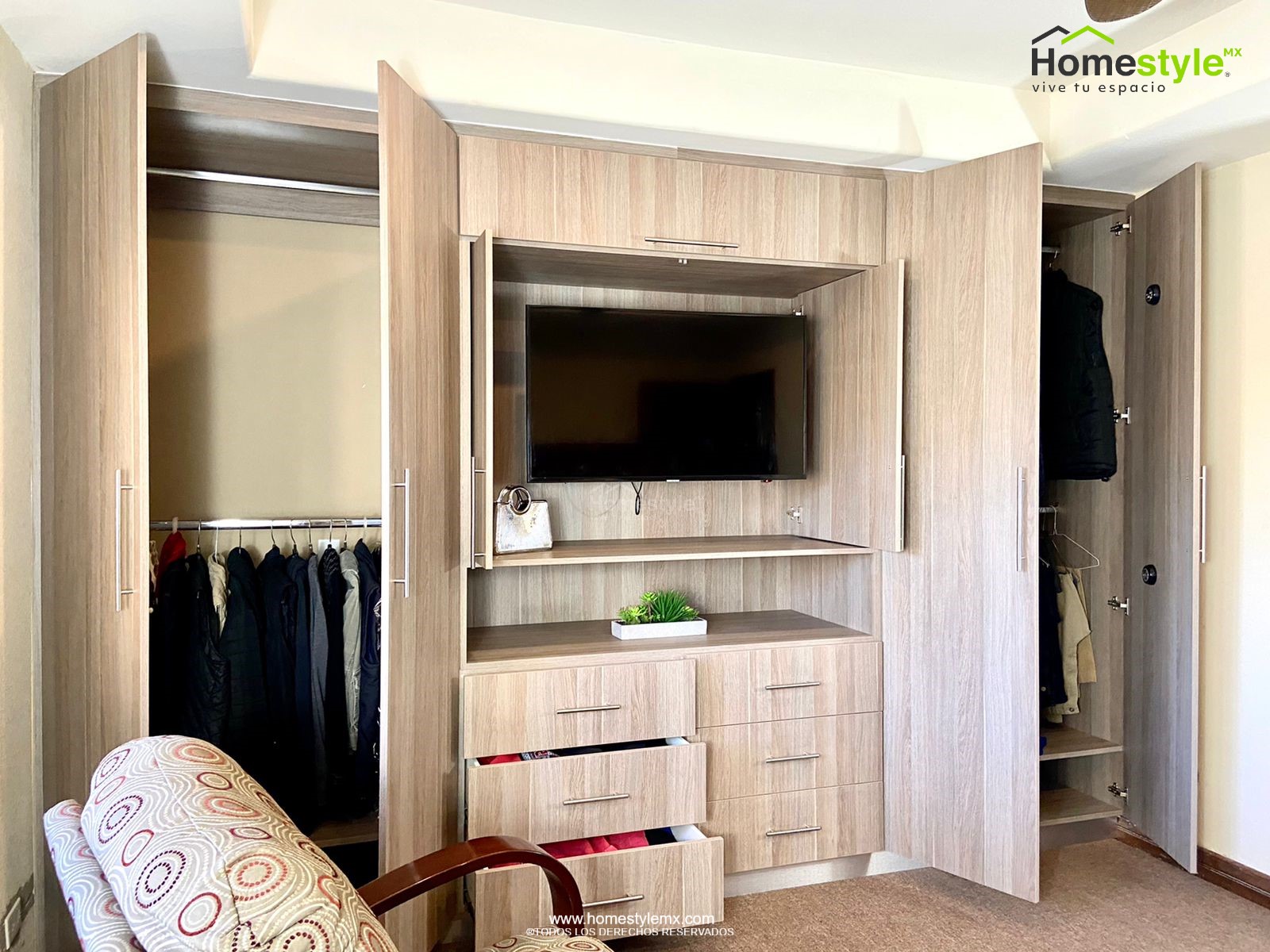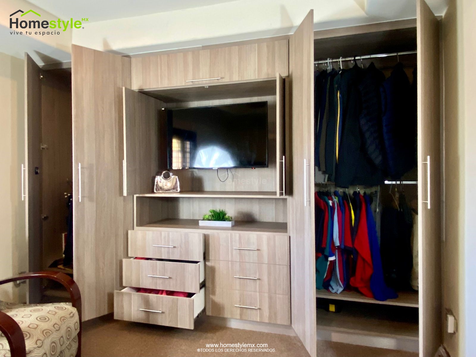 Closet y mueble de televisión en forma de lineal, diseñado en Melamina Vesto Cendra escandinavo para toda la gabinetería.