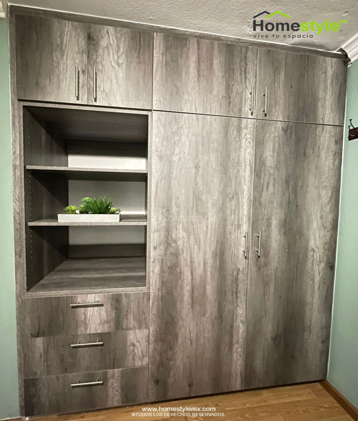 Closet en forma lineal, con amplio almacenamiento y gran altura para aprovechar todo el espacio. Diseñado en Melamina Vesto Lombardía para toda la gabinetería.