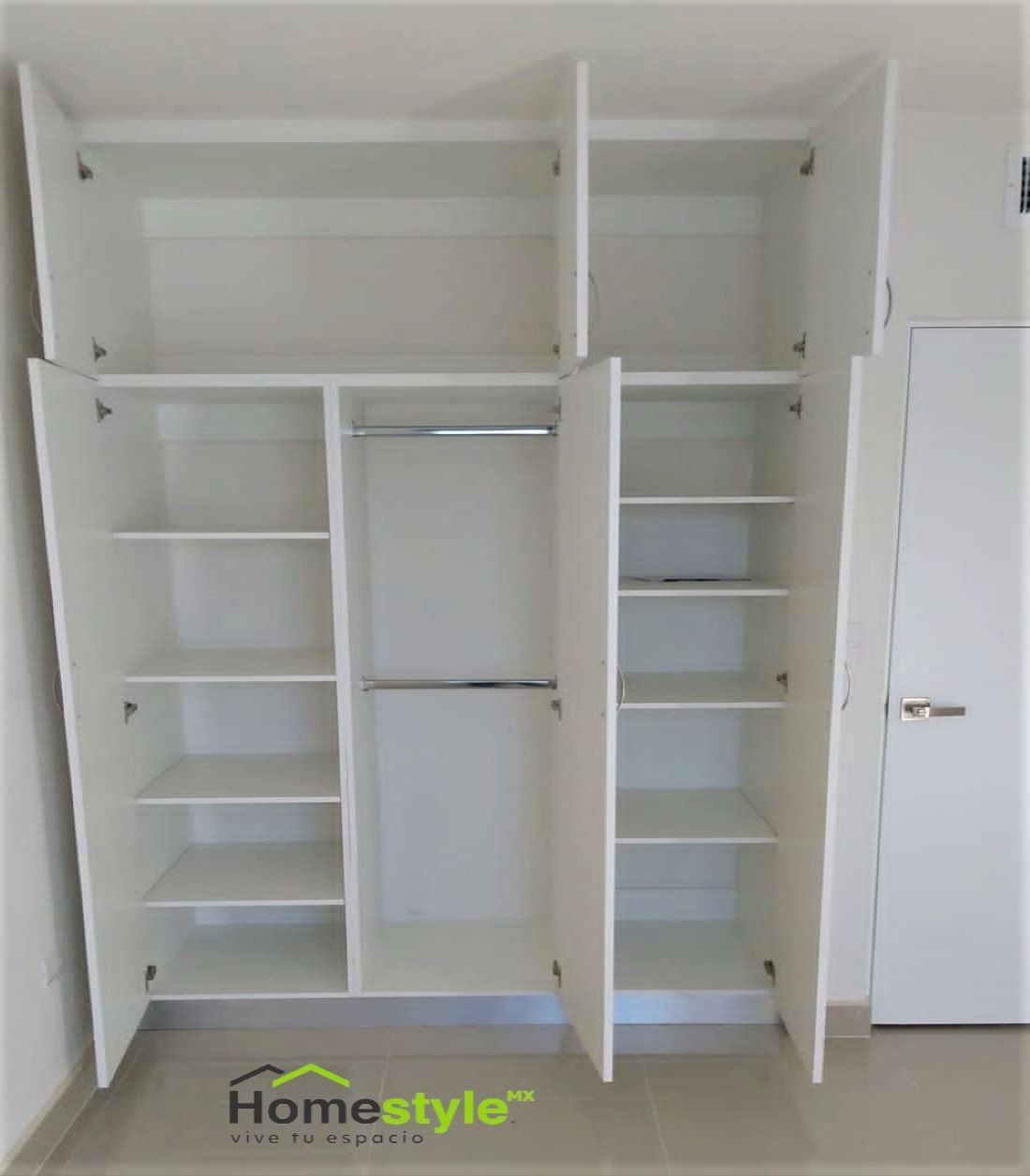 Closet en forma lineal con dimensiones estrechas pero gran altura para aprovechar el espacio. Diseñado en melamina blanca mate.
