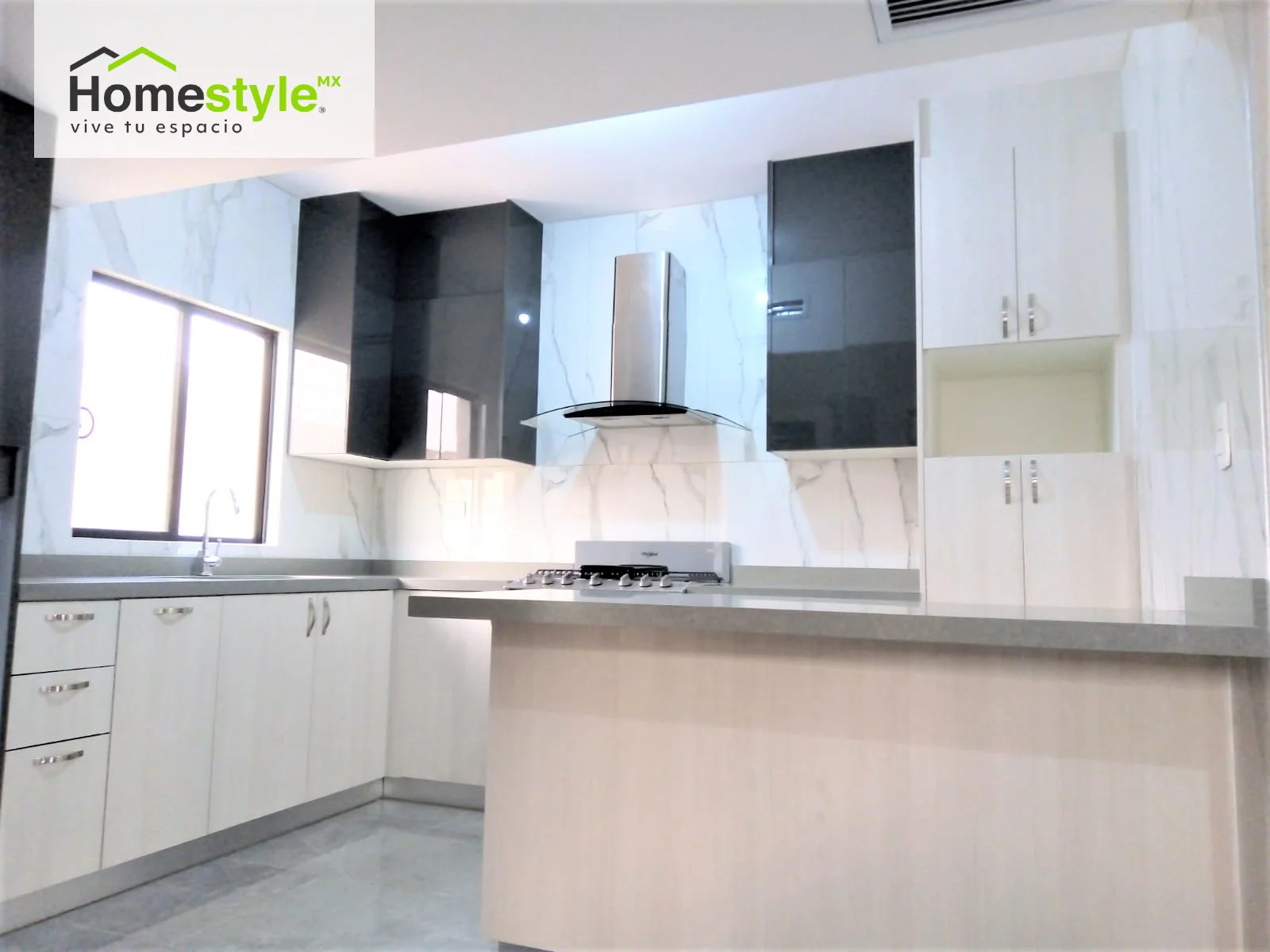 Cocina en forma de L con barra-comedor. Diseñada en melamina Vesto Teka Artico para gabinetes inferiores y MDF alto brillo negro para gabinetería superior.