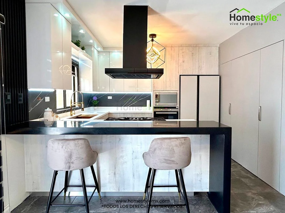 Cocina en forma de J con barra diseñada en Melamina Alaska para la gabinetería inferior, MDF Alto Brillo Blanco en gabinetes superiores, Melamina Vizcaya para Backsplash.