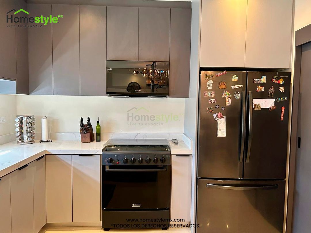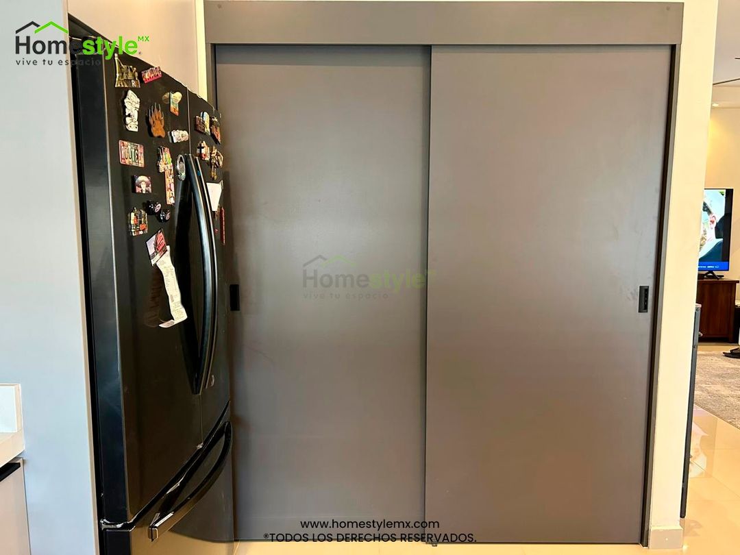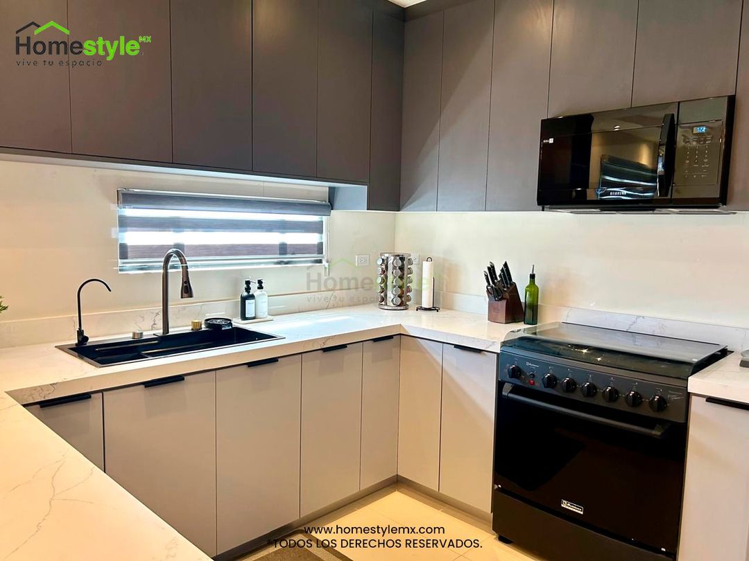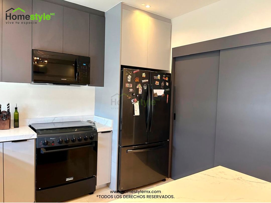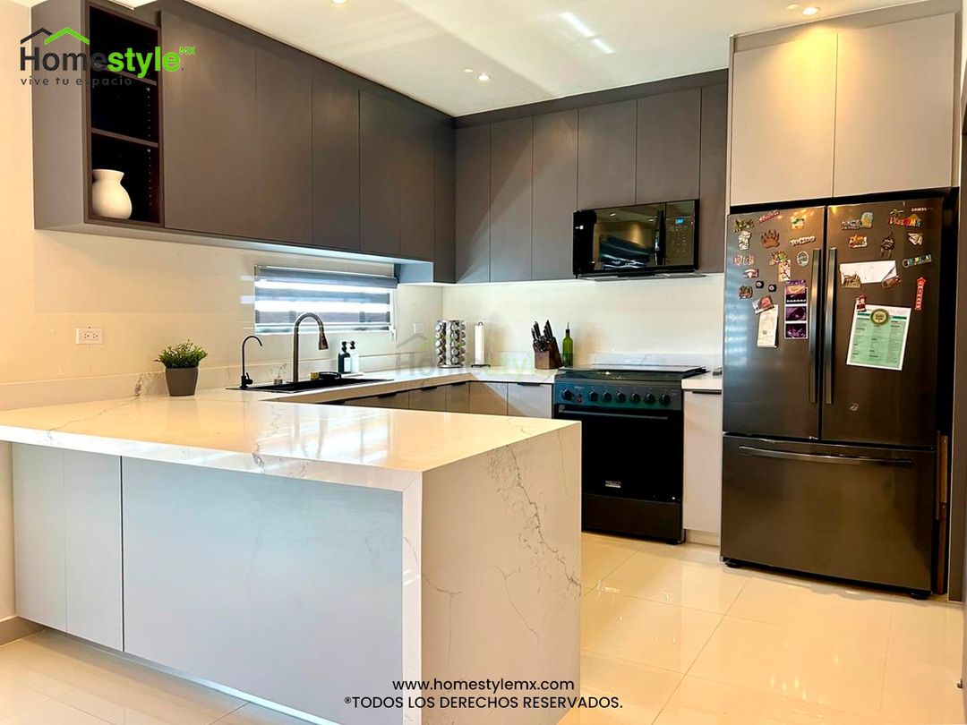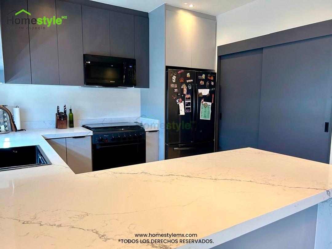 Cocina en forma de L. Con barra Diseñada en Melamina Gris Humo para gabinetes inferiores y Melamina Oxford en gabinetes superiores. Jaladeras inferiores planas de color negro y push to open en puertas superiores. Incluye puertas corredizas en área de lavado en Melamina Oxford.