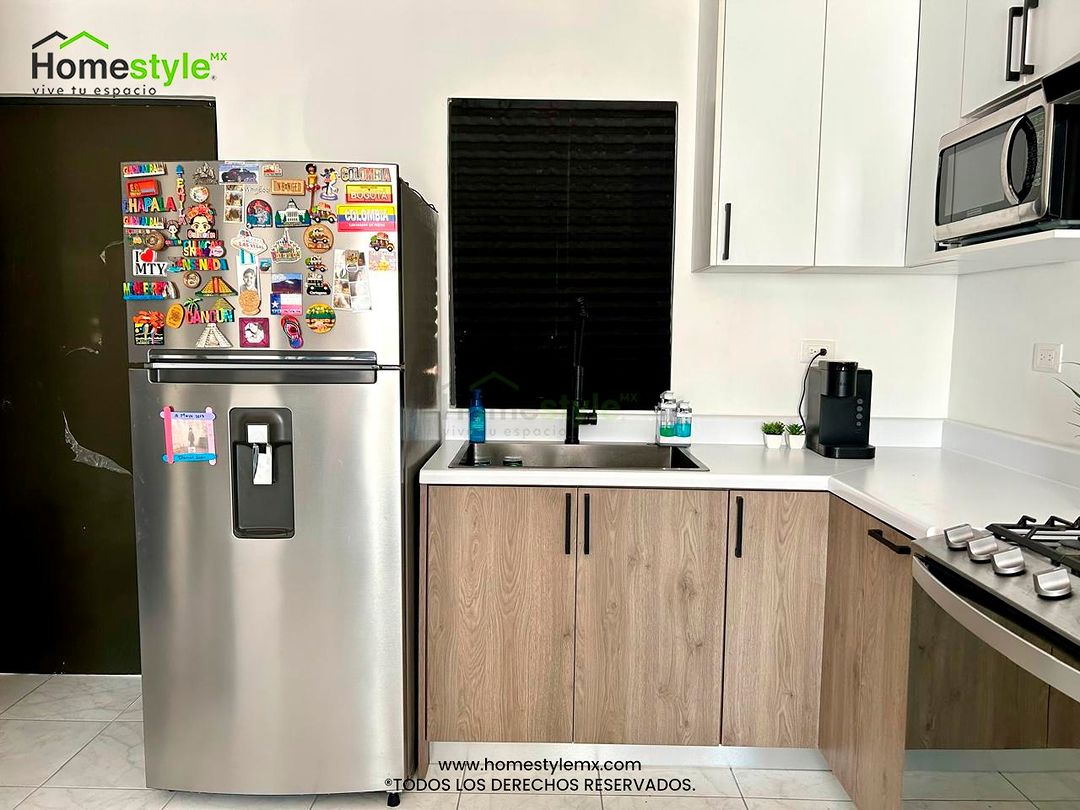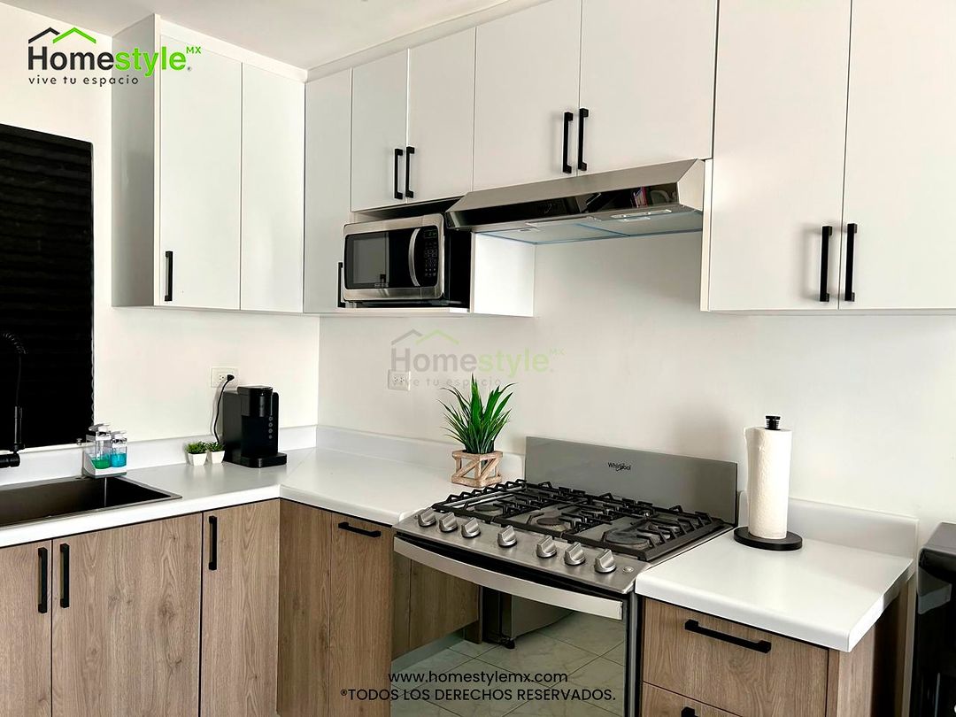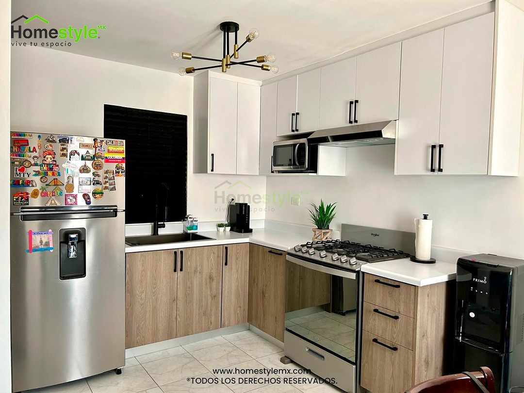 Cocina en forma de L diseñada en Melamina Fresno Bruma para gabinetes inferiores y Melamina Blanca para gabinetería superior. Con una cubierta de Formaica Designer White.