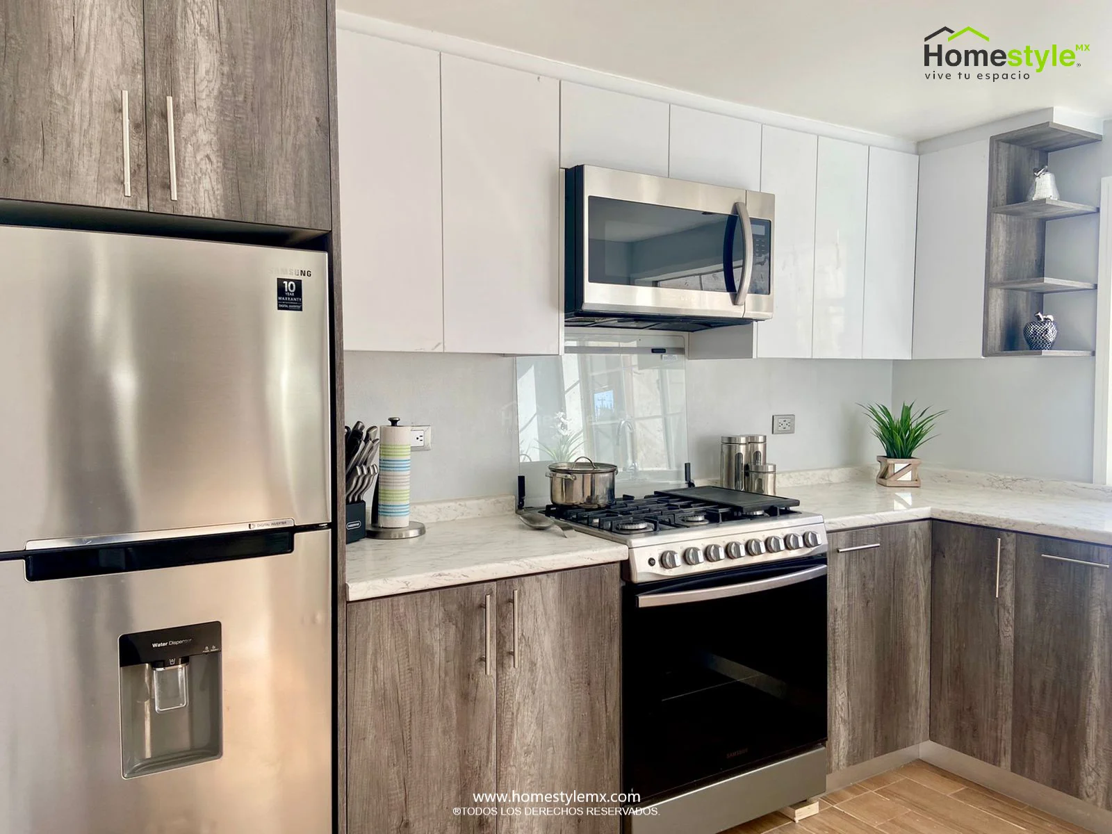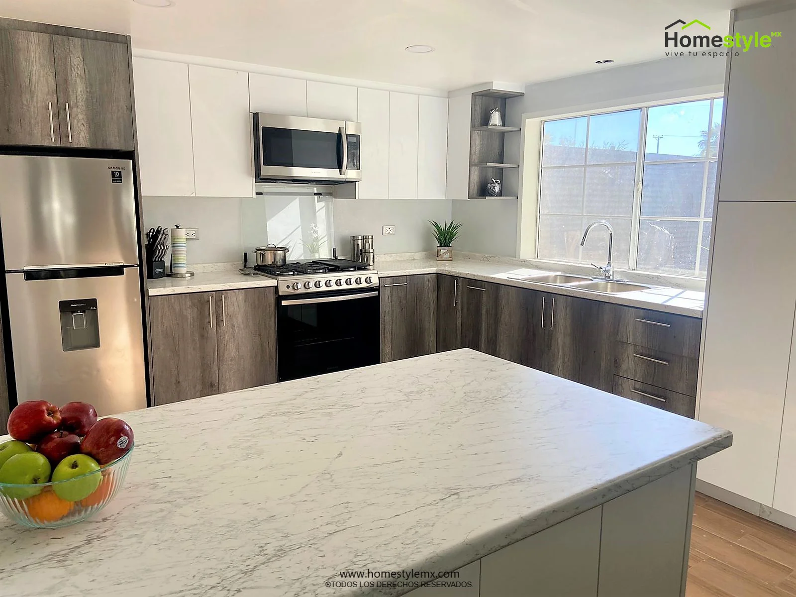 Cocina en forma de L con barra, diseñada en Melamina Vesto Lombardía para los gabinetes inferiores y MDF Alto Brillo Blanco para gabinetes superiores. Cubierta de Formaica Carrara Venato.