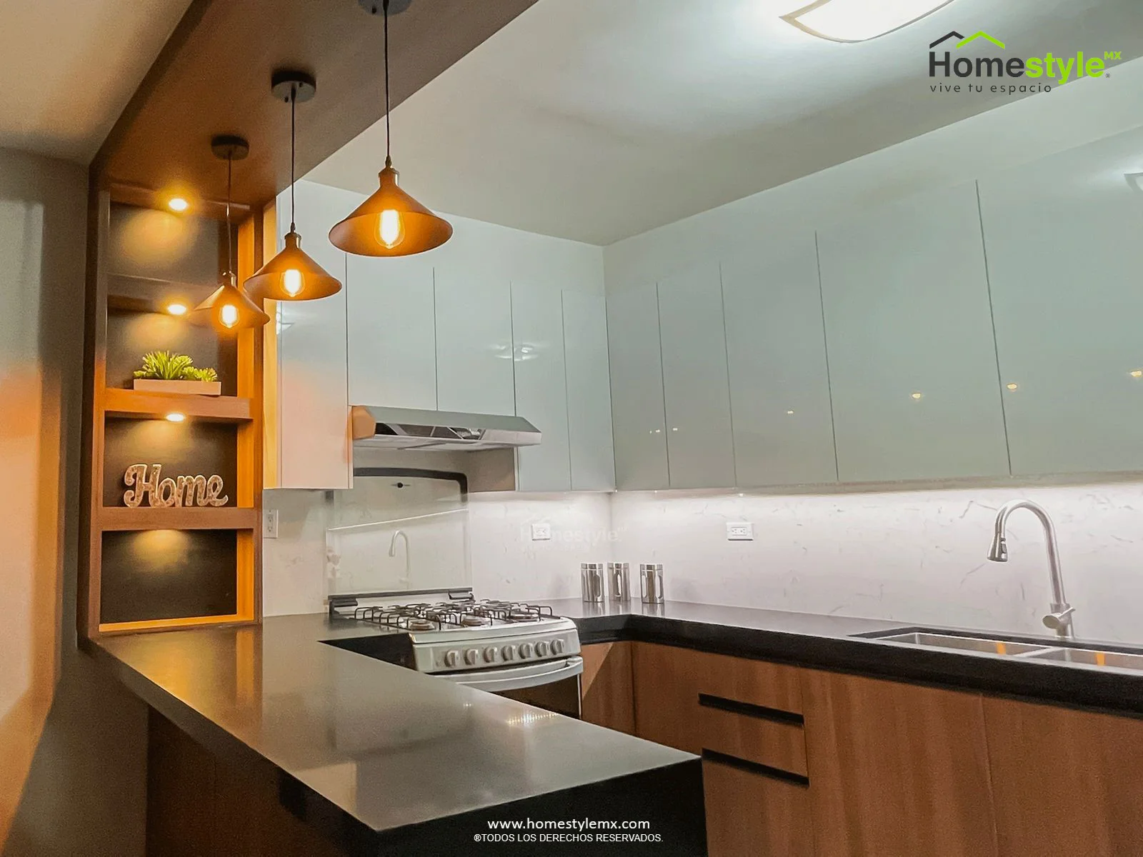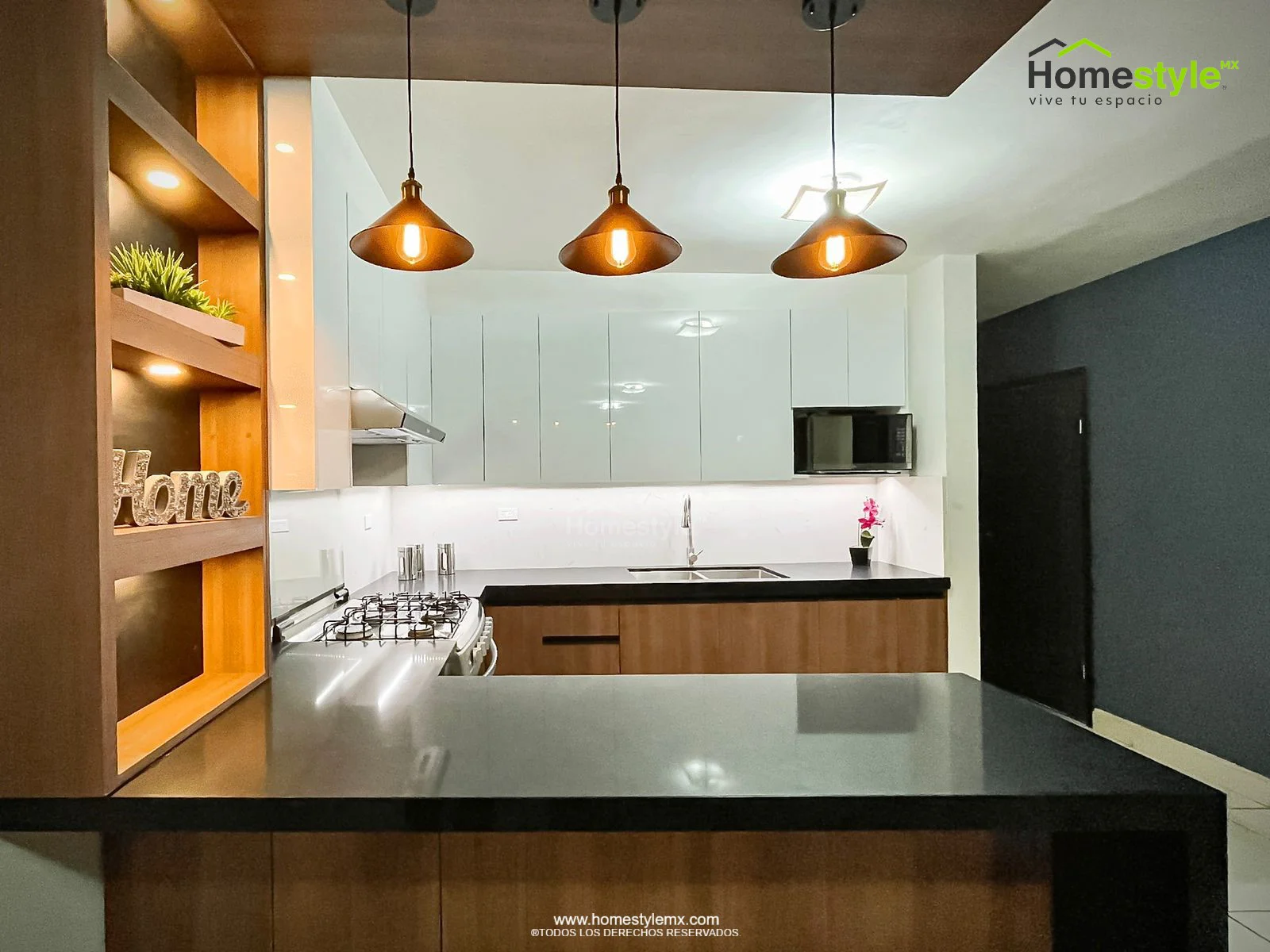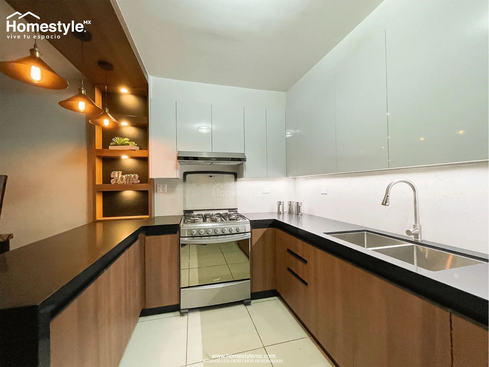 Cocina en forma de L con barra-comedor con cascada, diseñada en Melamina Vesto Nocce Milano para los gabinetes inferiores y MDF Alto Brillo Blanco para gabinetería superior.