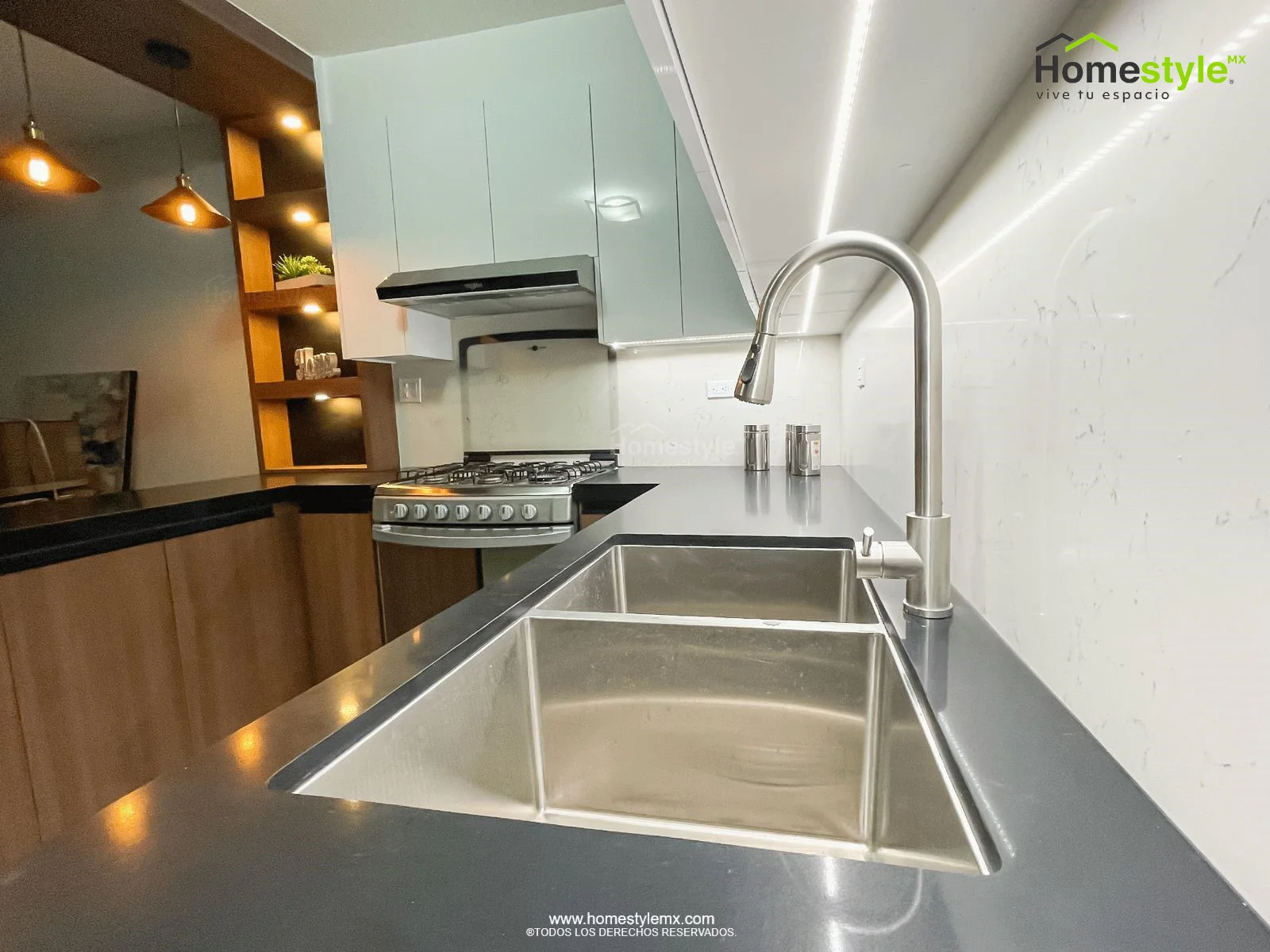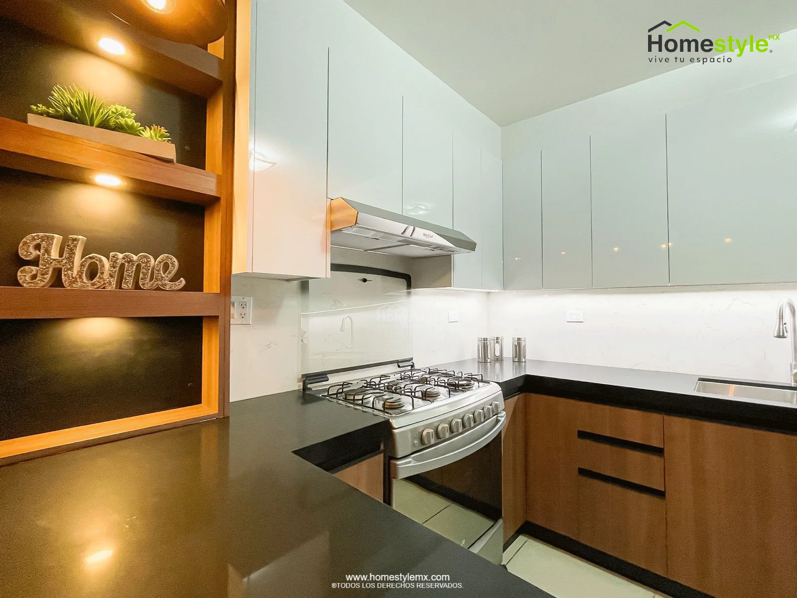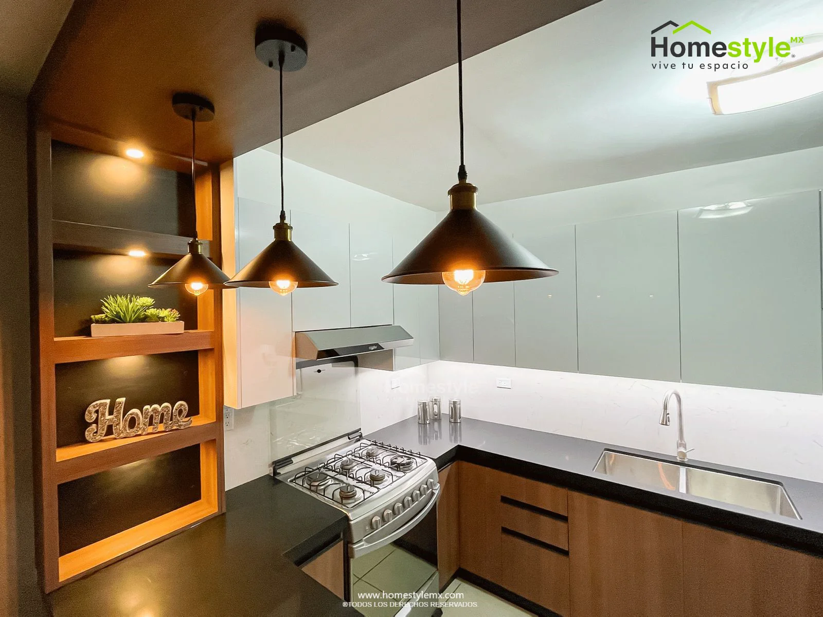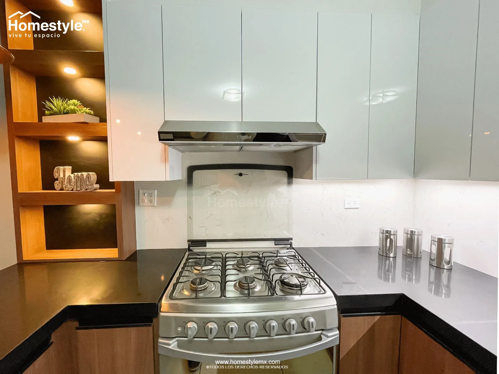 Cocina en forma de L con barra-comedor con cascada, diseñada en Melamina Vesto Nocce Milano para los gabinetes inferiores y MDF Alto Brillo Blanco para gabinetería superior.