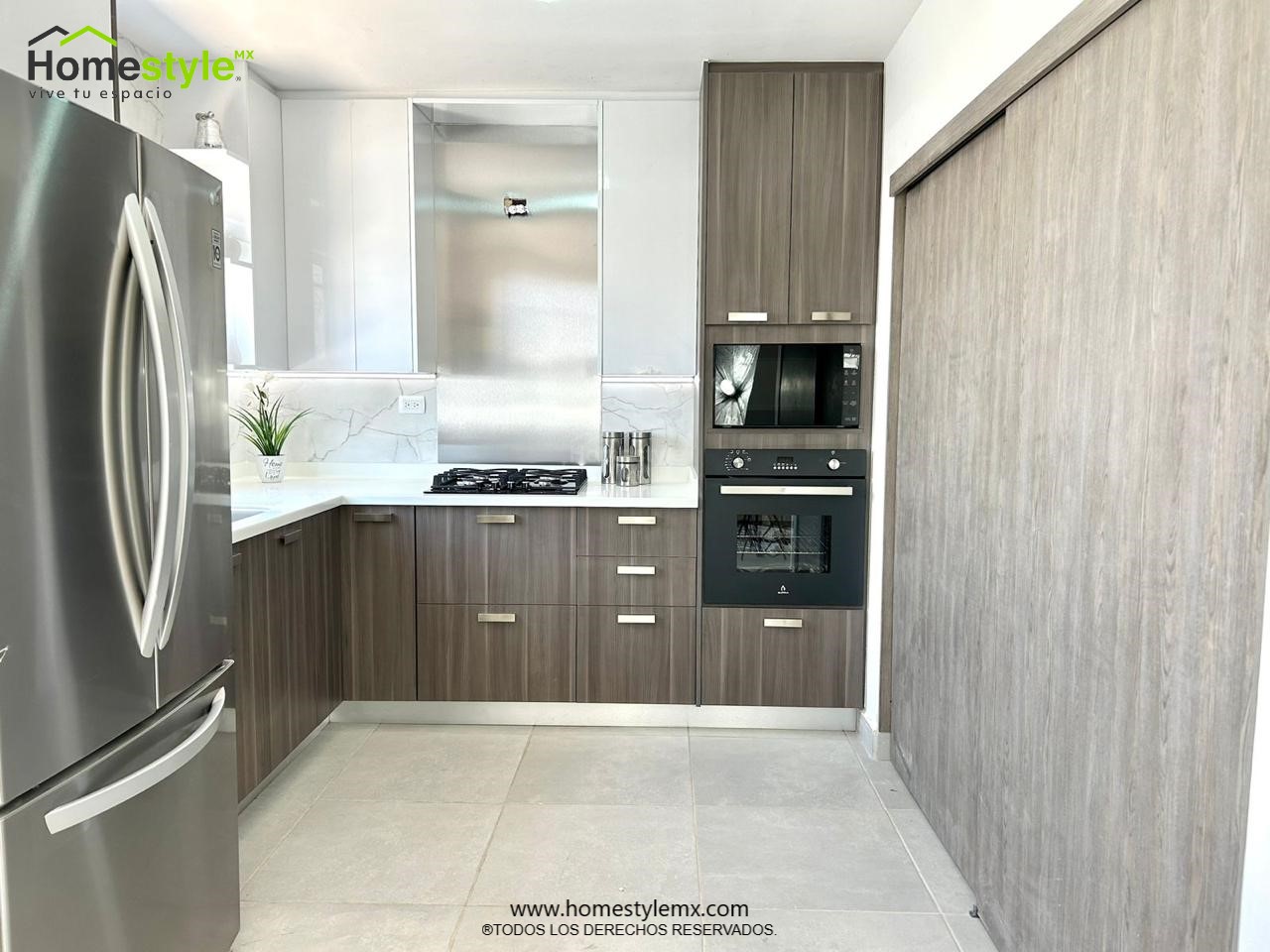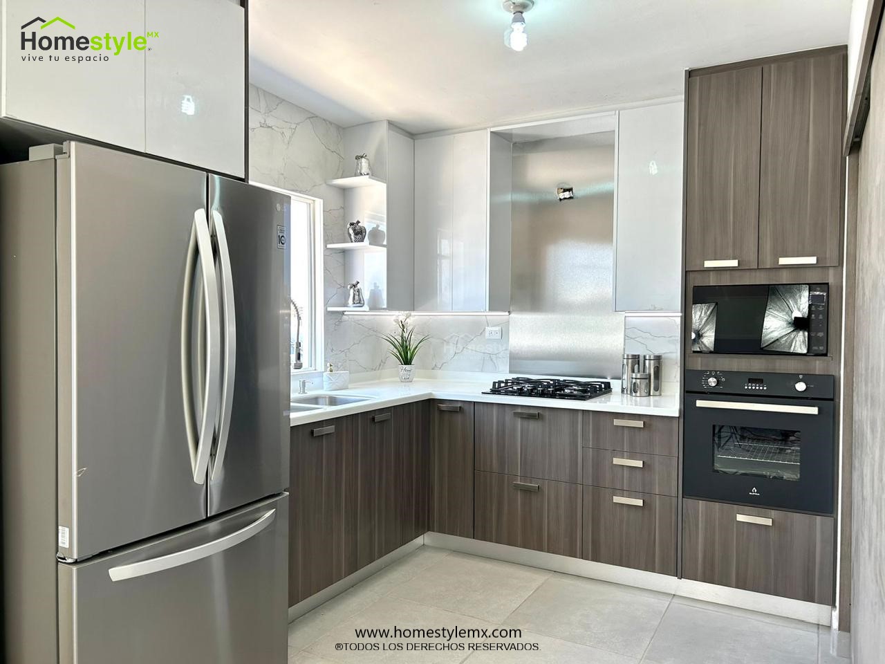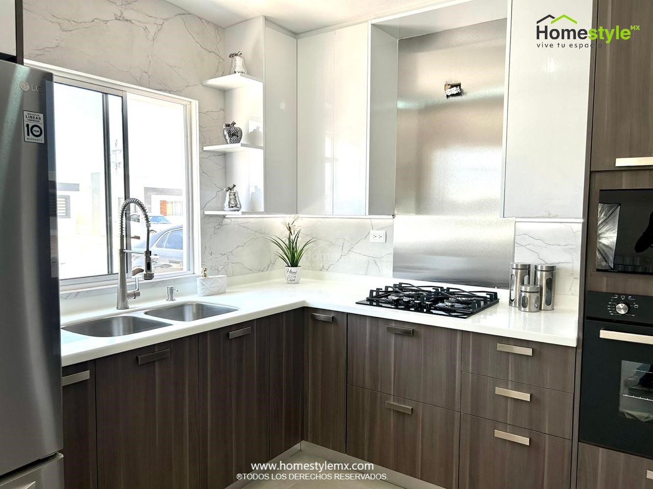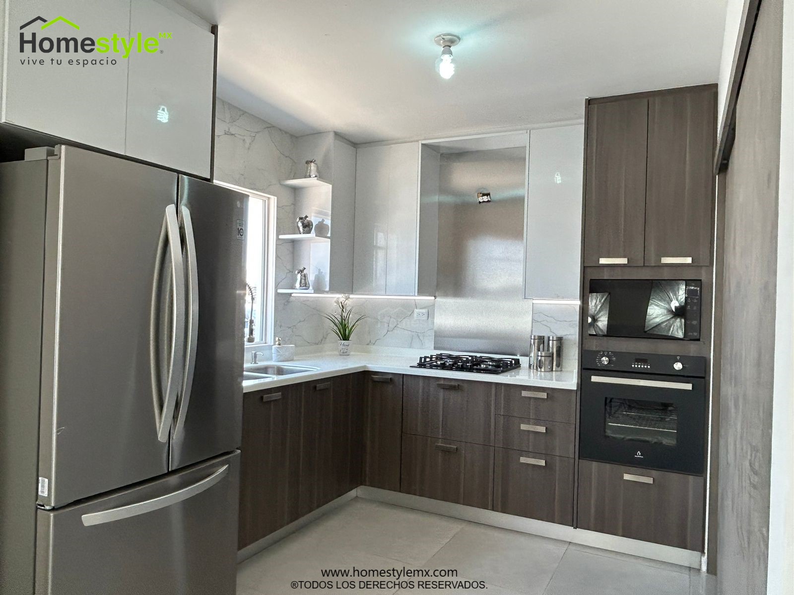 | Materiales | Melamina Vesto Linosa Ceniza, MDF Alto Brillo Blanco y Backsplash de acero inoxidable. Cubierta: Superficie Solida Wilsonart Frosty White. |