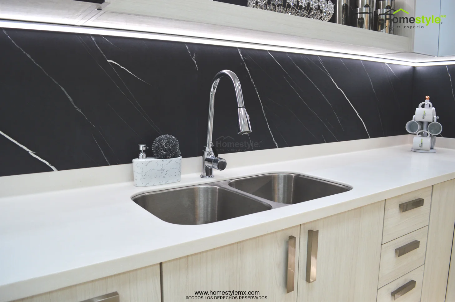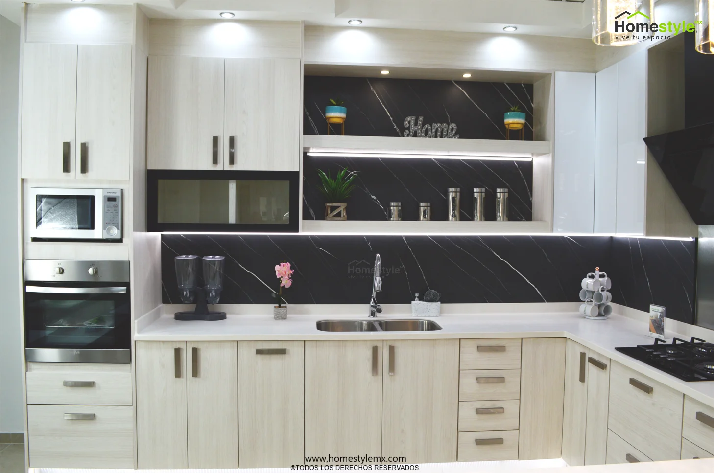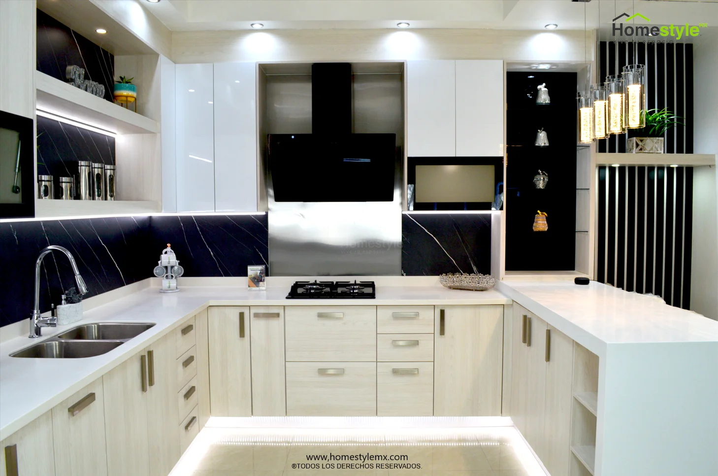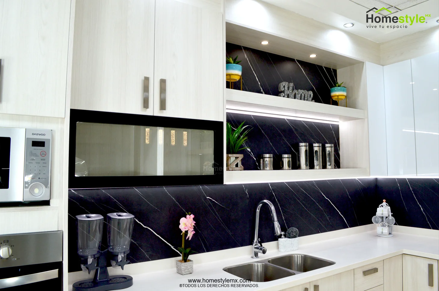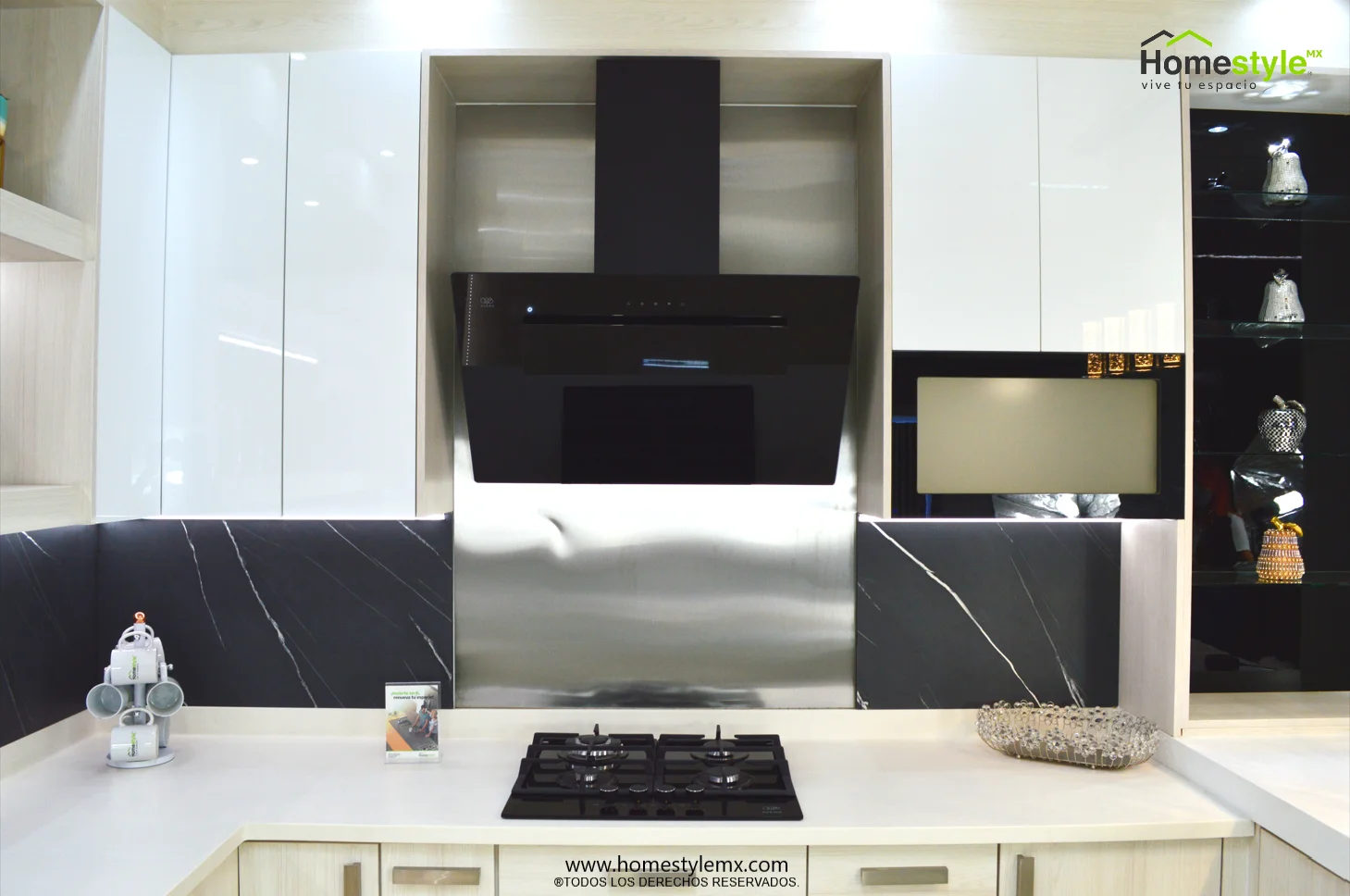 Melamina Vesto Teka Artico, MDF alto brillo blanco y MDF alto brillo negro. Cubierta: Cubierta de superficie solida Corian Designer White y Avonite Wilsonart Kokura.