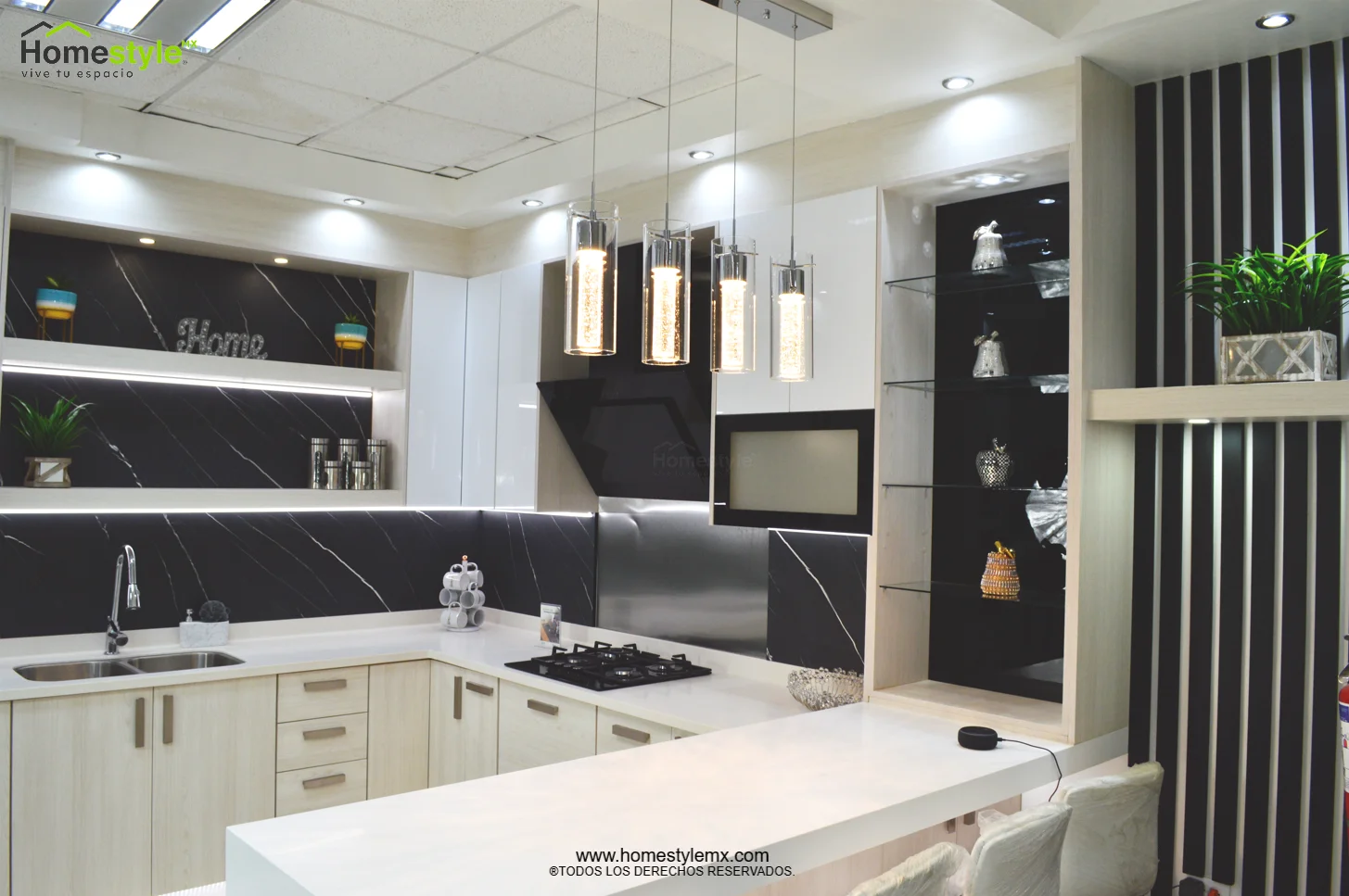 Cocina en forma de L con barra-comedor para 4 personas, diseñada en Melamina Vesto Teka Artico para los gabinetes inferiores y algunos superiores, MDF alto brillo blanco para gabinetería superior y MDF alto brillo negro para gabinetes con cristal. Cubierta de superficie solida Corian Designer White y Avonite Wilsonart Kokura.