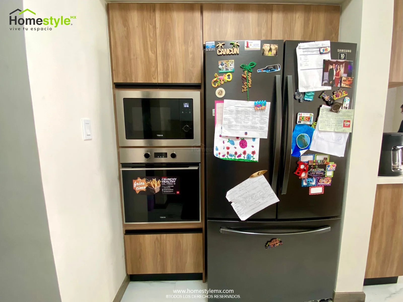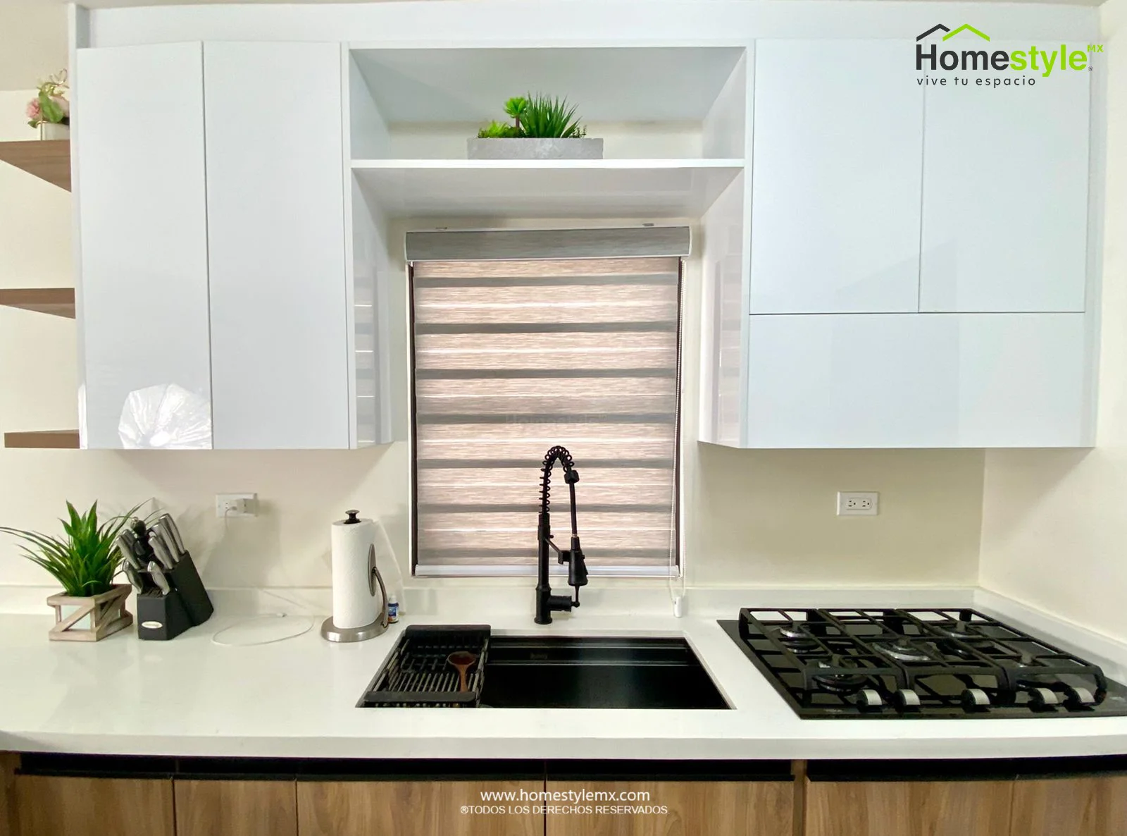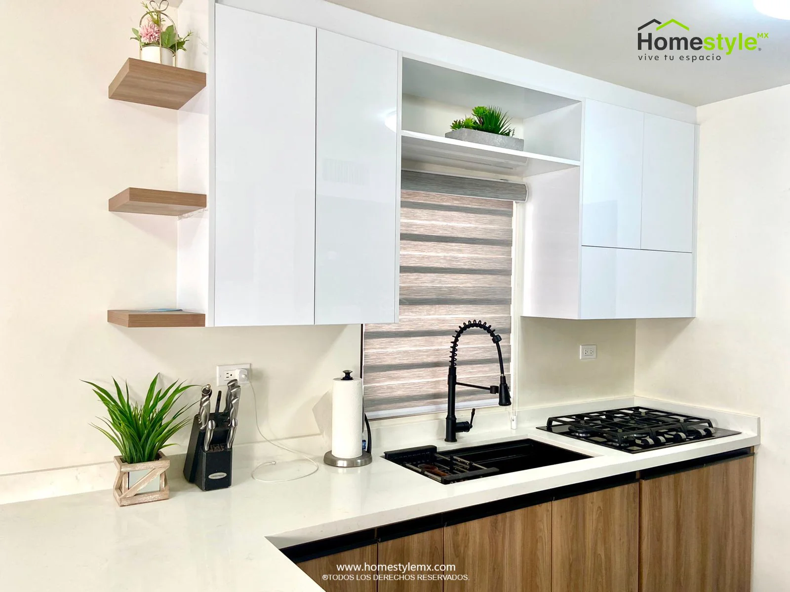 | Materiales | Melamina Vesto Moscato, MDF alto brillo blanco y Melamina Negro Mate. Cubierta: Cuarzo Carrara y superficie solida Wilsonart Frosty White. |