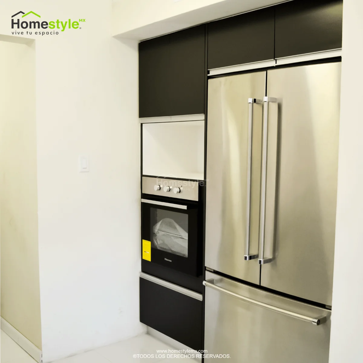 Melamina negro mate, MDF alto brillo blanco y melamina cendra escandinavo. Cubierta: Superficie solida Wilsonart Designer White.