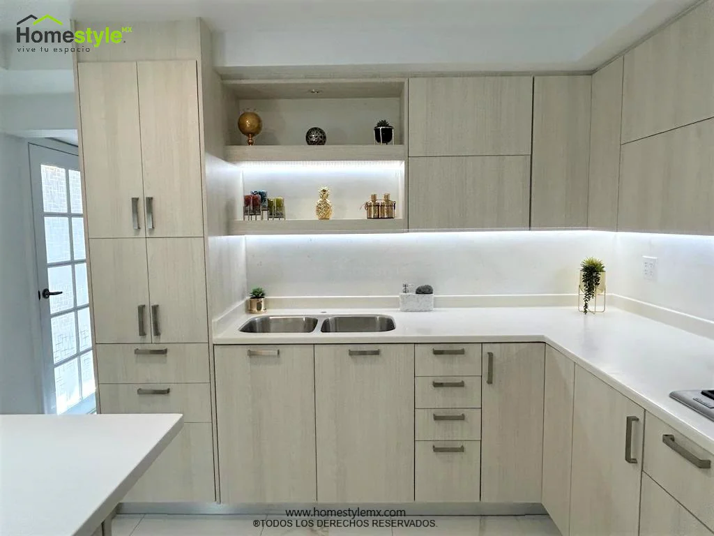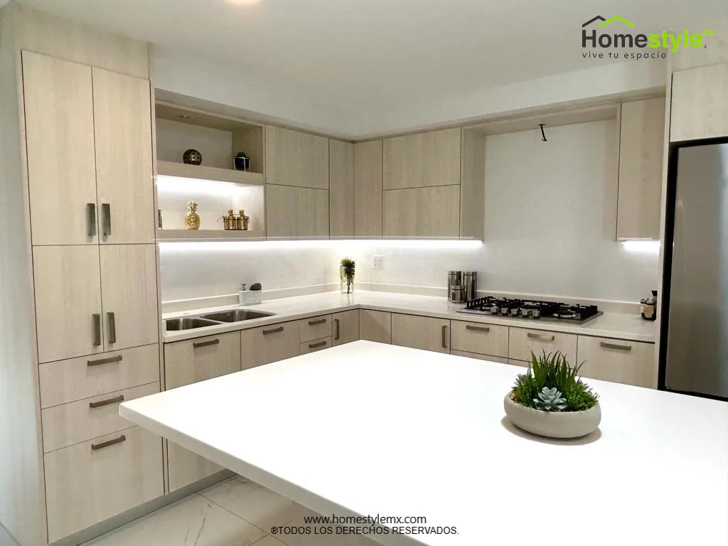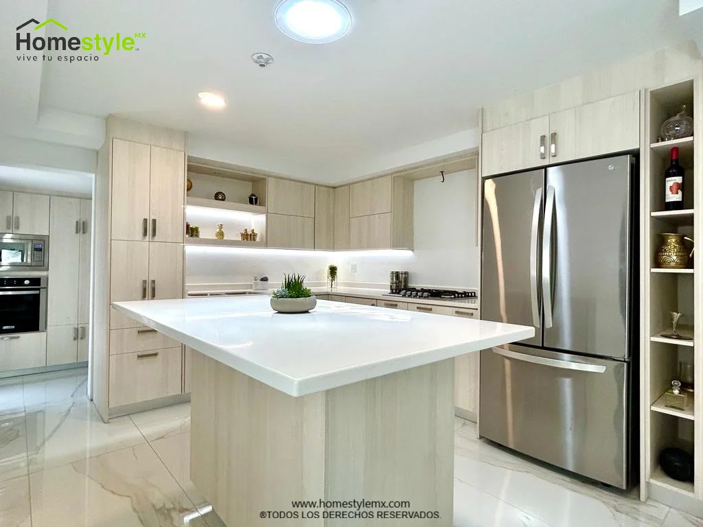 Cocina en forma de L con isla. Diseñada en Melamina Vesto Teka Artico para toda la gabinetería. Cubierta de Superficie Solida Wilsonart Kokura.