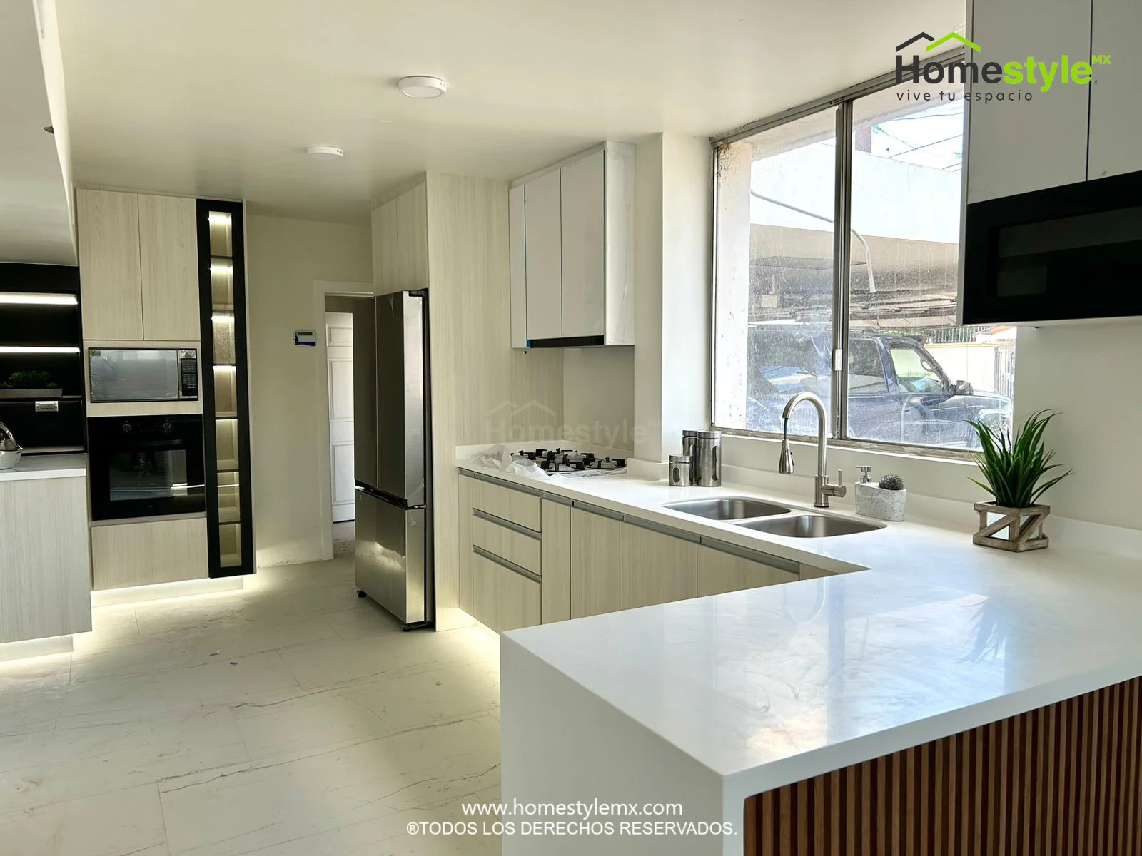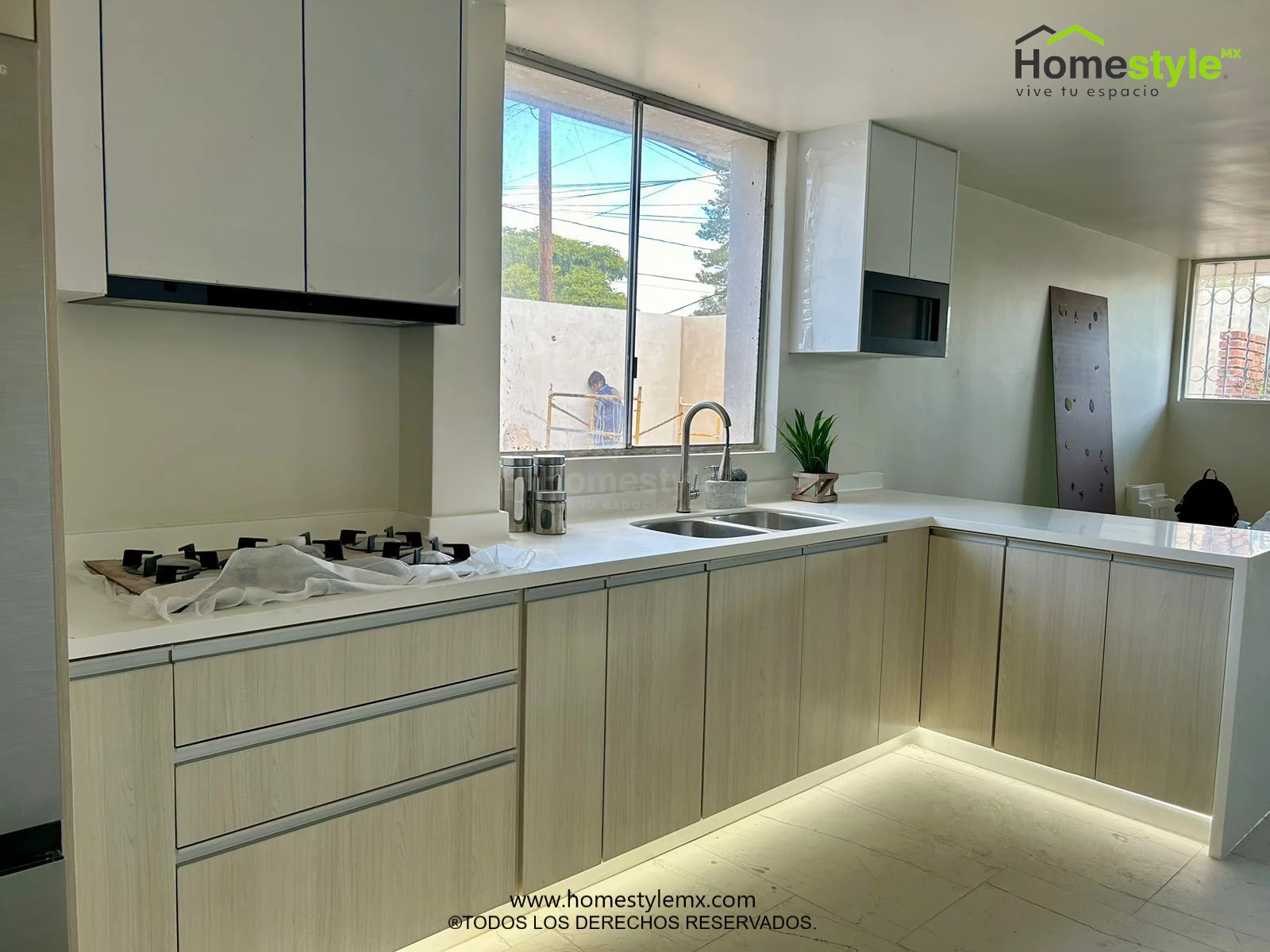 Amplio espacio de almacenamiento con distintas estaciones para la cocina y sistema de iluminación incluido en gabinetes.