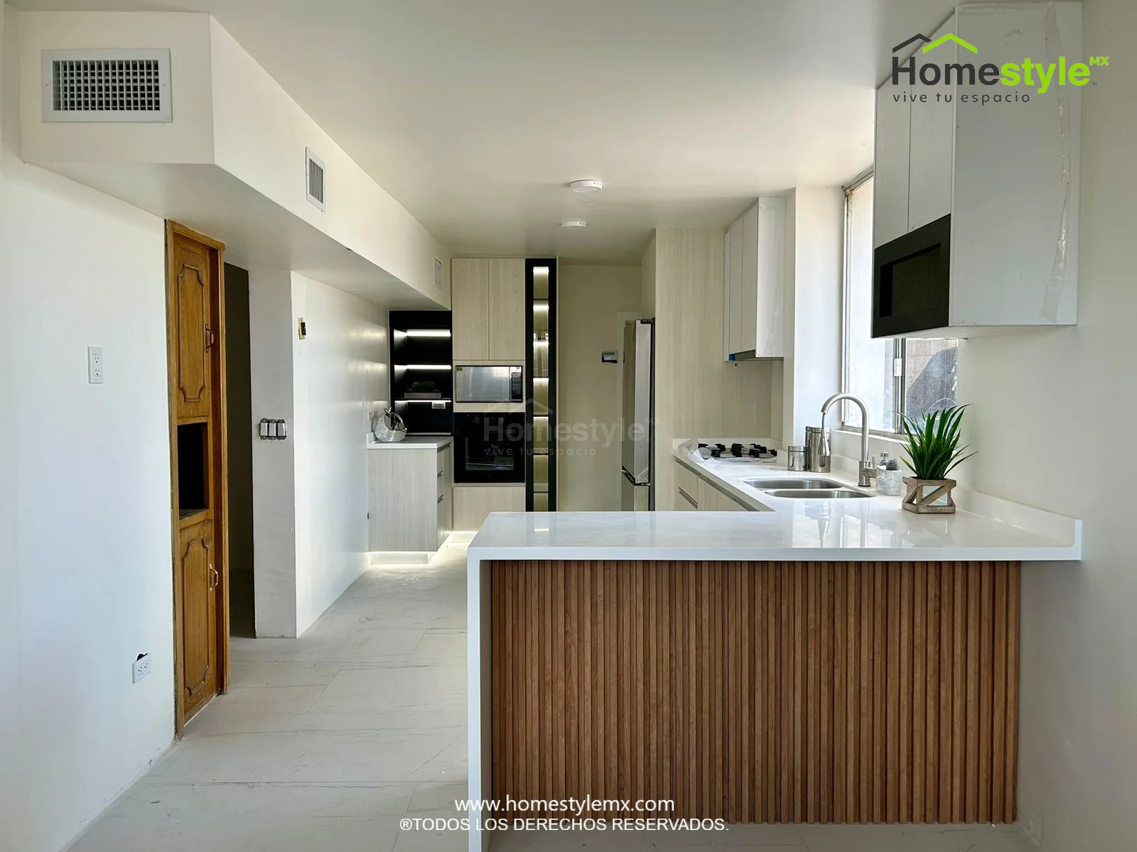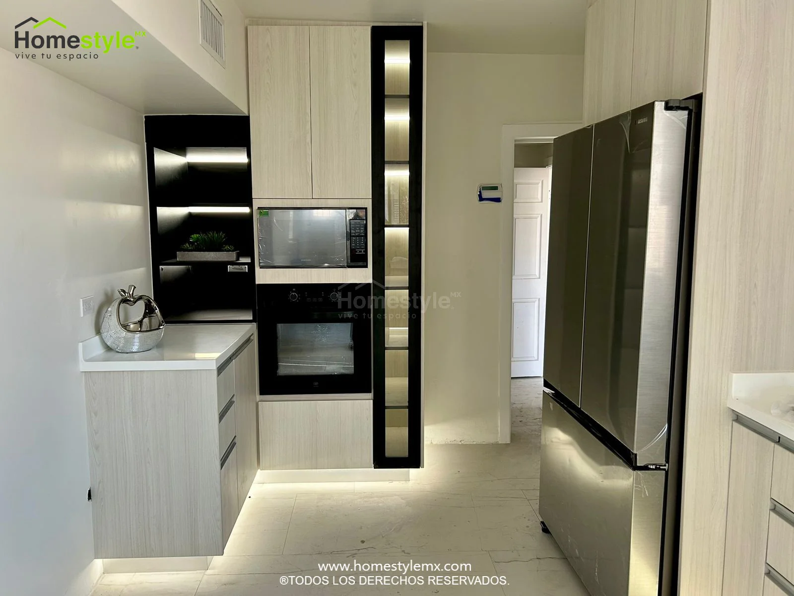 Melamina Teka, MDF Alto Brillo Blanco, Melamina Negra y Lambrín Cedro Cubierta: Superficie Solida Frosty White