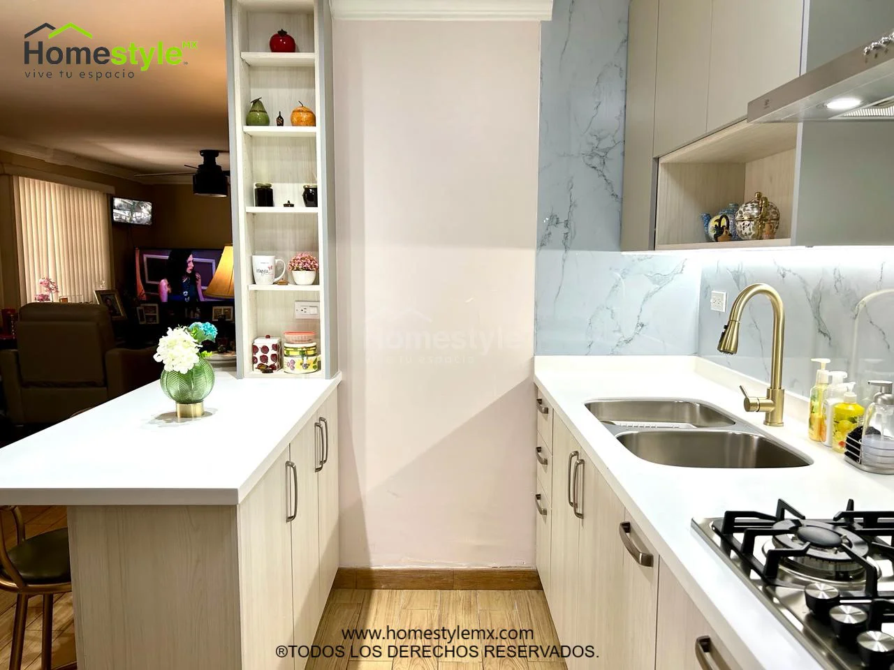 Cocina en forma paralela con barra. Diseñada en Melamina Encimo Polar para la gabinetería inferior y Melamina gris para la gabinetería superior. Con una cubierta de Superficie Solida Frosty White.
