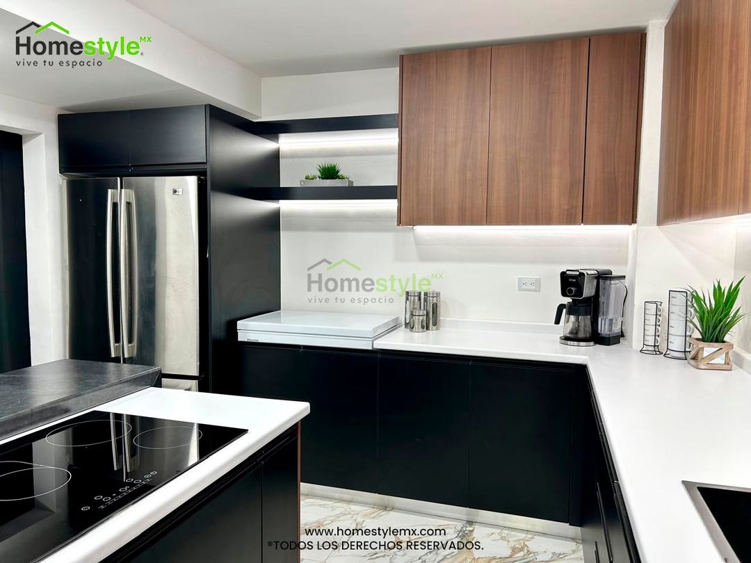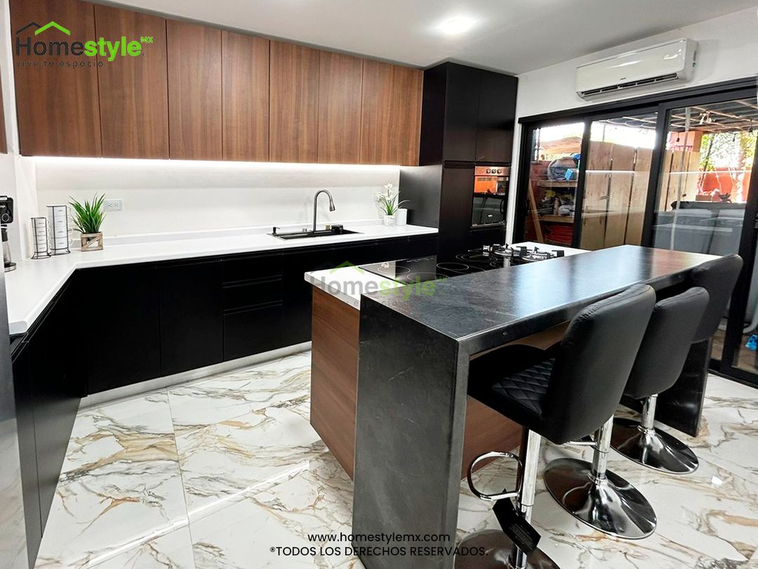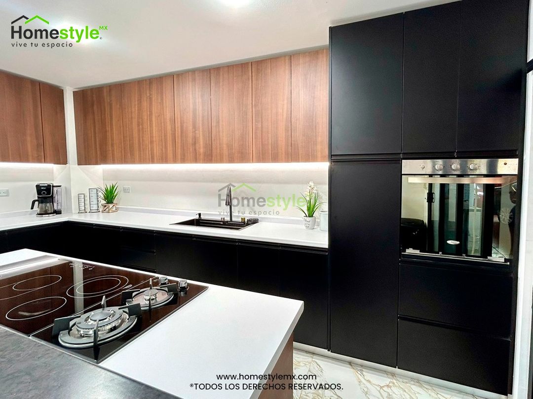 Cocina en forma de L. Diseñada en Melamina Negra para los gabinetes inferiores y Melamina Nocce Milano en gabinetes superiores, una cubierta Formaica Designer white y Formaica Black Alicante con cascada.
