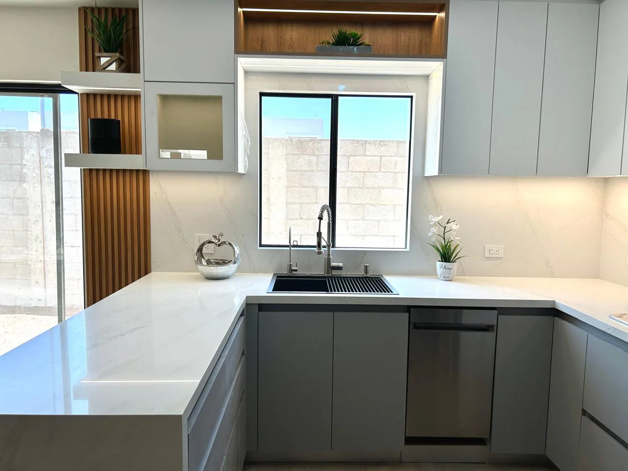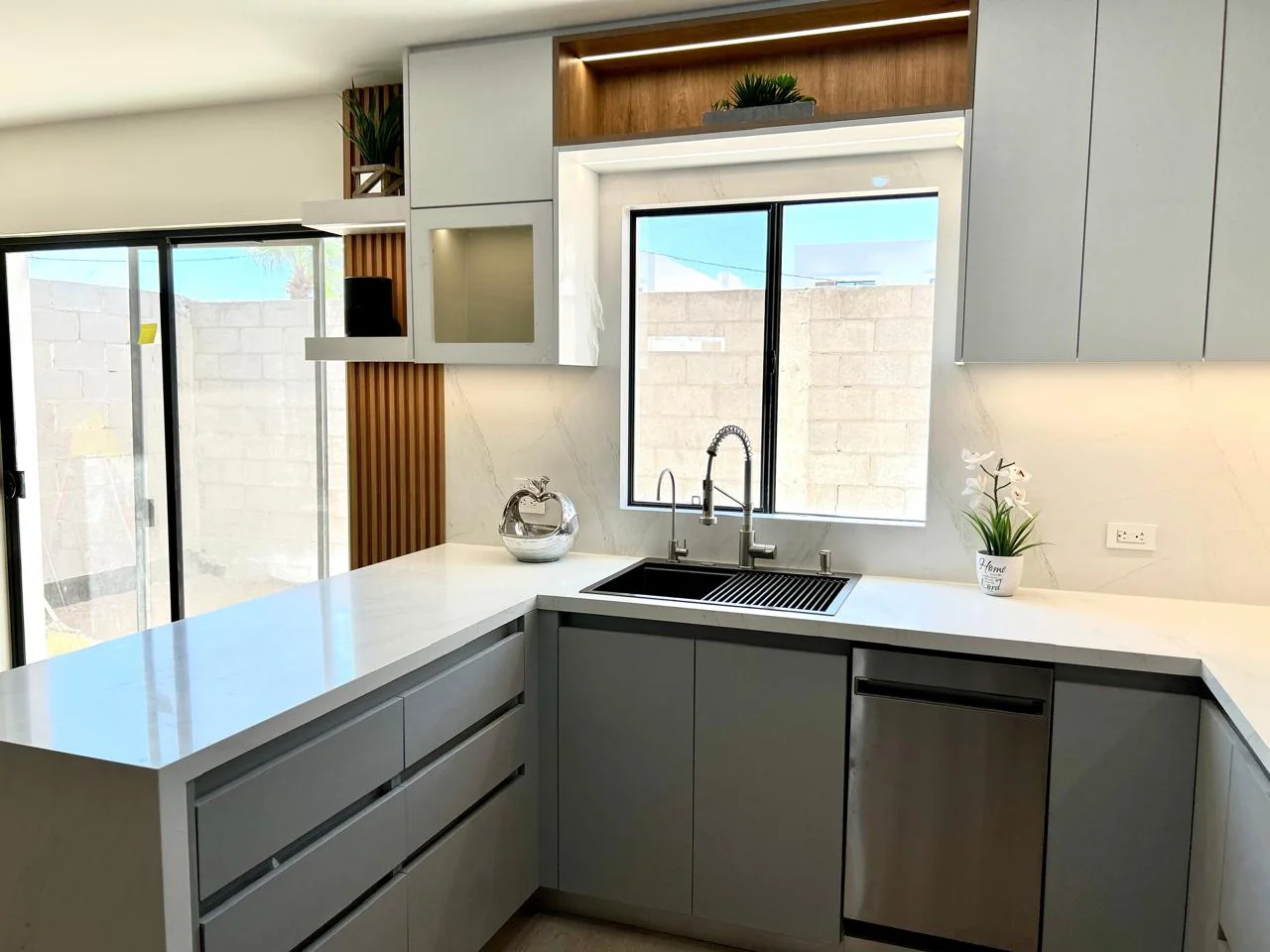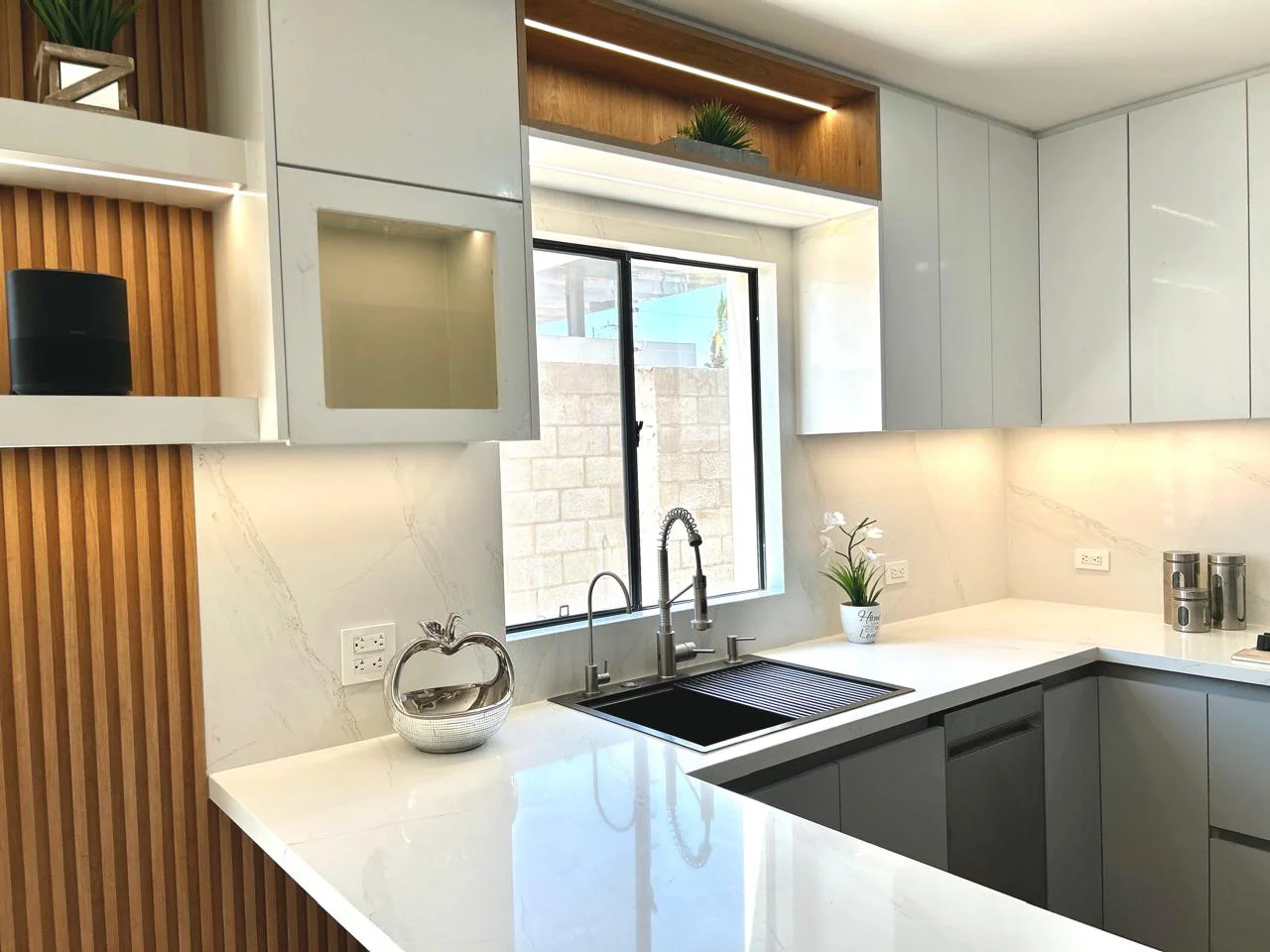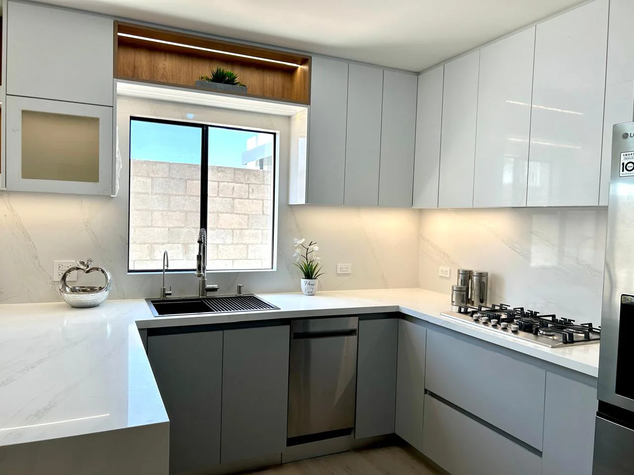 Cocina en forma de “L” con barra. Diseñada en Melamina Gris Humo para los gabinetes inferiores y MDF Alto Brillo Blanco para los gabinetes superiores, además se le agrego un gabinete en Melamina Monarca. Cuenta con Iluminación LED cálida el cual se controla con Alexa y Lambrin color Cedro en el área de la barra.
