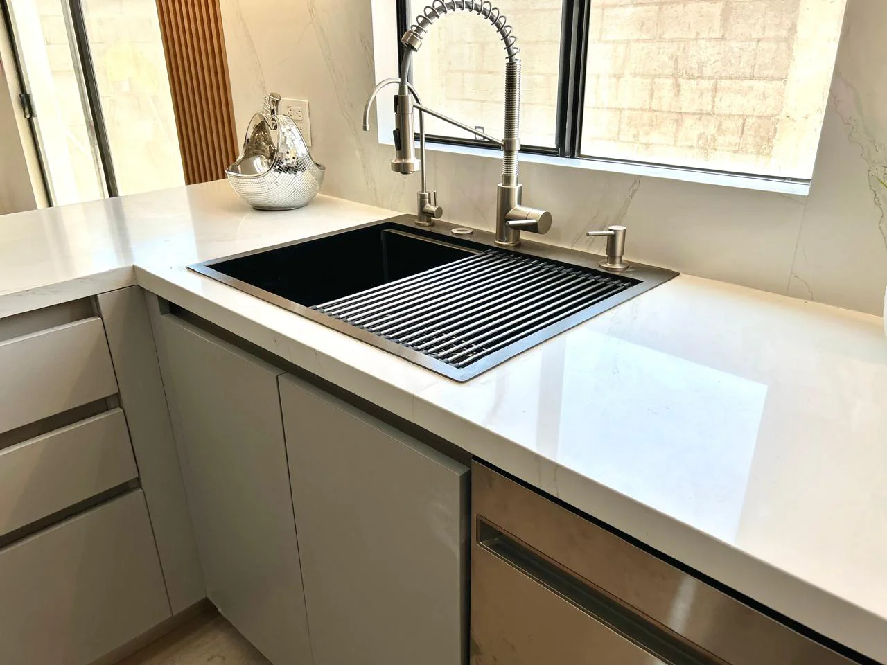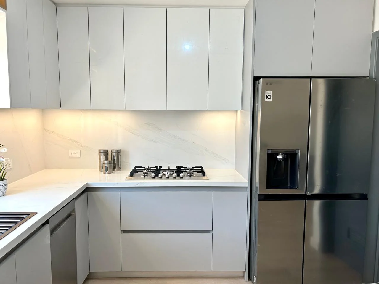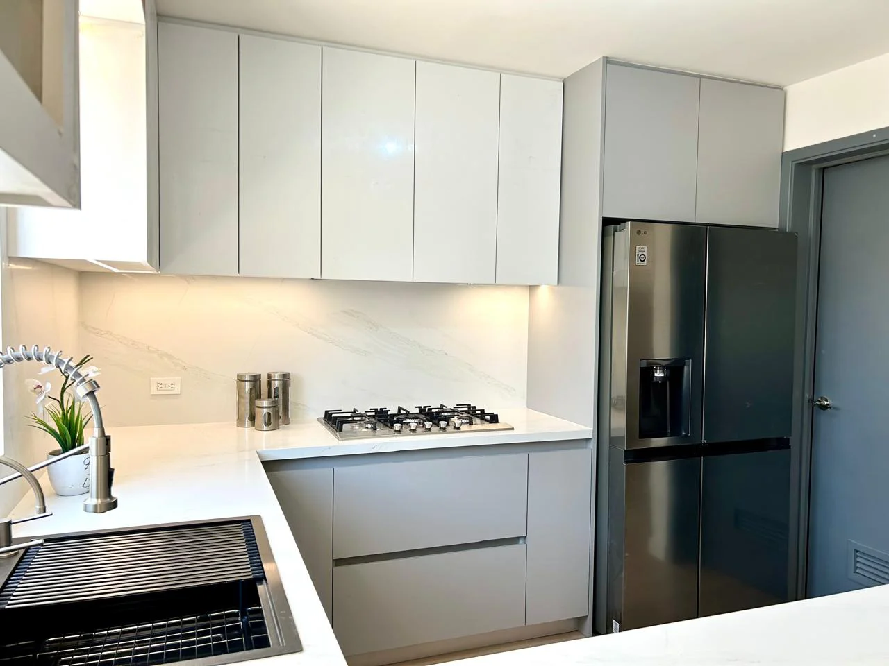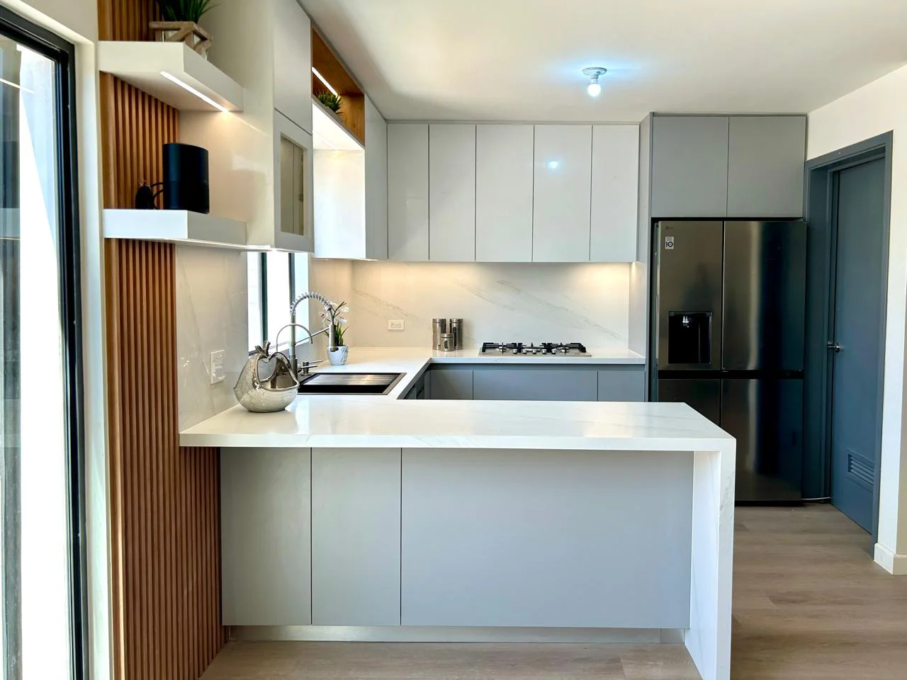 Cocina en forma de “L” con barra. Diseñada en Melamina Gris Humo para los gabinetes inferiores y MDF Alto Brillo Blanco para los gabinetes superiores, además se le agrego un gabinete en Melamina Monarca. Cuenta con Iluminación LED cálida el cual se controla con Alexa y Lambrin color Cedro en el área de la barra.