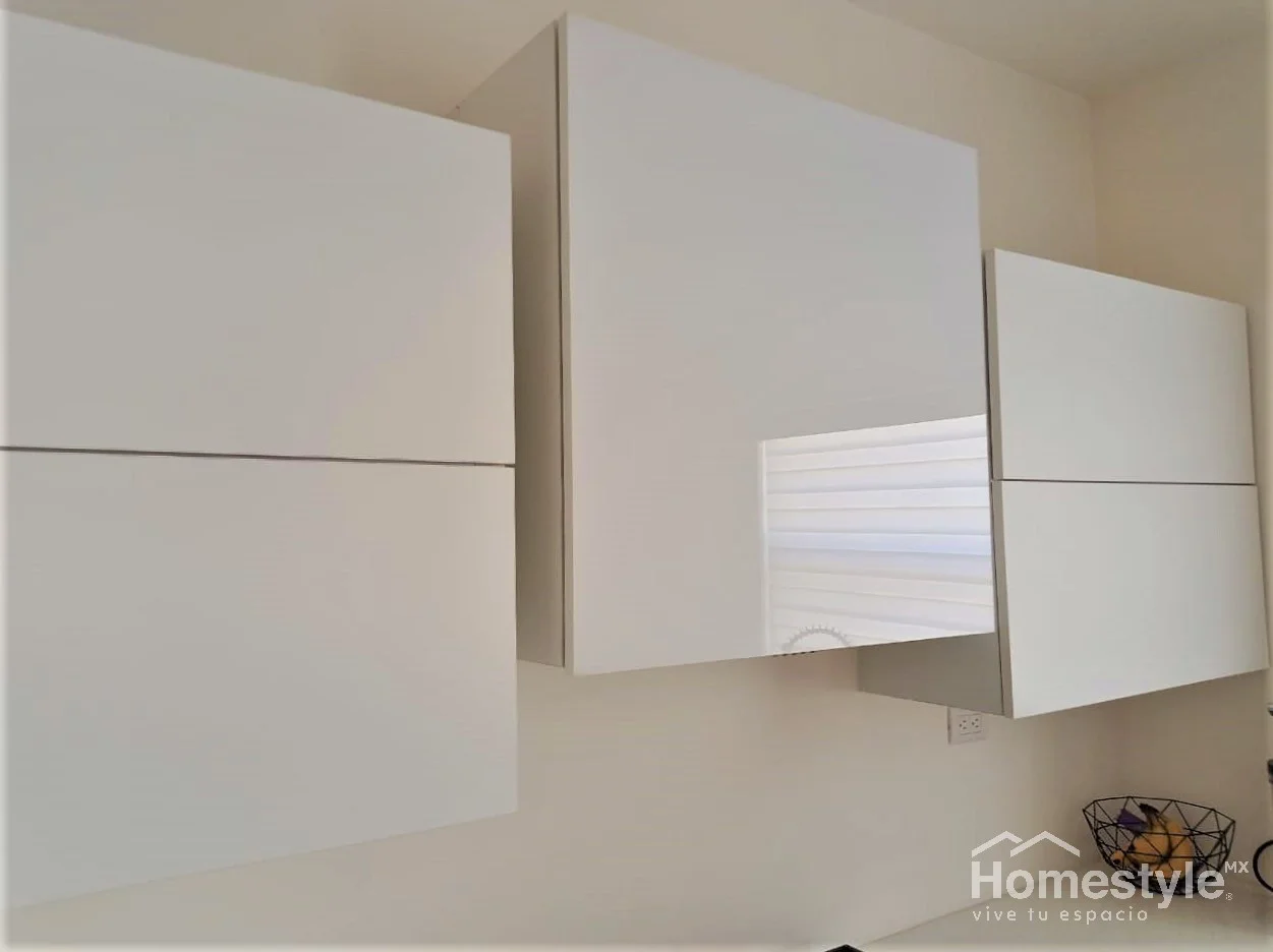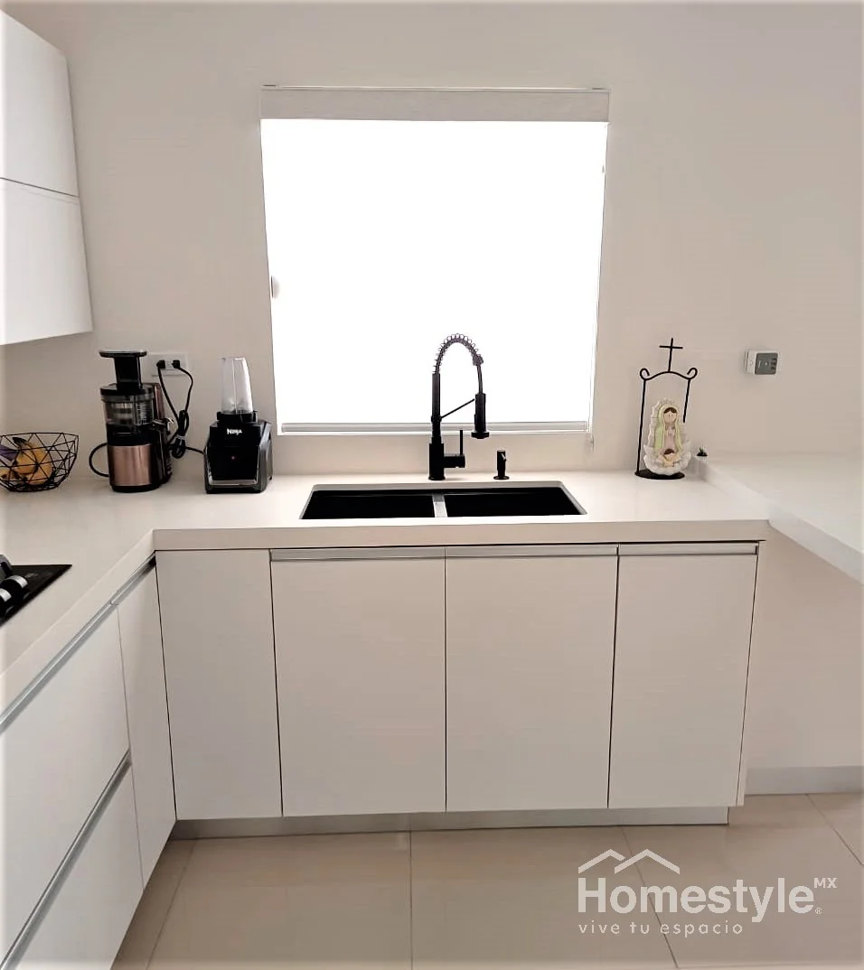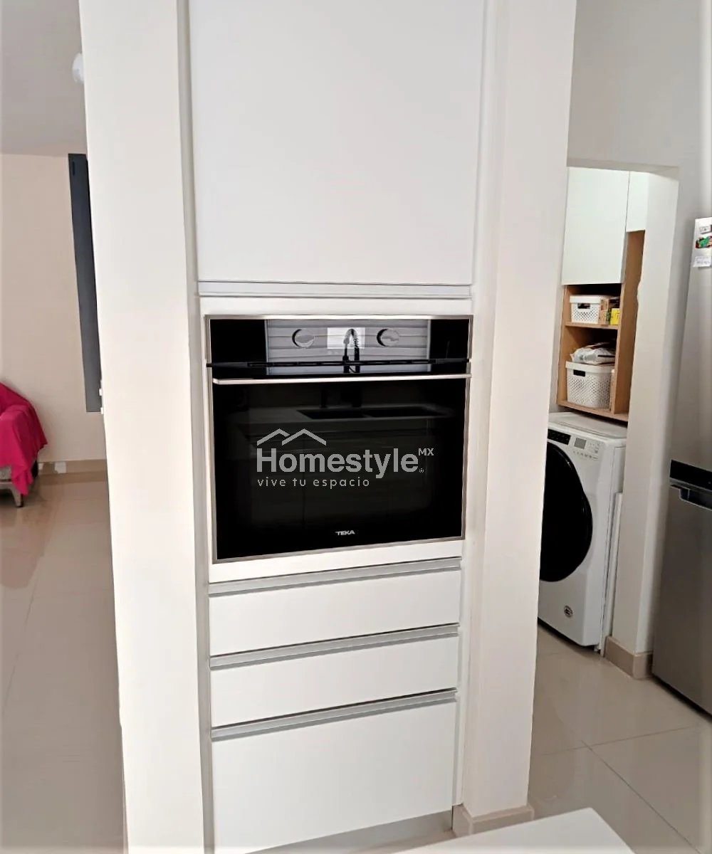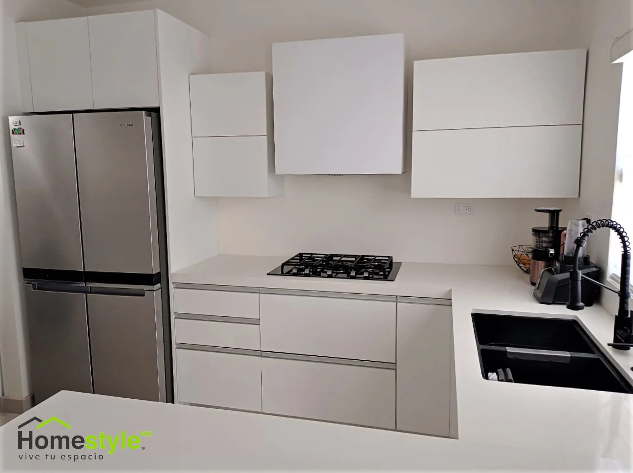 | Materiales | MDF Blanco Mate y MDF Acrílico Alto Brillo Blanco. Cubierta: Corian Glacier White. |