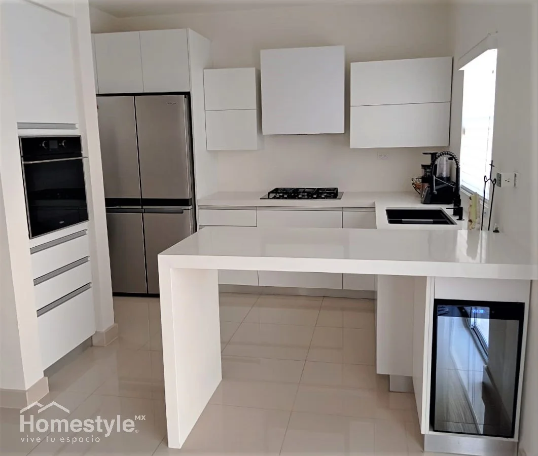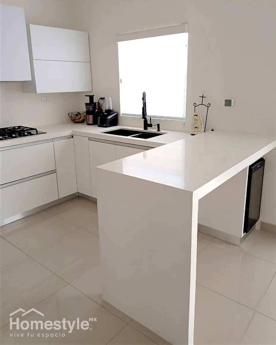Cocina en forma de L con barra-comedor y cascada, diseñada en MDF Blanco Mate para los gabinetes inferiores y MDF Acrílico alto brillo blanco para los gabinetes superiores.