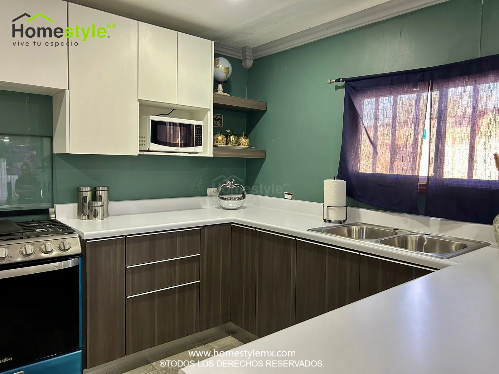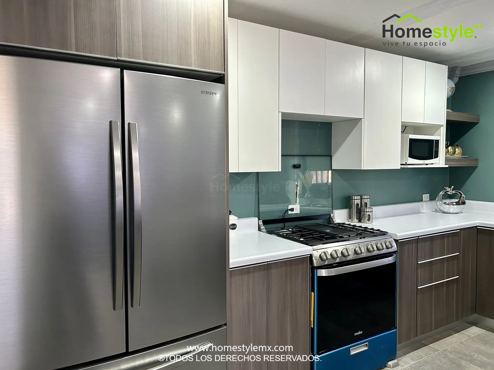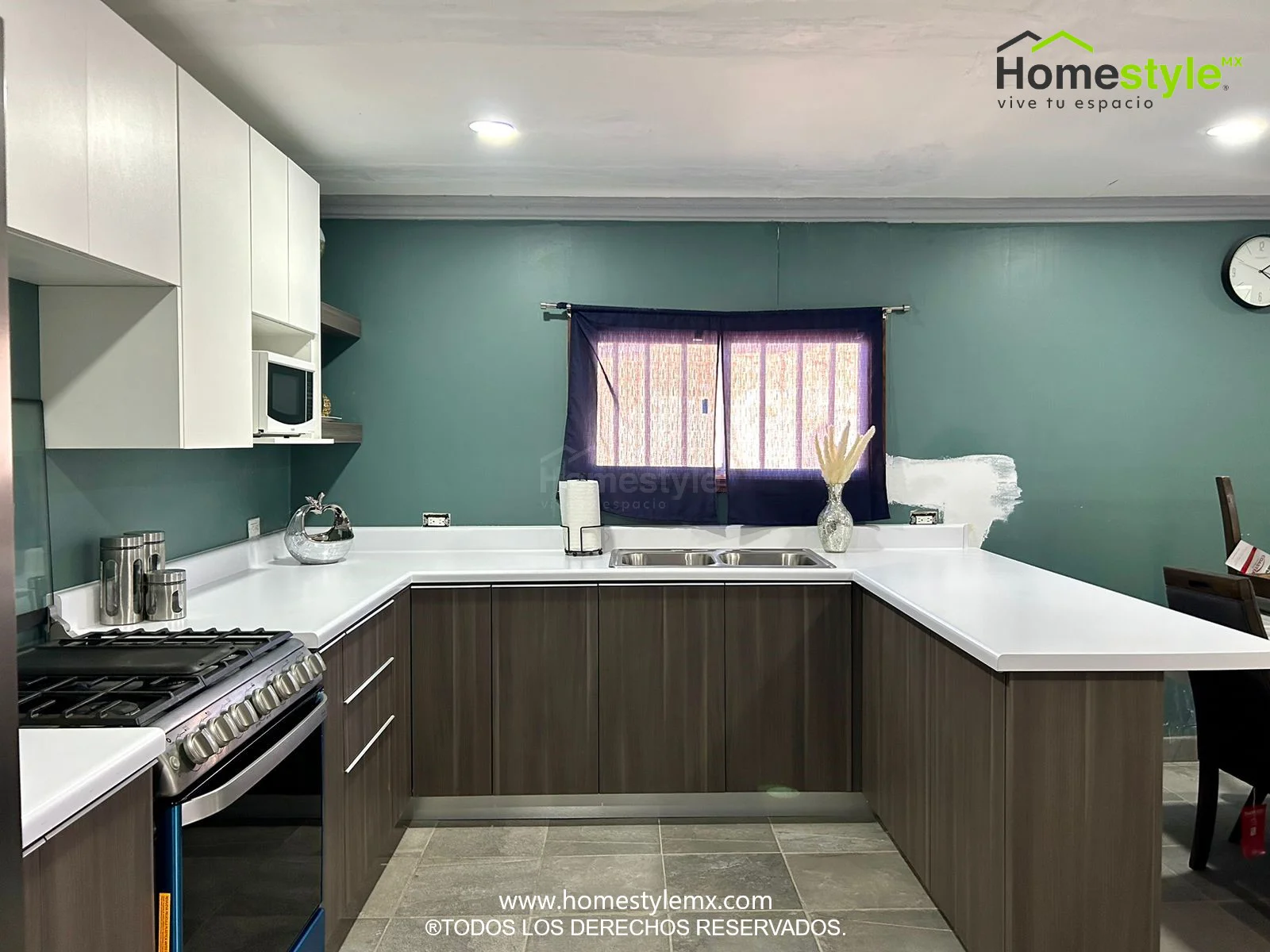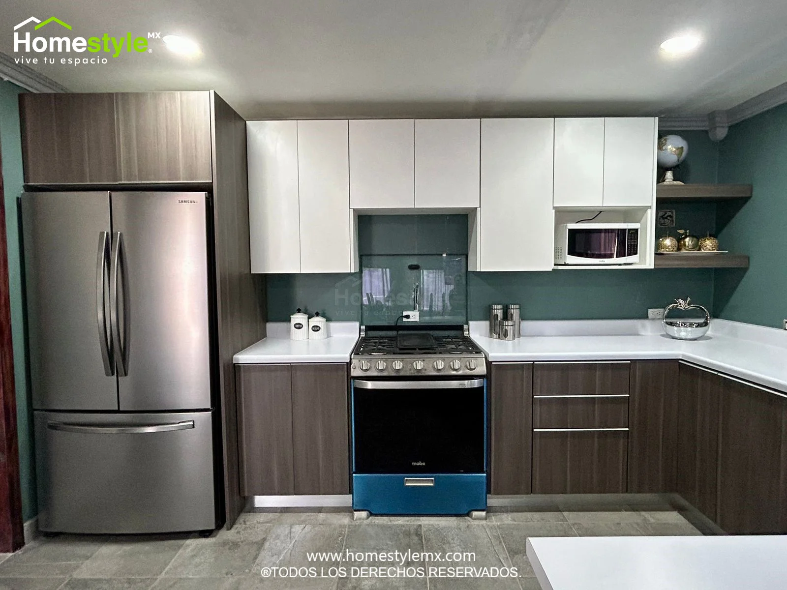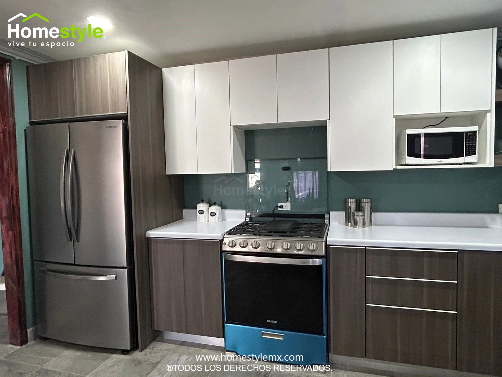 Cocina en forma de J con barra comedor. Diseñada en Melamina Vesto Linosa Ceniza para gabinetes inferiores y Melamina Blanca para gabinetería superior. Con una cubierta de Formaica Blanca.
