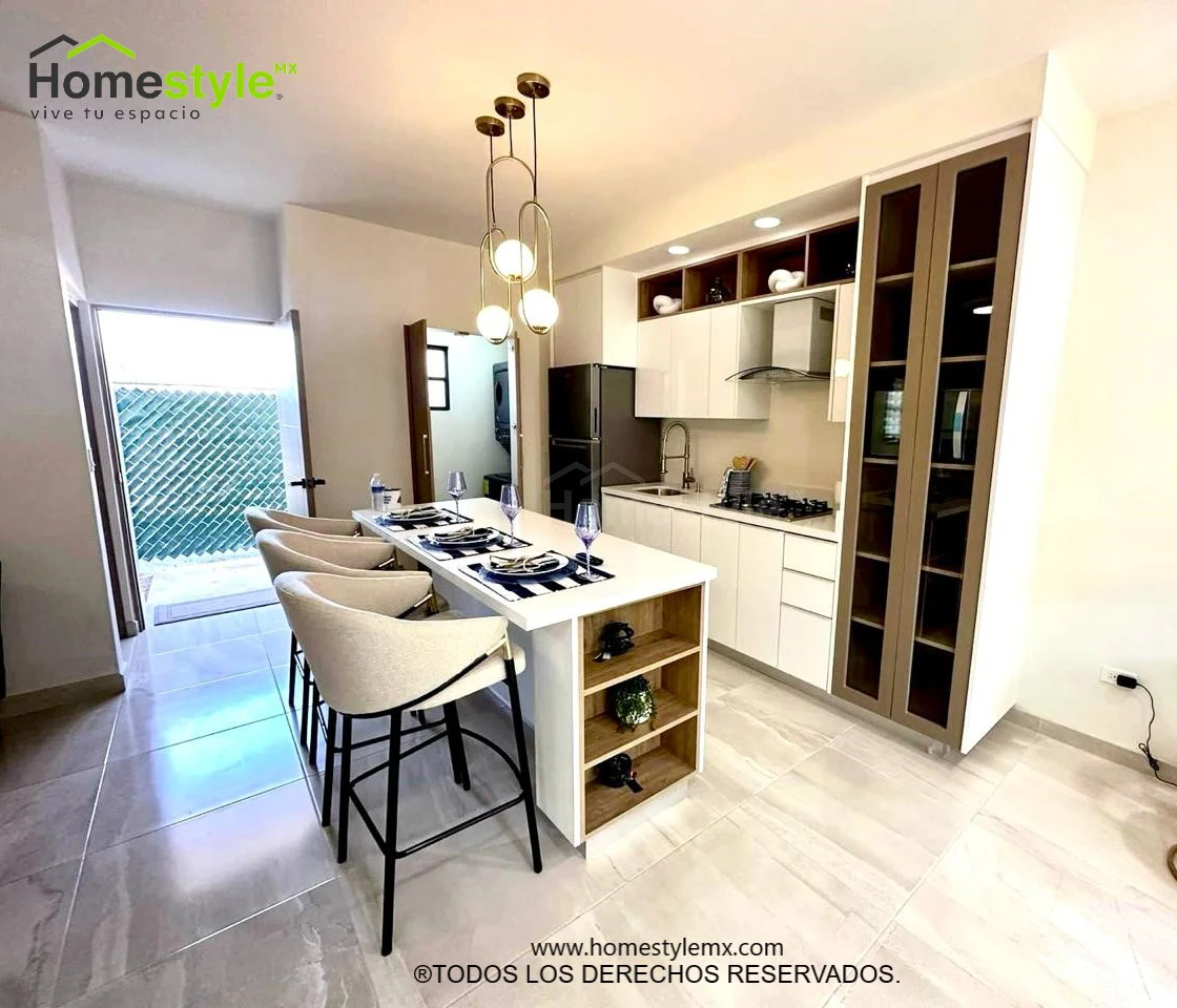Cocina en forma lineal con isla comedor. Diseñada en Melamina Blanca para gabinetes inferiores y MDF Blanca Alto Brillo para gabinetería superior.