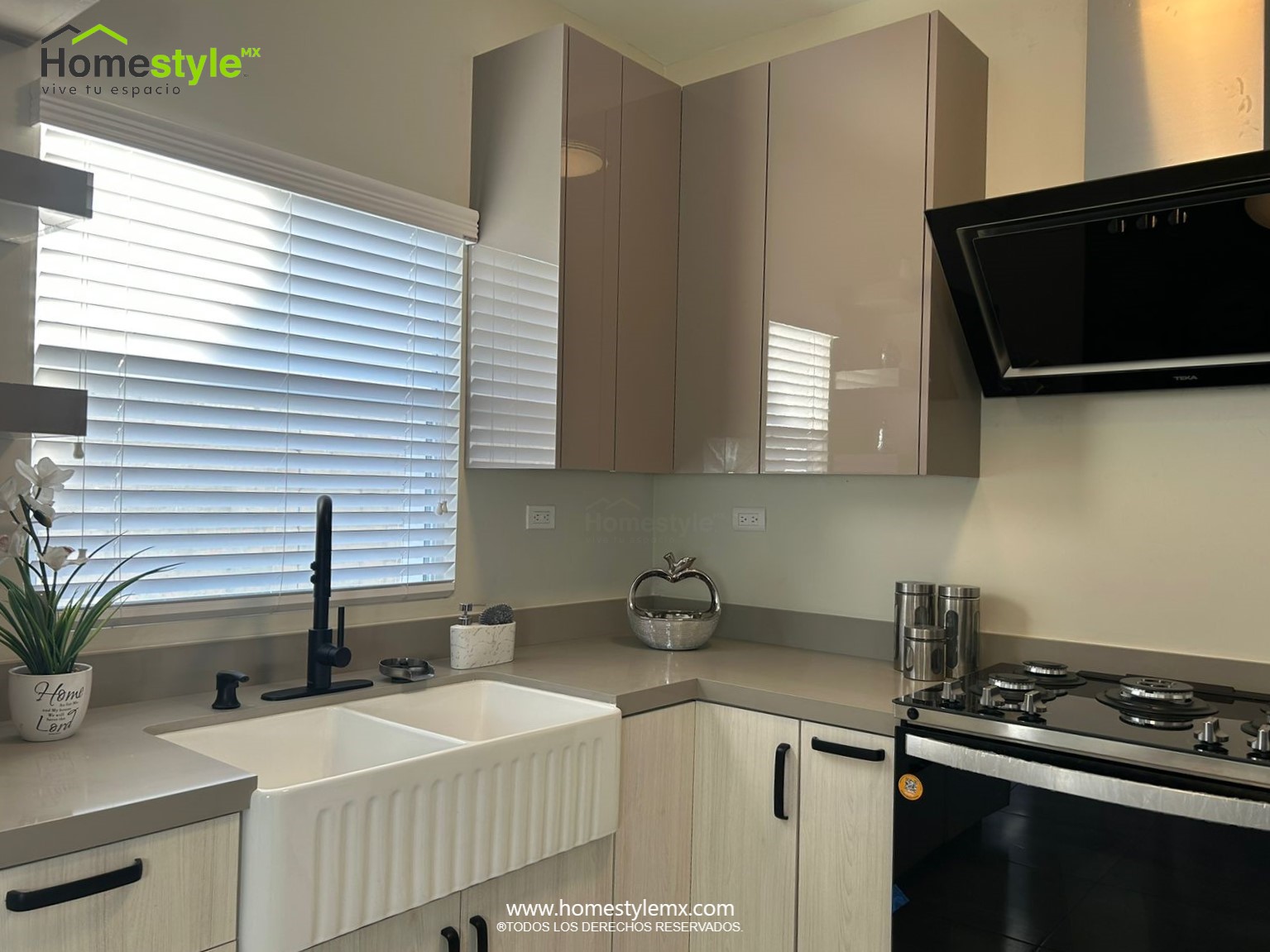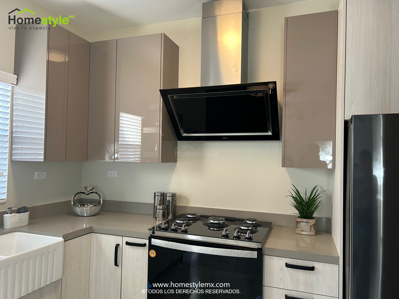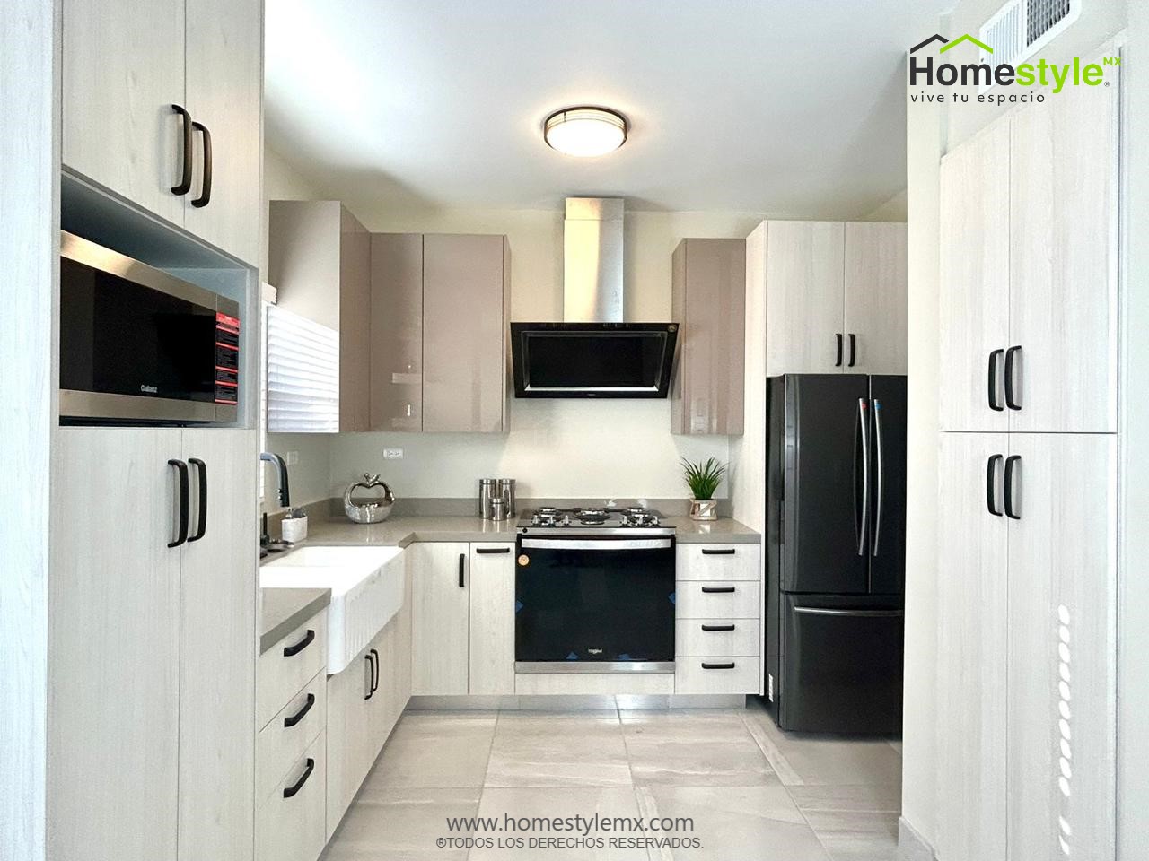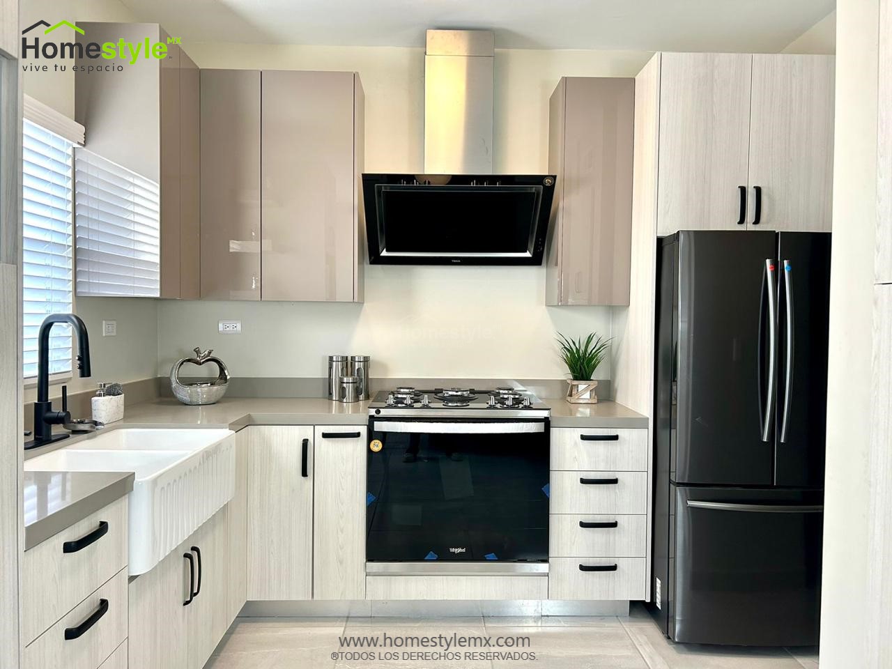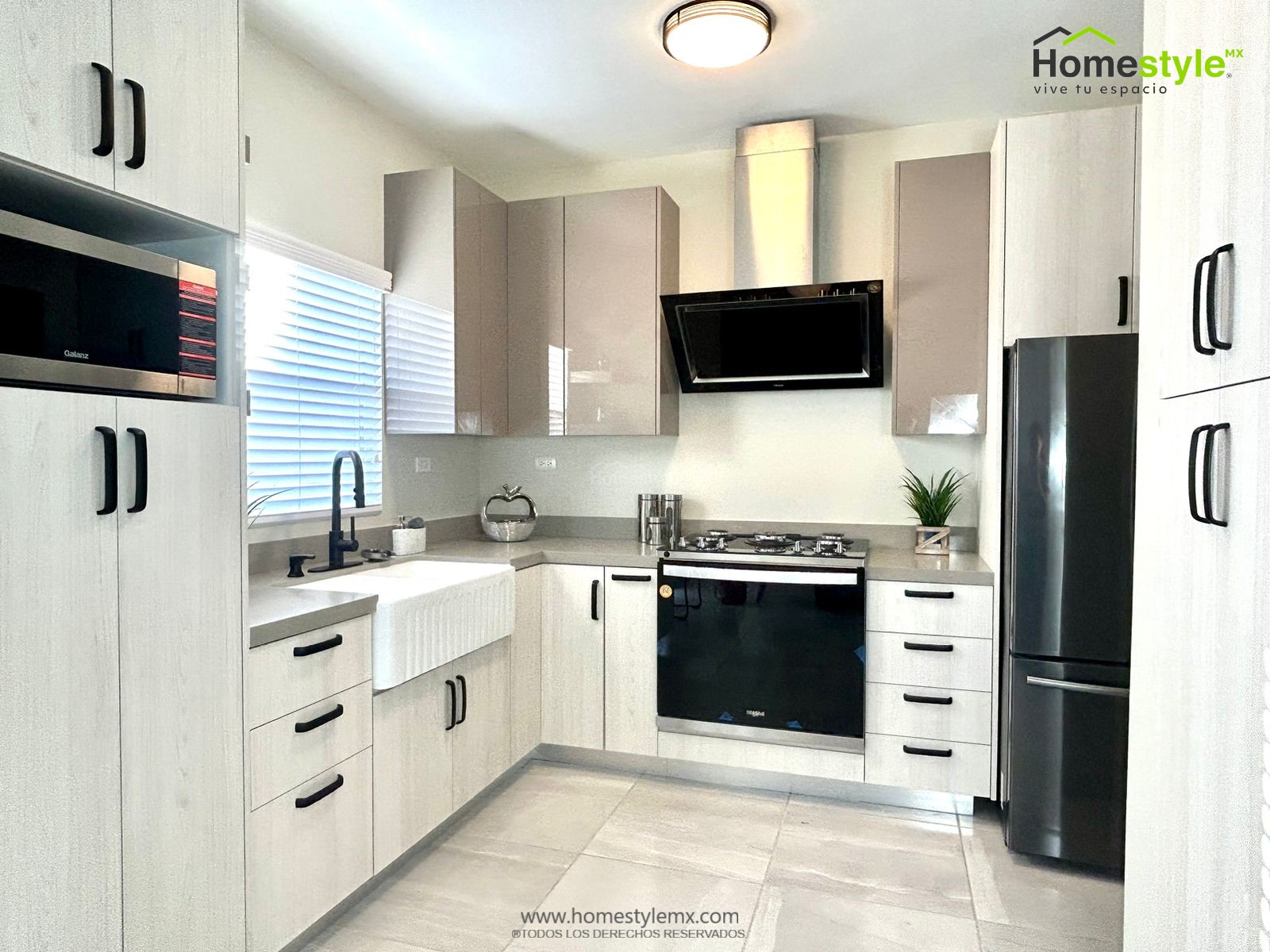 Cocina en forma de L. Diseñada en Melamina Vesto Teka Ártico para gabinetería inferior y MDF Alto Brillo Mink para gabinetes superiores.