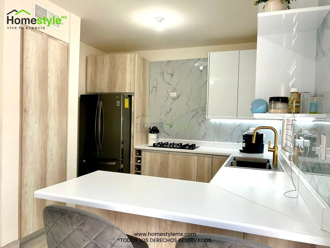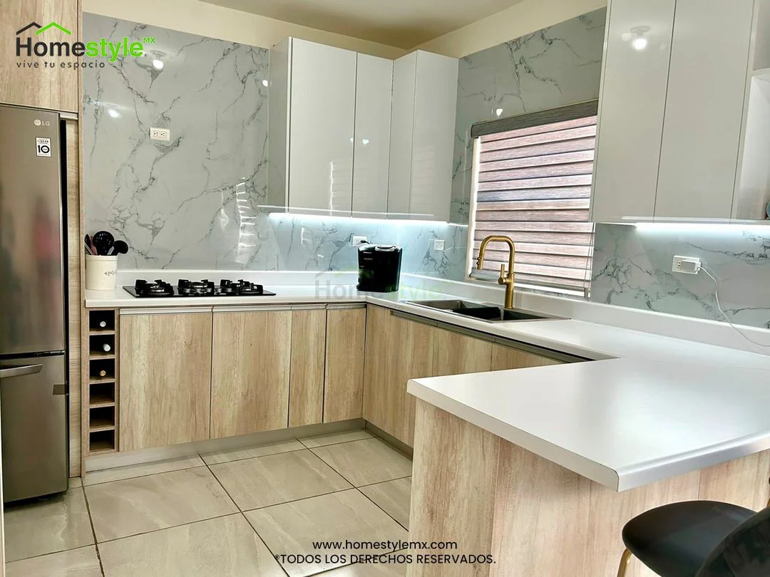 Cocina en forma de L con barra comedor y área de alacena. Diseñada en Melamina Toscana para gabinetes inferiores y MDF Alto Brillo Blanco para gabinetería superior. Con una cubierta de Formaica Blanca.