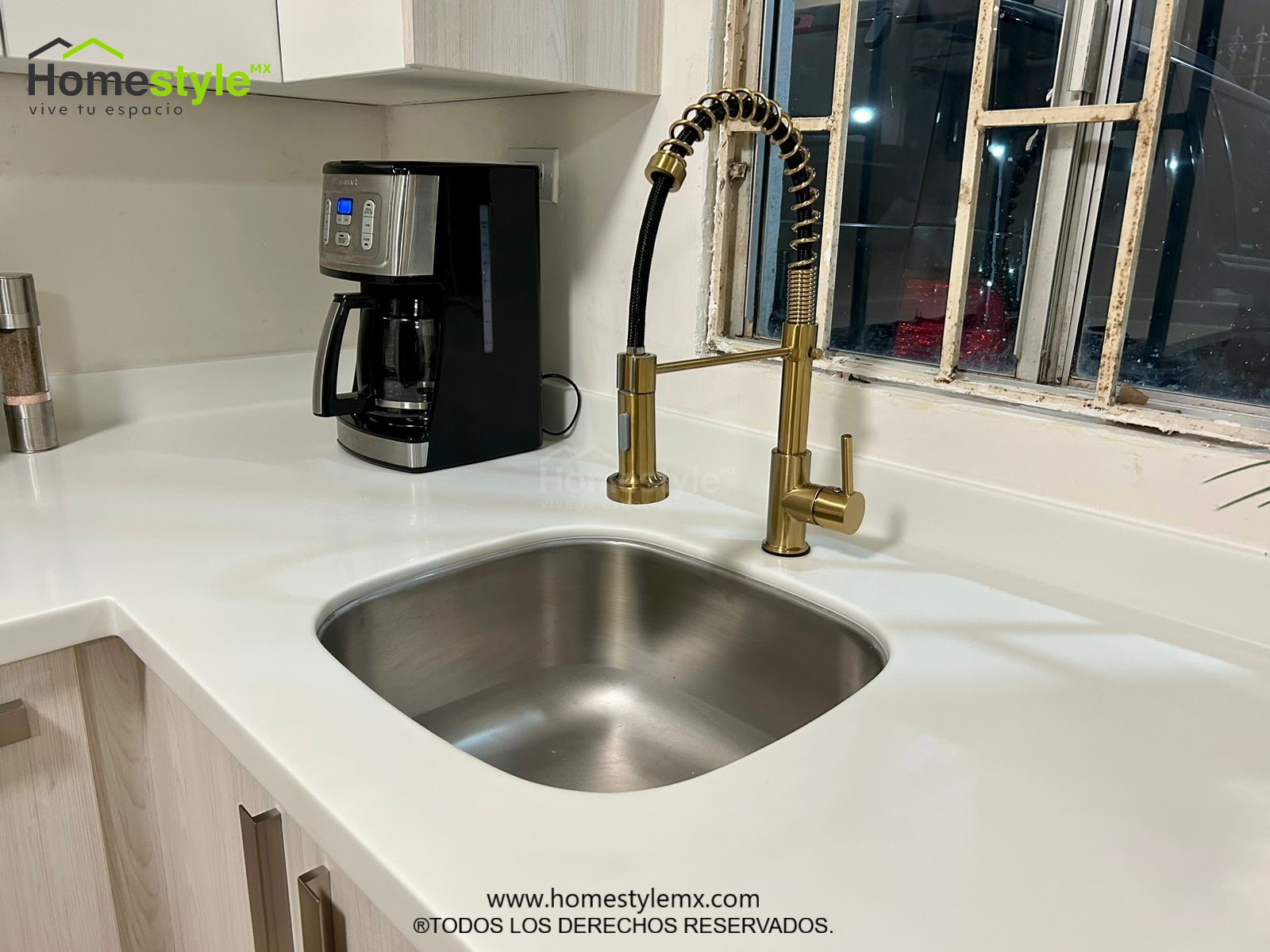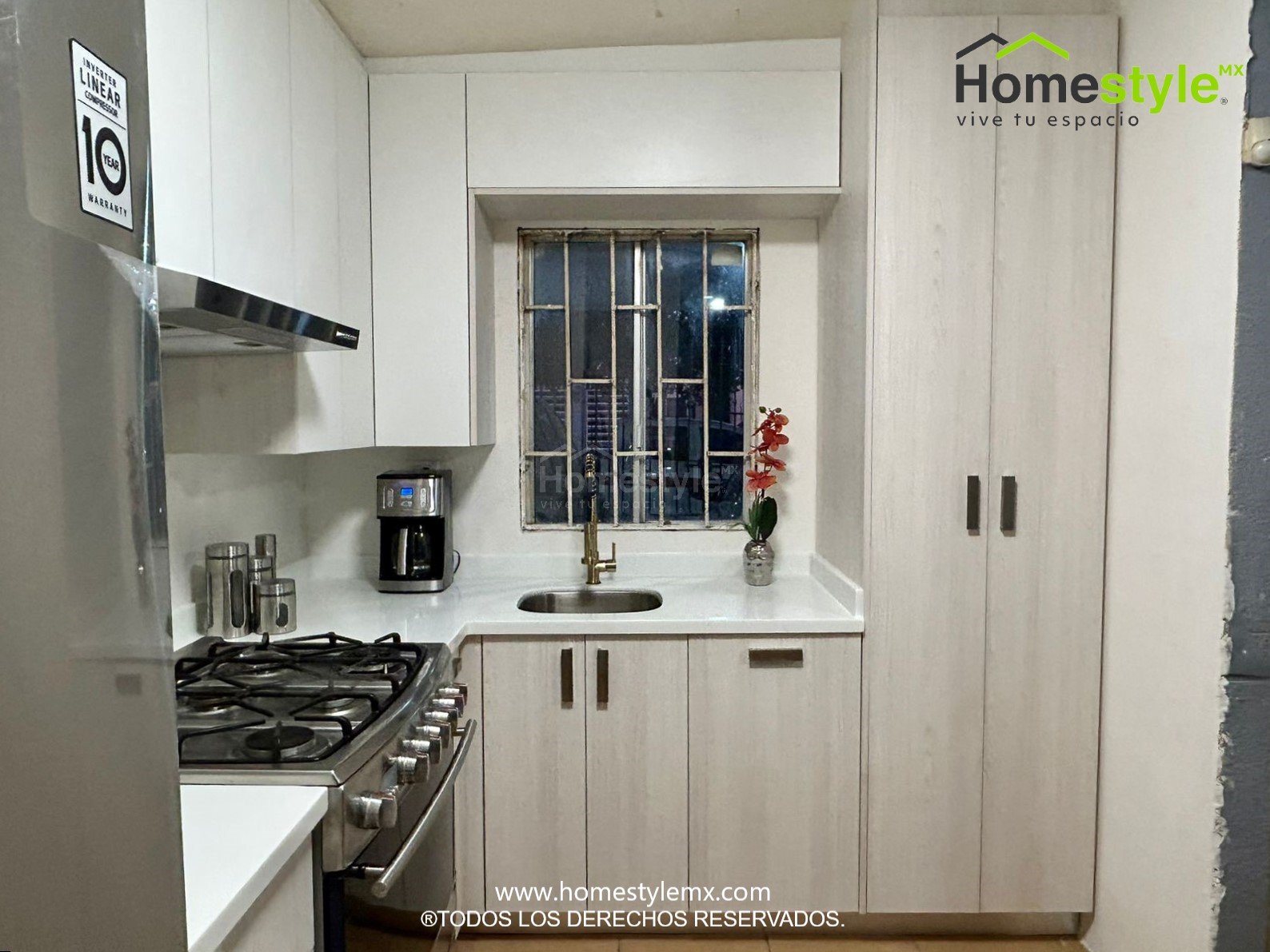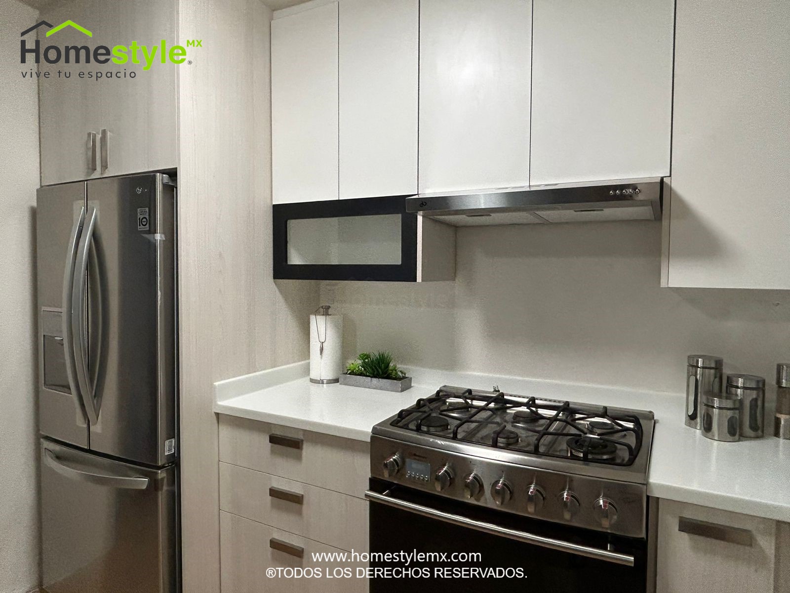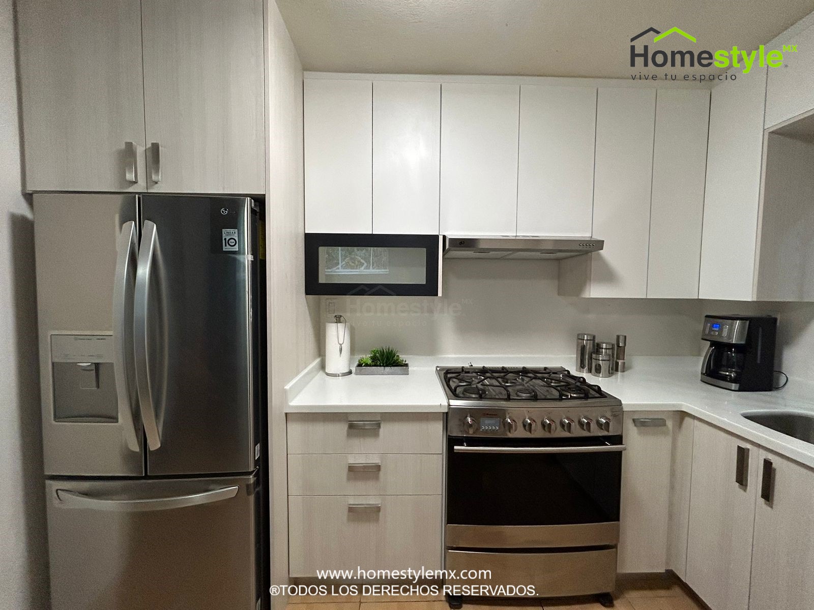 Cocina en forma de L. Diseñada en Melamina Vesto Teka Ártico para gabinetes inferiores, Melamina Blanca para gabinetería superior y detalle de Melamina Negra en puerta de apertura horizontal. Con una cubierta de Superficie Solida Wilsonart Frosty White.