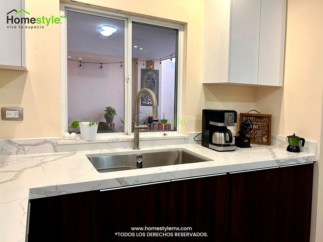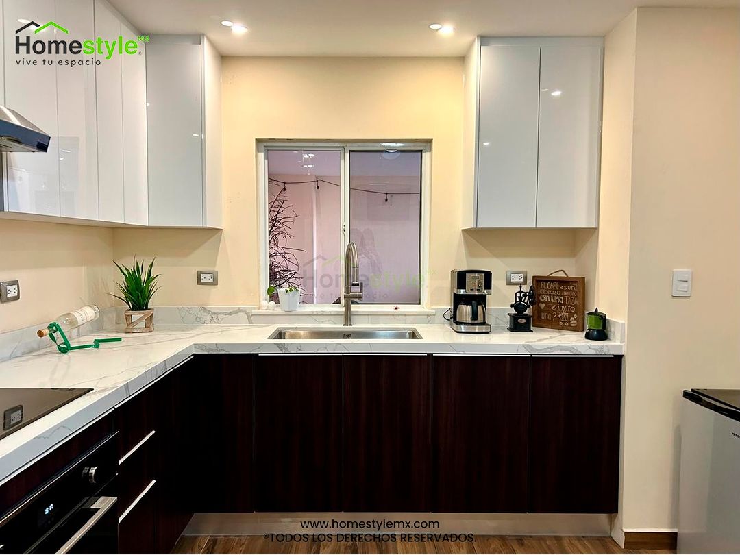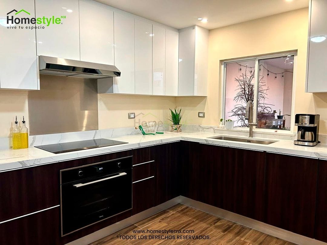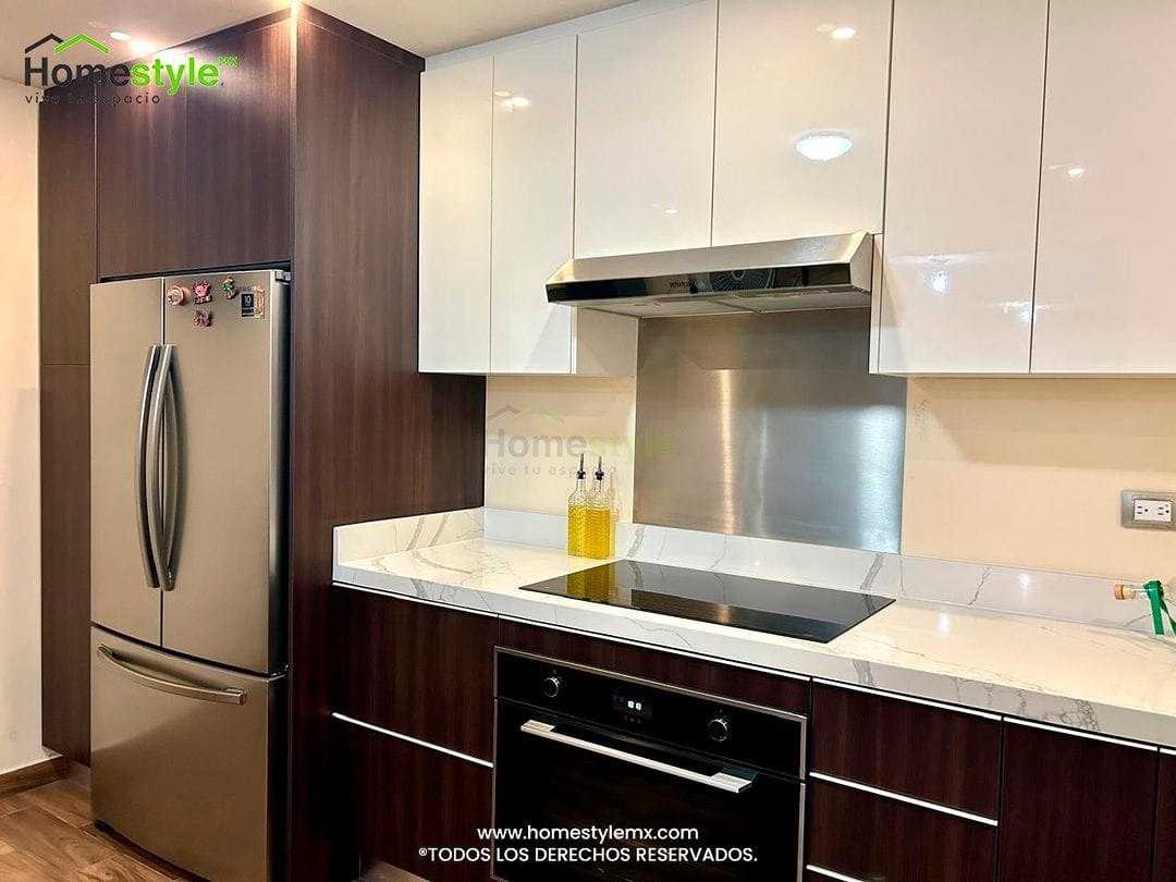 Cocina en forma de L. Diseñada en Melamina Roble Dakar para gabinetes inferiores y MDF Alto Birllo Blanco en gabinetes superiores. Jaladeras inferiores integrada tipo S y push to open en puertas superiores. Cuenta con una cubierta de Cuarzo Calacatta.