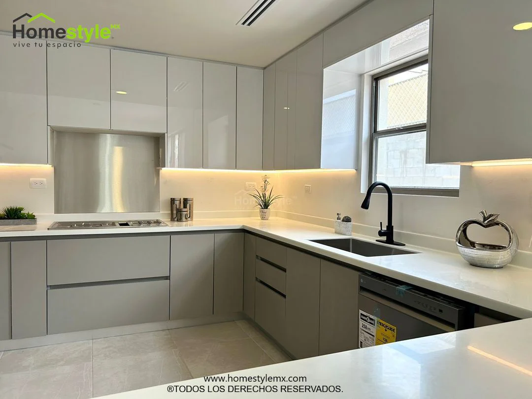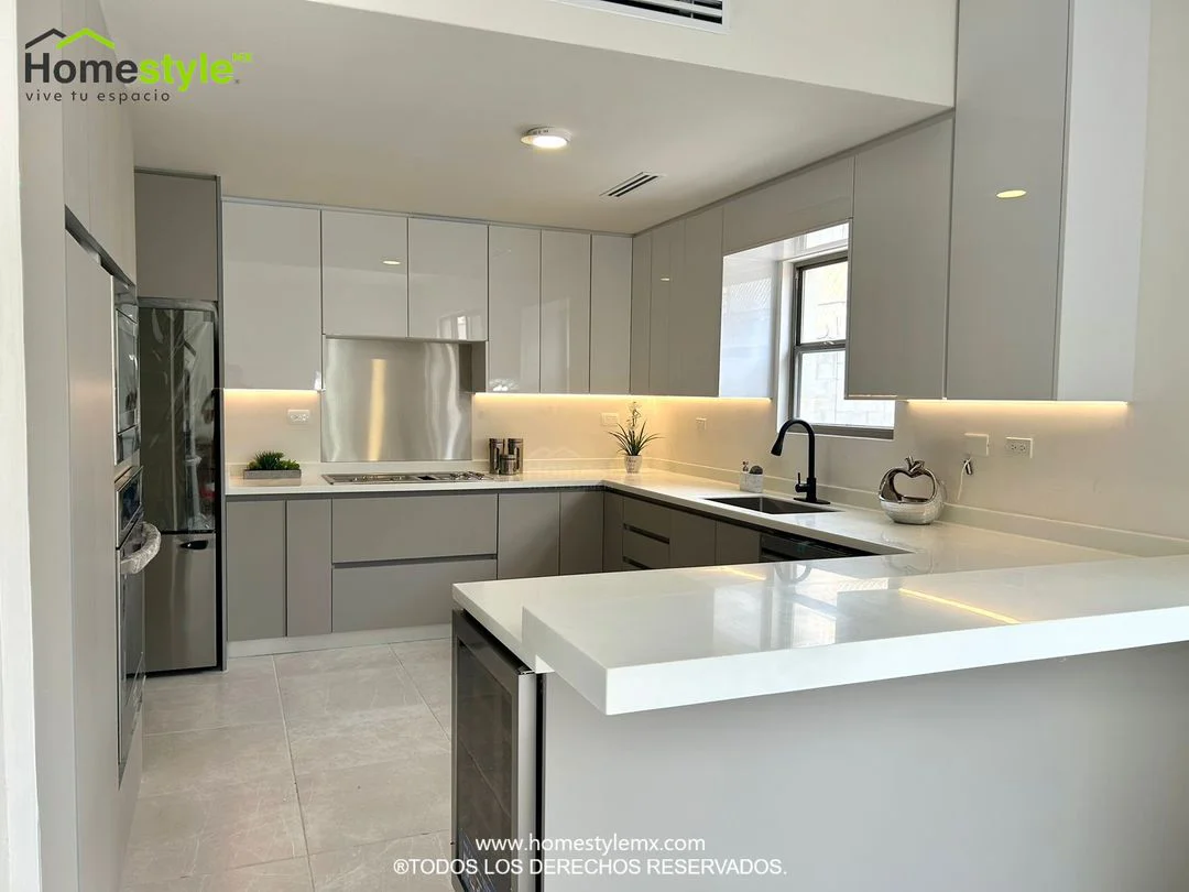 Cocina en forma de J con barra comedor para 3 personas. Diseñada en Melamina Gris para gabinetes inferiores y MDF Alto Brillo Luxe Blanco para gabinetería superior. Con una cubierta de Superficie Solida Frosty White.