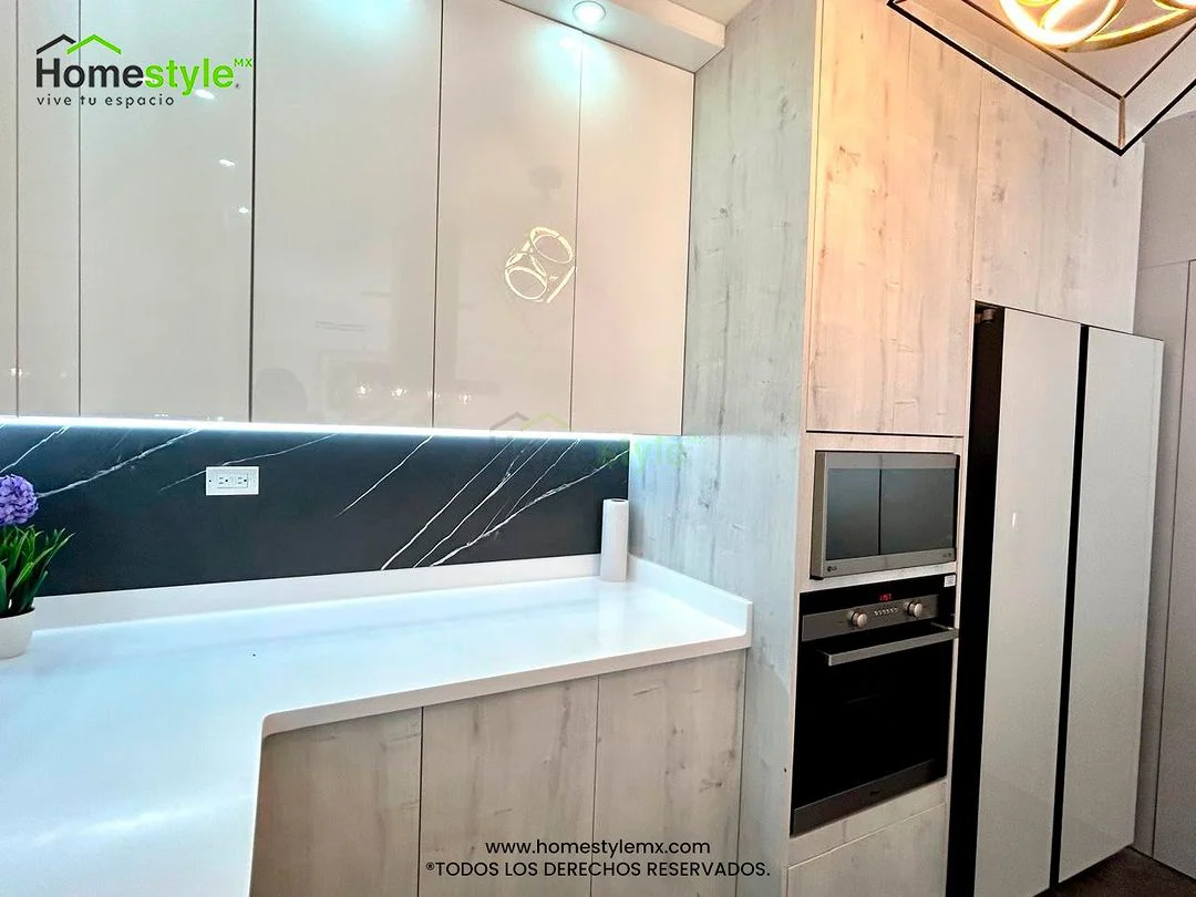 | Materiales | Melamina Alaska, MDF Alto Brillo Blanco, Melamina Gris Humo y Melamina Vizcaya Cubierta: Superficie Sólida Frosty White y Black Onyx Mirage |