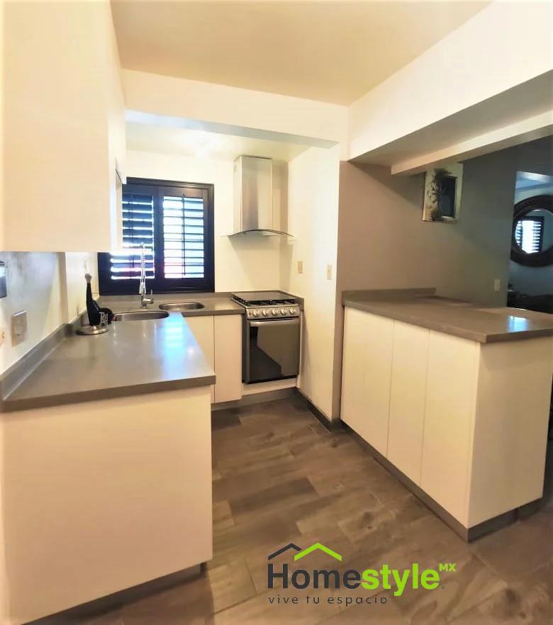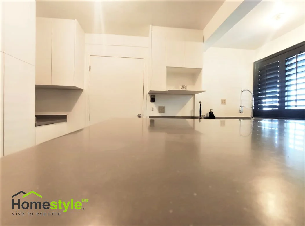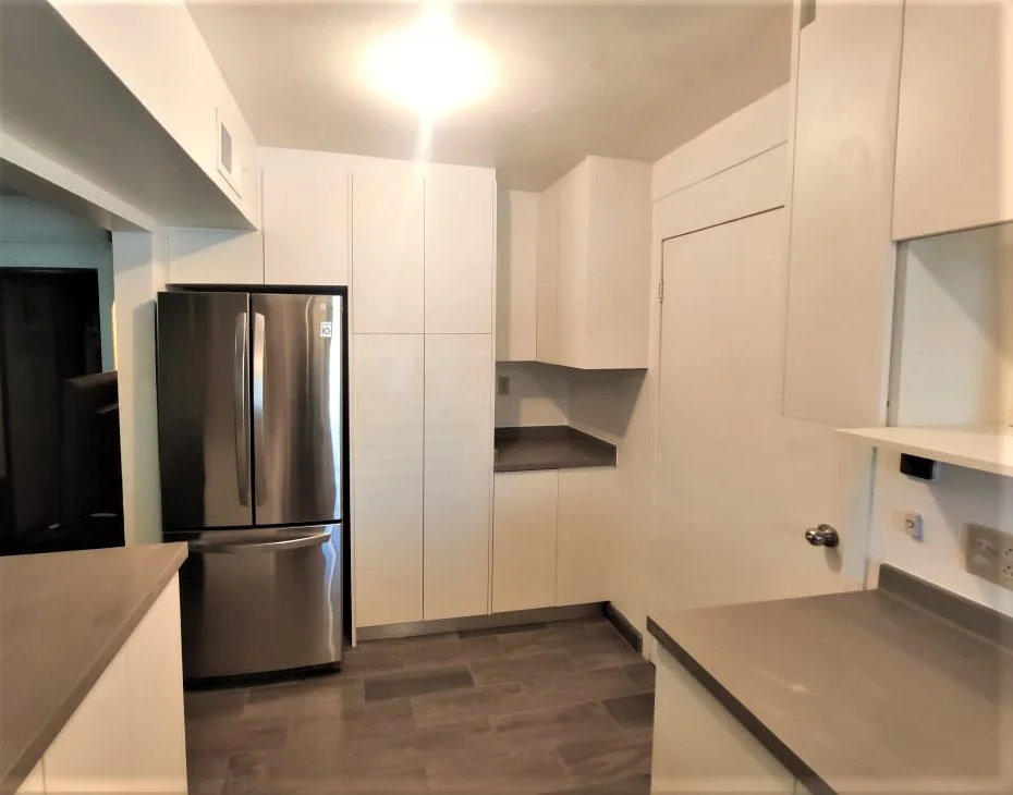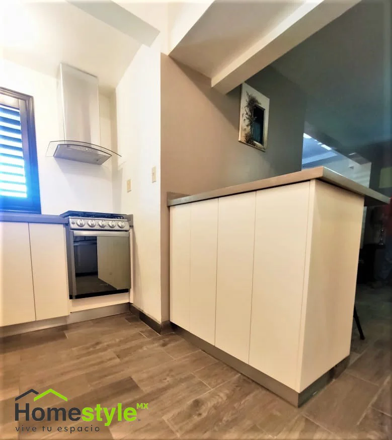 Cocina seccionada en L, barra y lineal para aprovechar de mejor manera el espacio. Diseñada en melamina vesto blanco mate para toda la gabineteria.