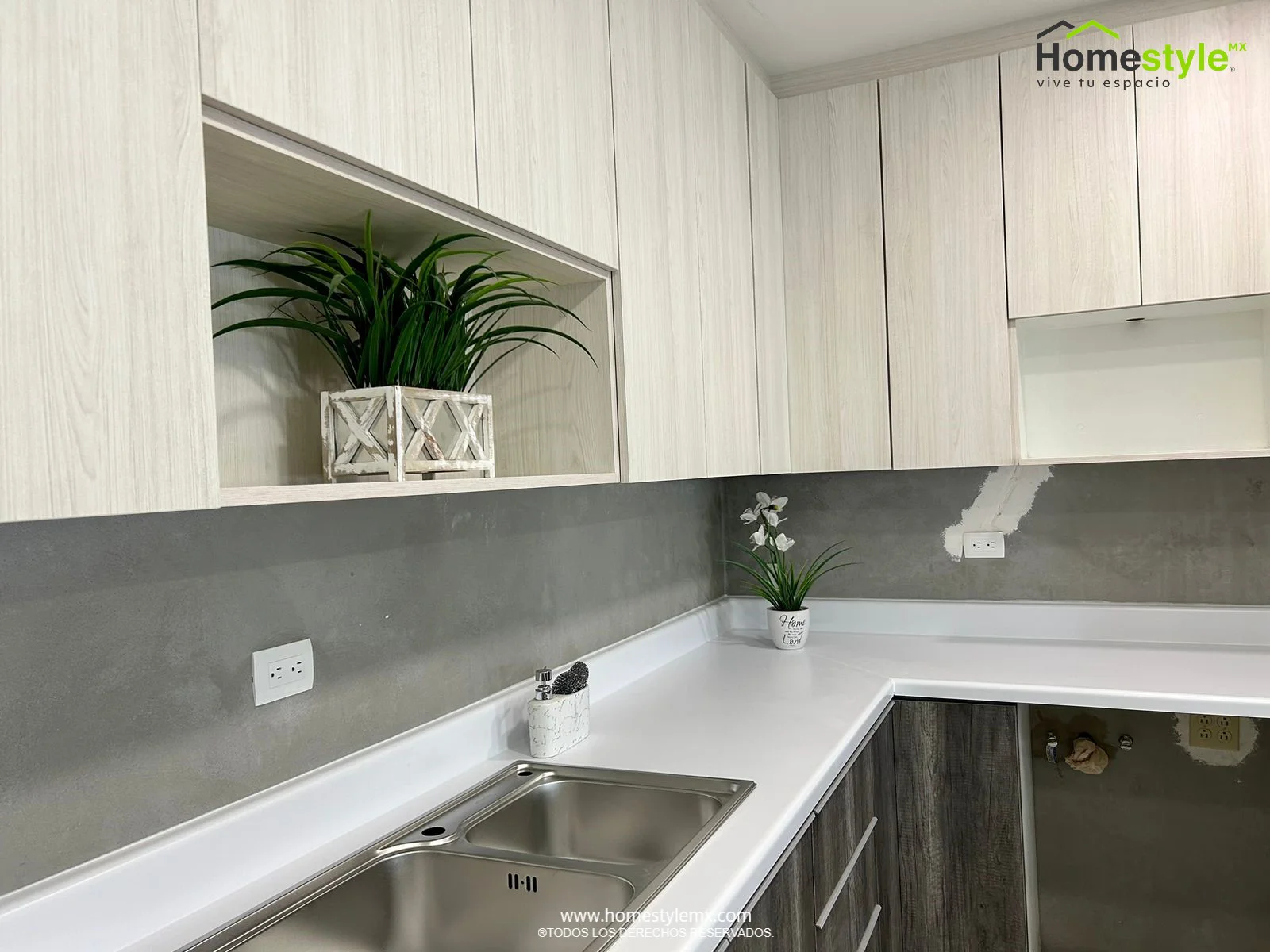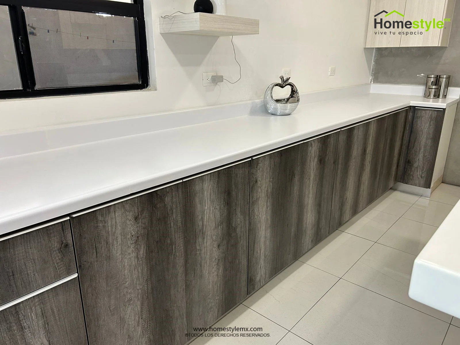 | Materiales | Melamina Vesto Lombardía y Melamina Vesto Teka Artico. Cubierta: Superficie Solida Wilsonart Frosty White. |