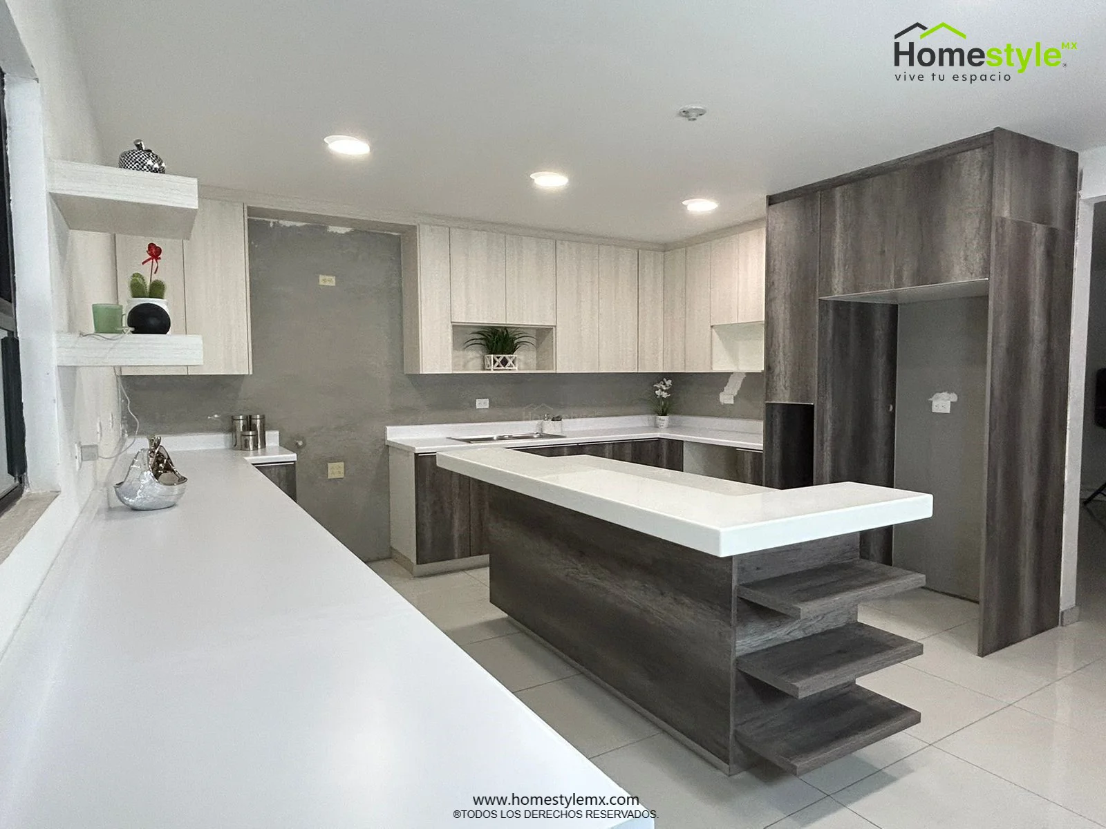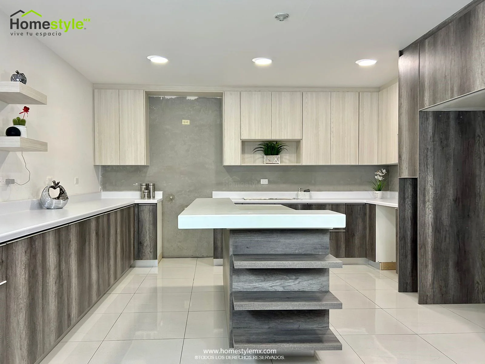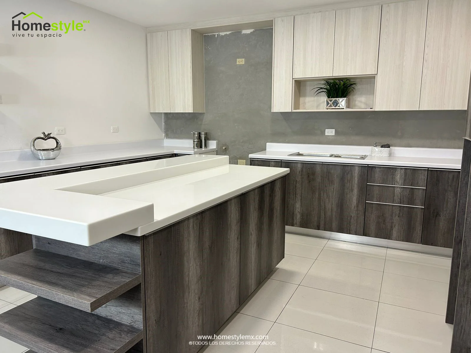 Cocina en forma de J con isla comedor. Diseñada en Melamina Vesto Lombardía para los gabinetes inferiores y Melamina Vesto Teka Artico para la gabinetería superior. Cubierta de Superficie Solida Wilsonart Frosty White.