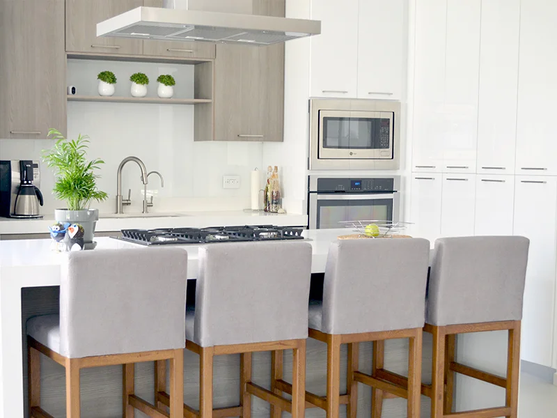 Cocina lineal con Isla y cascada, diseñada en melamina Vesto Cendra Escandinavo y alto brillo blanco. Parrilla empotrada con campana sobre isla.
