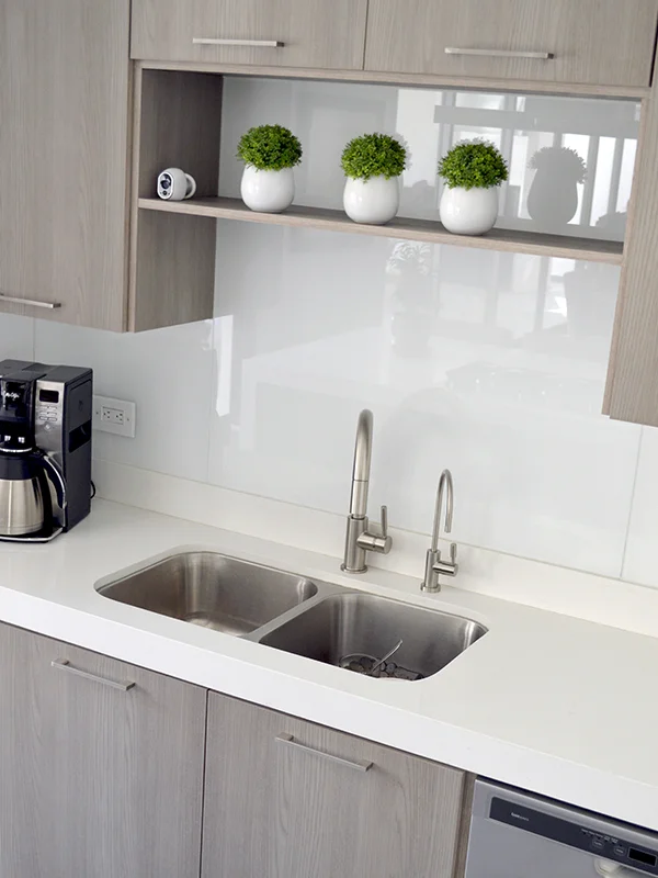 | Materiales | Melamina Vesto Cendra Escandinavo y alto brillo blanco. Cubierta: Corian Glacier White. |