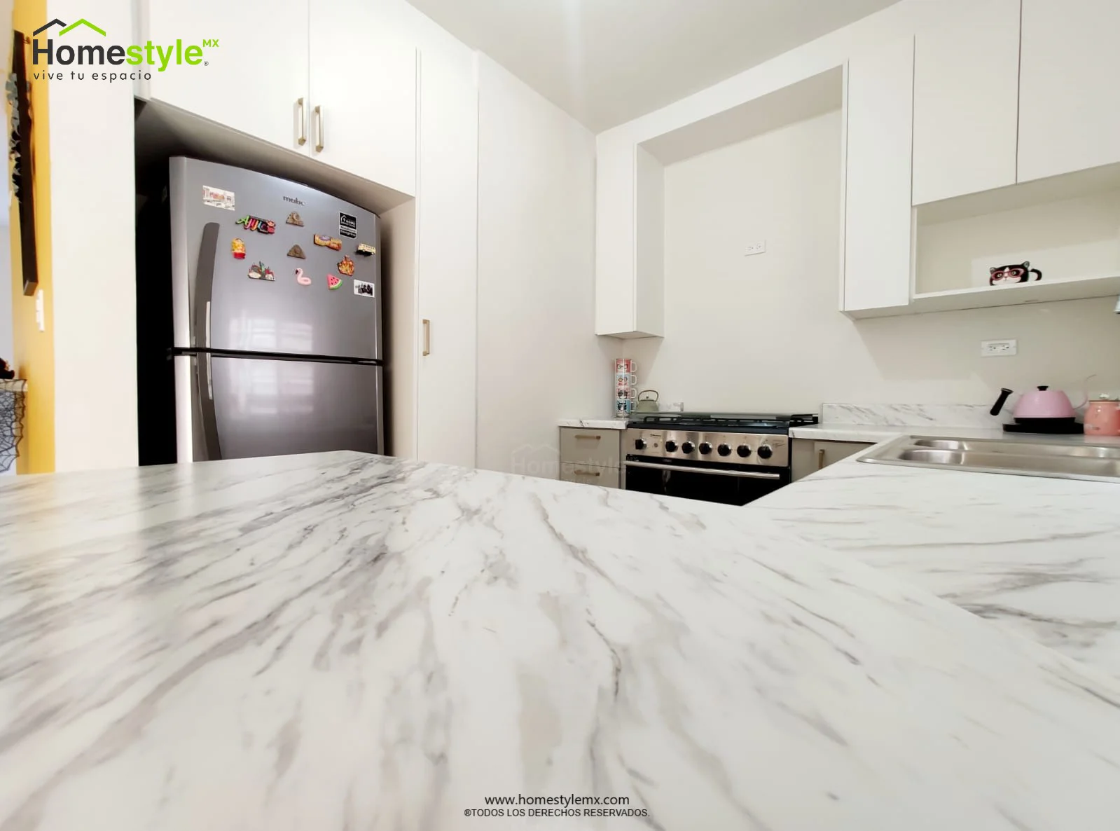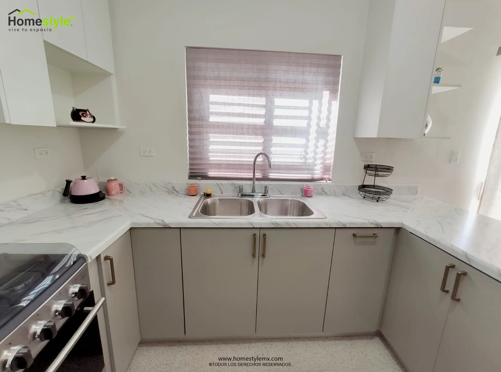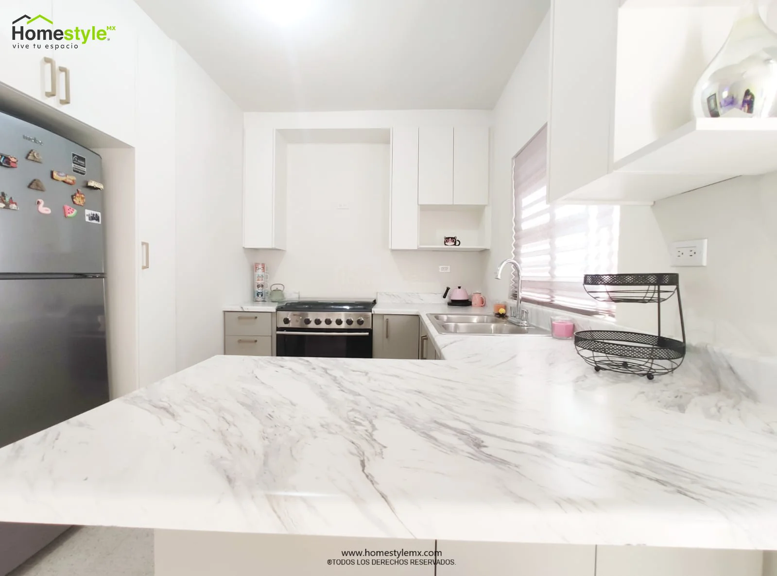 Cocina en forma de L con barra-comedor para 2 personas, diseñada en Melamina Bestboard gris humo para los gabinetes inferiores y Melamina blanco mate para gabinetes superiores. Cubierta de Formaica Calcutta Marble.