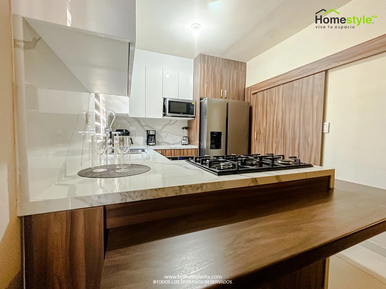 Cocina en forma de L con barra-comedor y cascada. Diseñada en melamina Nogal Terracota para gabinetería inferior y MDF Alto Brillo Blanco para gabinetería superior. Cubierta y Backsplash de Cuarzo Corian Calacatta Natura.