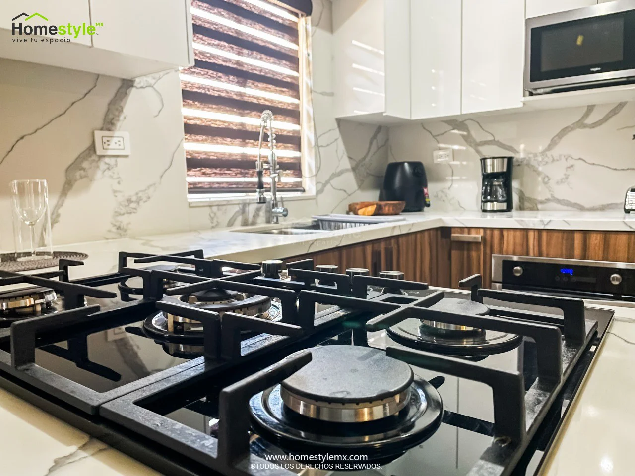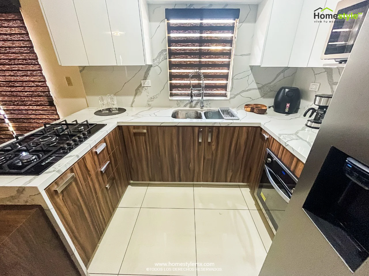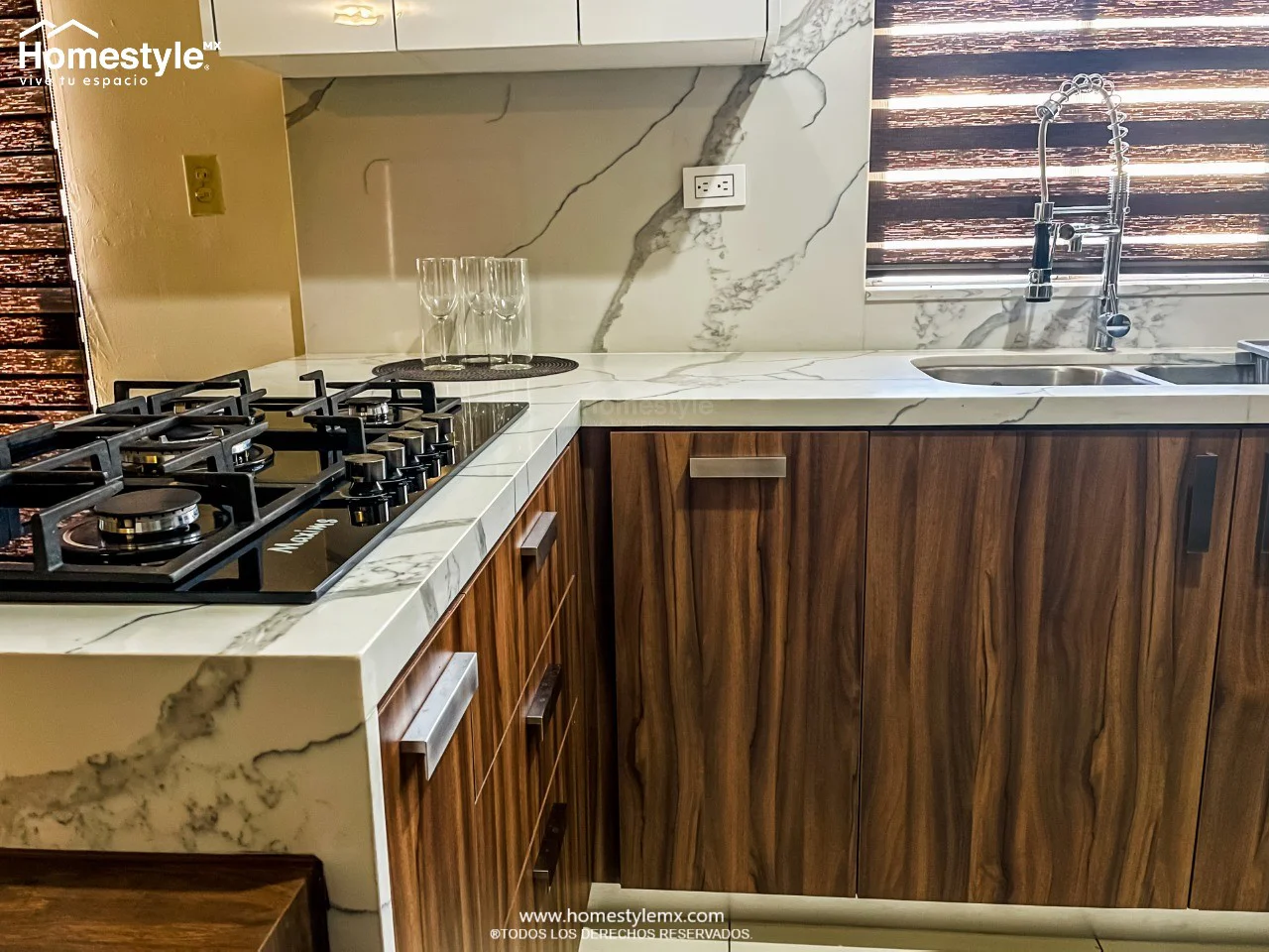 | Materiales | Melamina Nogal Terracota y MDF Alto Brillo Blanco. Cubierta: Cuarzo Corian Calacatta Natura. |