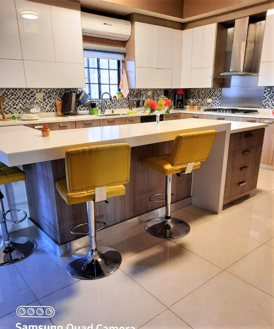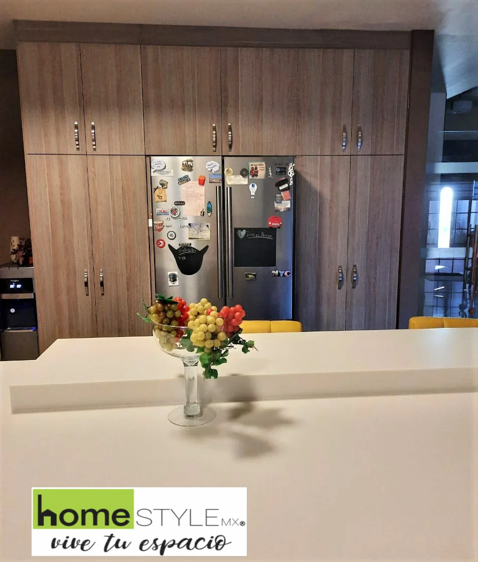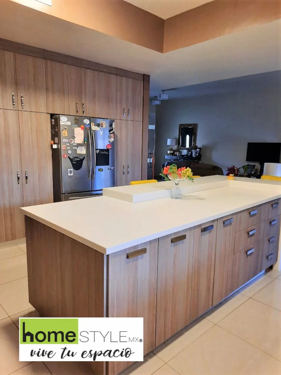 Cocina en forma de L, isla-comedor para 5 personas con doble cascada. Diseñada en melamina Vesto Cendra Escandinavo y MDF alto brillo blanco.