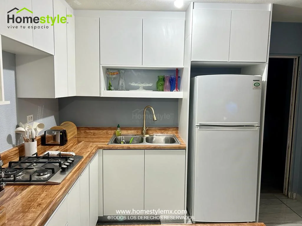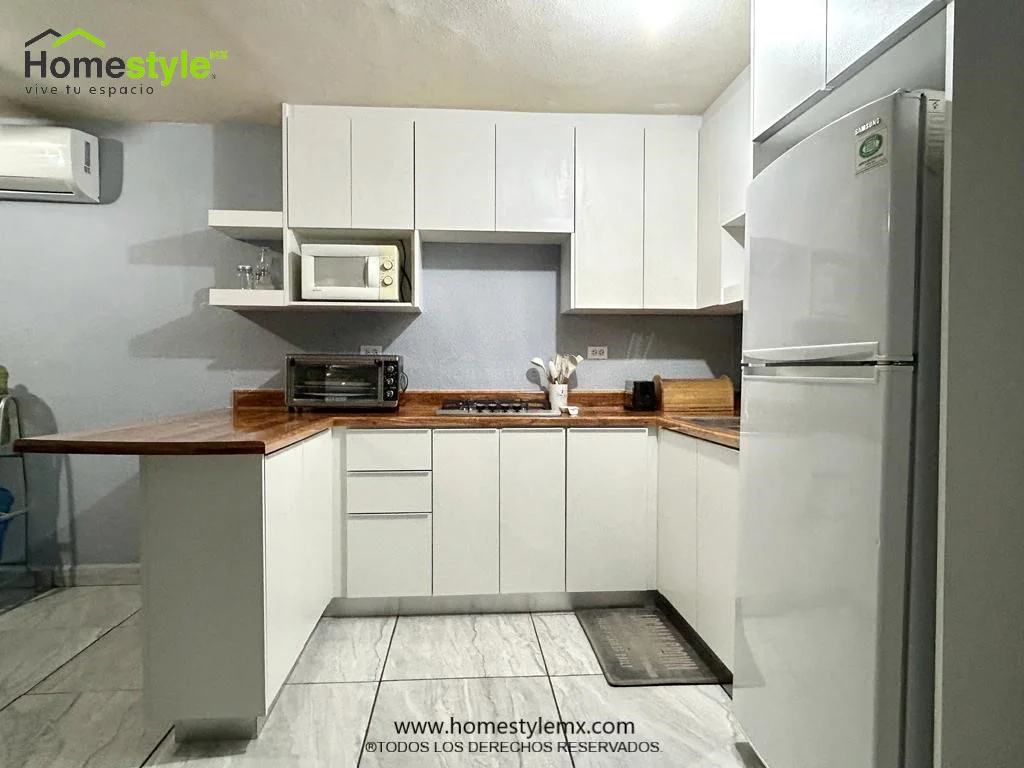 Cocina en forma de J con barra comedor. Diseñada en Melamina Blanca para toda la gabinetería. Con una cubierta de Formaica Nogal Parma.