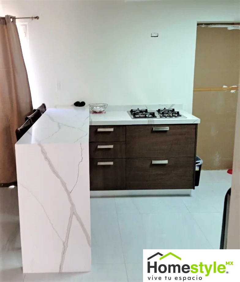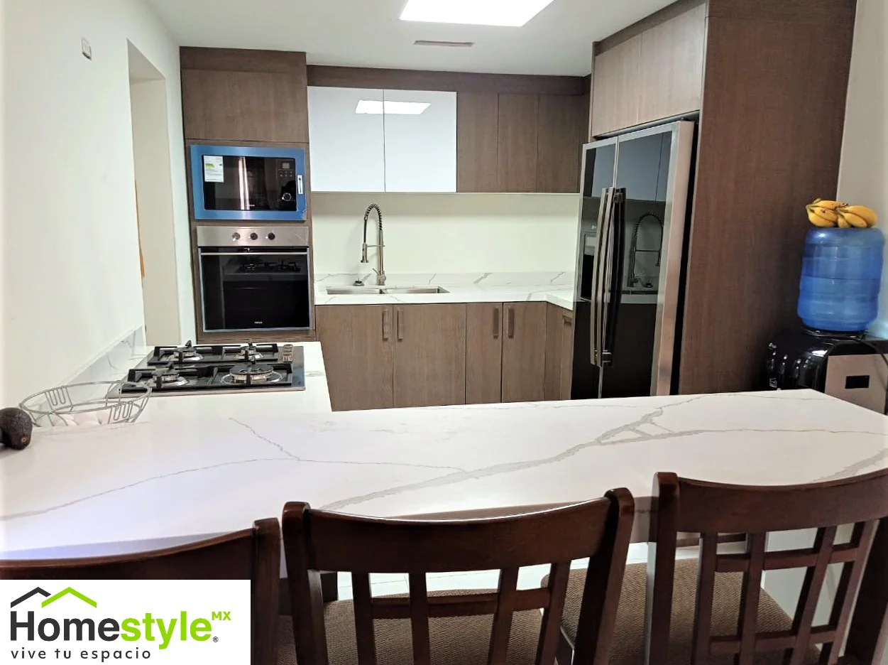 Barra en forma de L para comedor y parrilla, cubierta de cuarzo con cascada para un dar un toque de elegancia y detalles en accesorios de acero inoxidable.