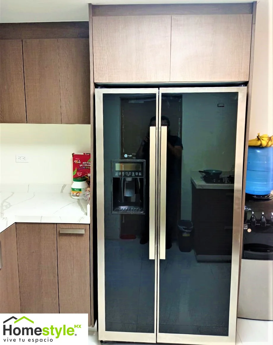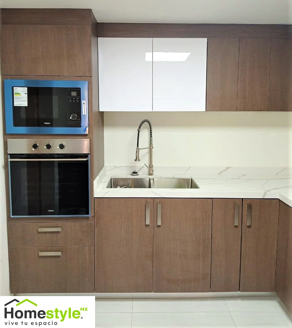 Melamina Cendra Escandinavo y MDF alto brillo blanco. Cubierta: Cuarzo Calacatta Siena.