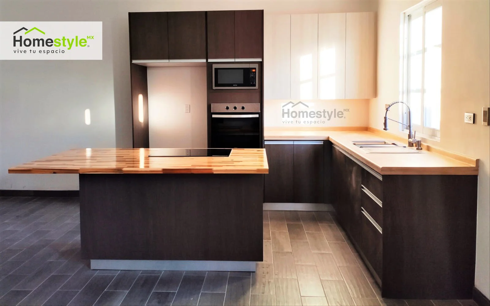 Cocina en forma de L con isla-comedor. Diseñada en melamina Vesto Roble Dakar para gabinetes inferiores y melamina Vesto Teka Artico para los gabinetes superiores.